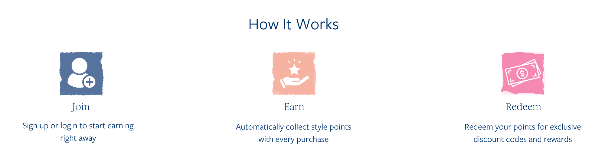 You can sign up for our Style Point rewards club by clicking the blue "rewards" button at the bottom left of your screen or you can click here: Style Points Rewards Account