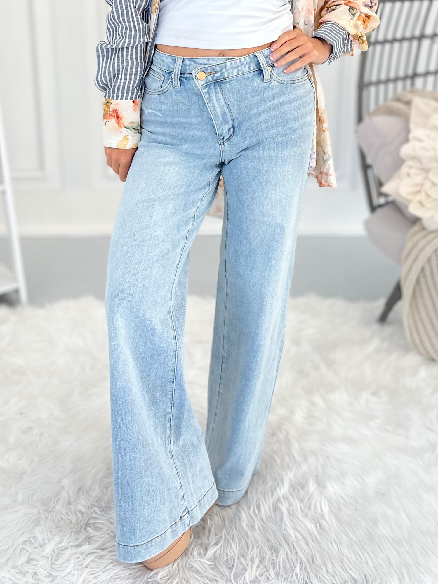 Retro wide legs are a must from Judy Blue and we're loving this vintage fit with a fresh and updated wash! The criss cross waistband adds a trendy twist and major slimming effect, while the soft stretch denim keeps things comfy all day. Dress them up with heels and a blazer or keep it casual with a graphic tee and sneakers—either way, they’re a total vibe.
