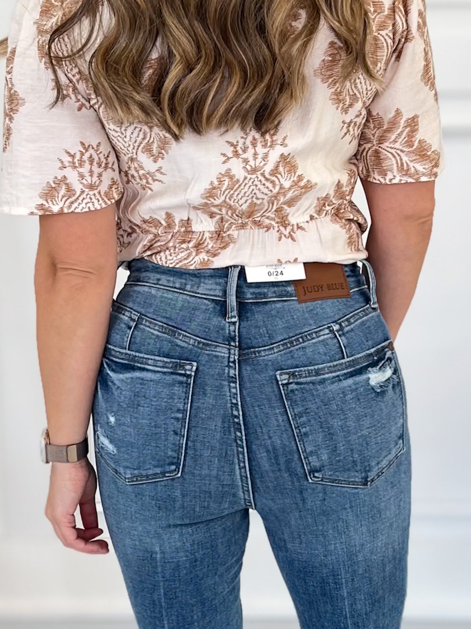 To get your perfect fit, first, let's find your true Judy Blue size. This will be your starting point for all Judy Blue jeans. This brand is generously cut, so you'll find your true Judy Blue size by taking your even, department store pant size and subtracting a number. Once you have determined your true Judy Blue size, then take a peek at the product description of each pair of jeans to see how we recommend sizing! This part is super important - they all fit and stretch a bit different! Lastly - don’t forget to check the item details to see the inseam, rise and fabric for each pair of jeans! Remember that rise is body type dependent (so a high-rise on a short torso may be a mid-rise on a long torso) and we all have multiple inseam preferences depending on the style of jeans we are shopping for!