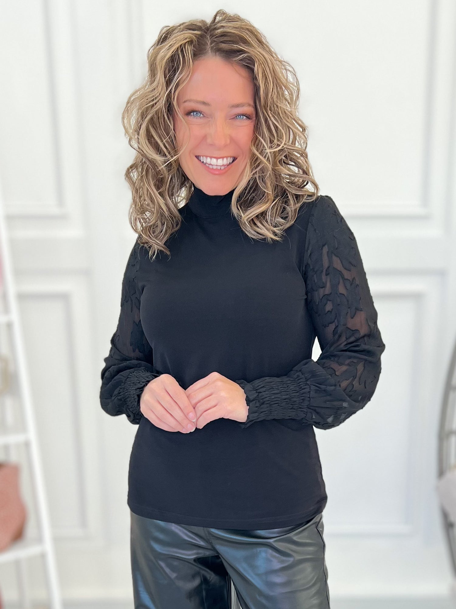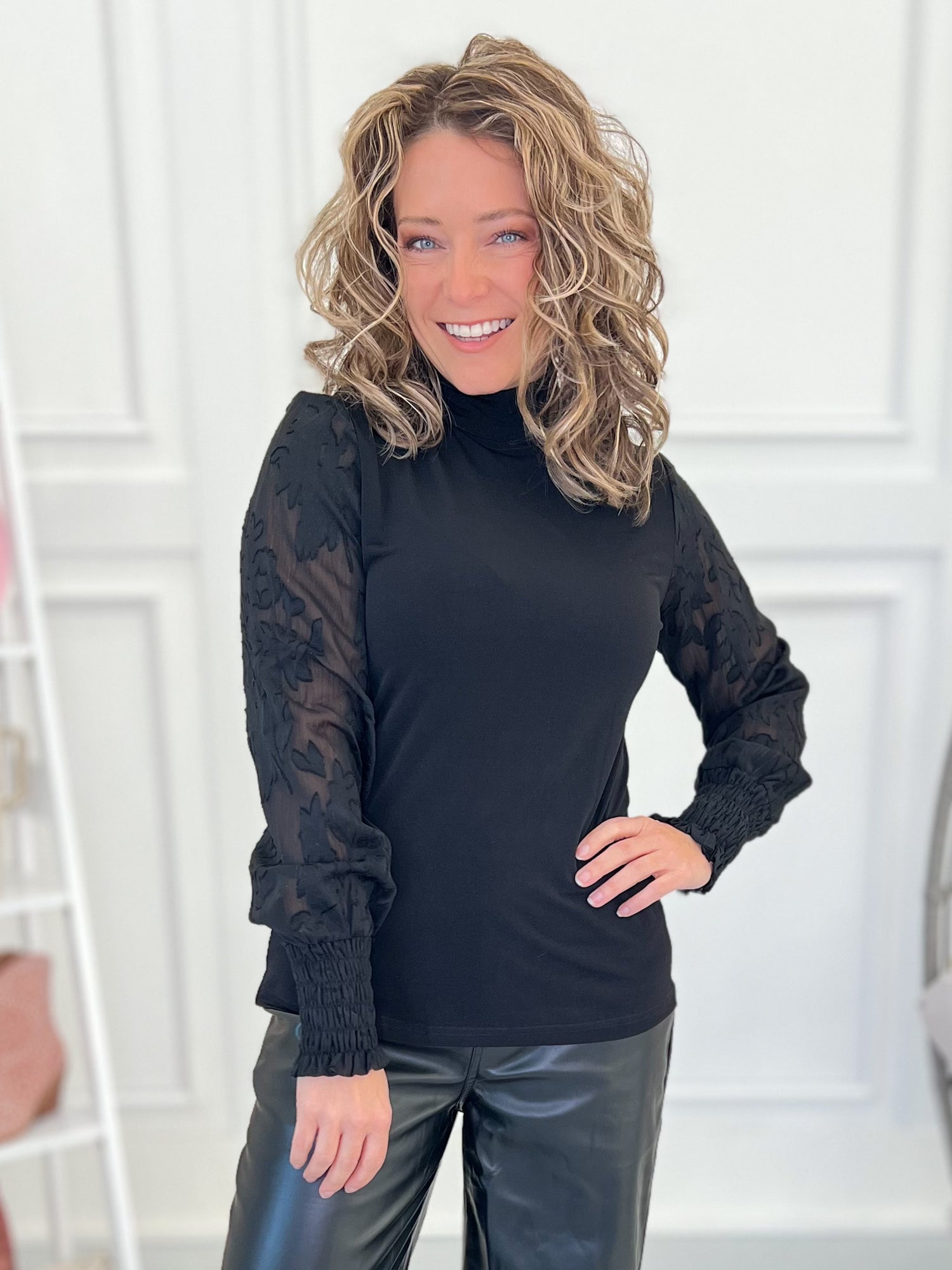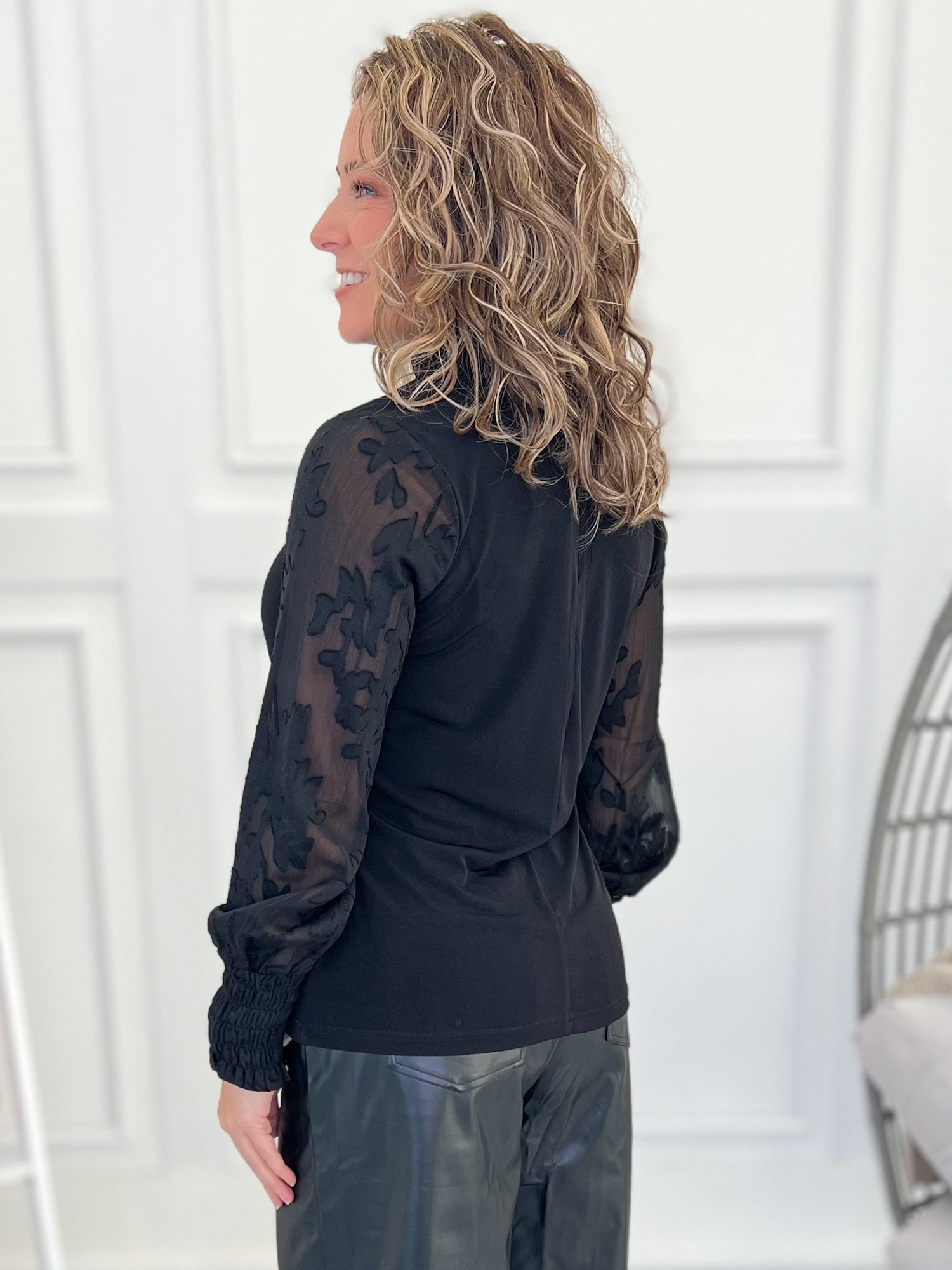 This chic black top brings all the elegance with its sheer floral sleeves and subtle sparkle, making it an instant night-out favorite. Style it with faux leather pants, denim, or a sleek skirt for a look that’s classy, cool, and effortlessly elevated.
