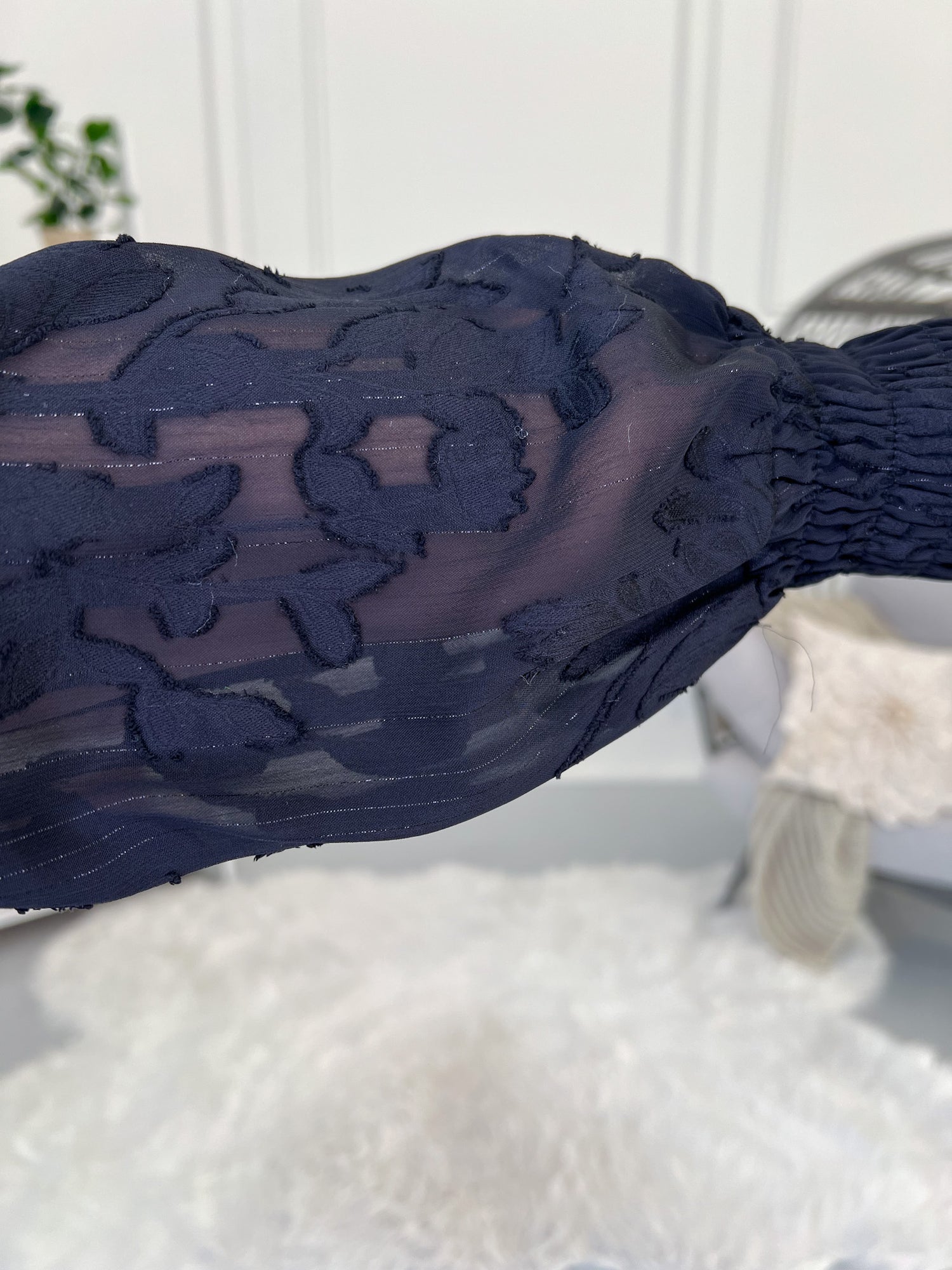 • Sheer Floral Sleeves: Velvet-embossed detail with a hint of shimmer.