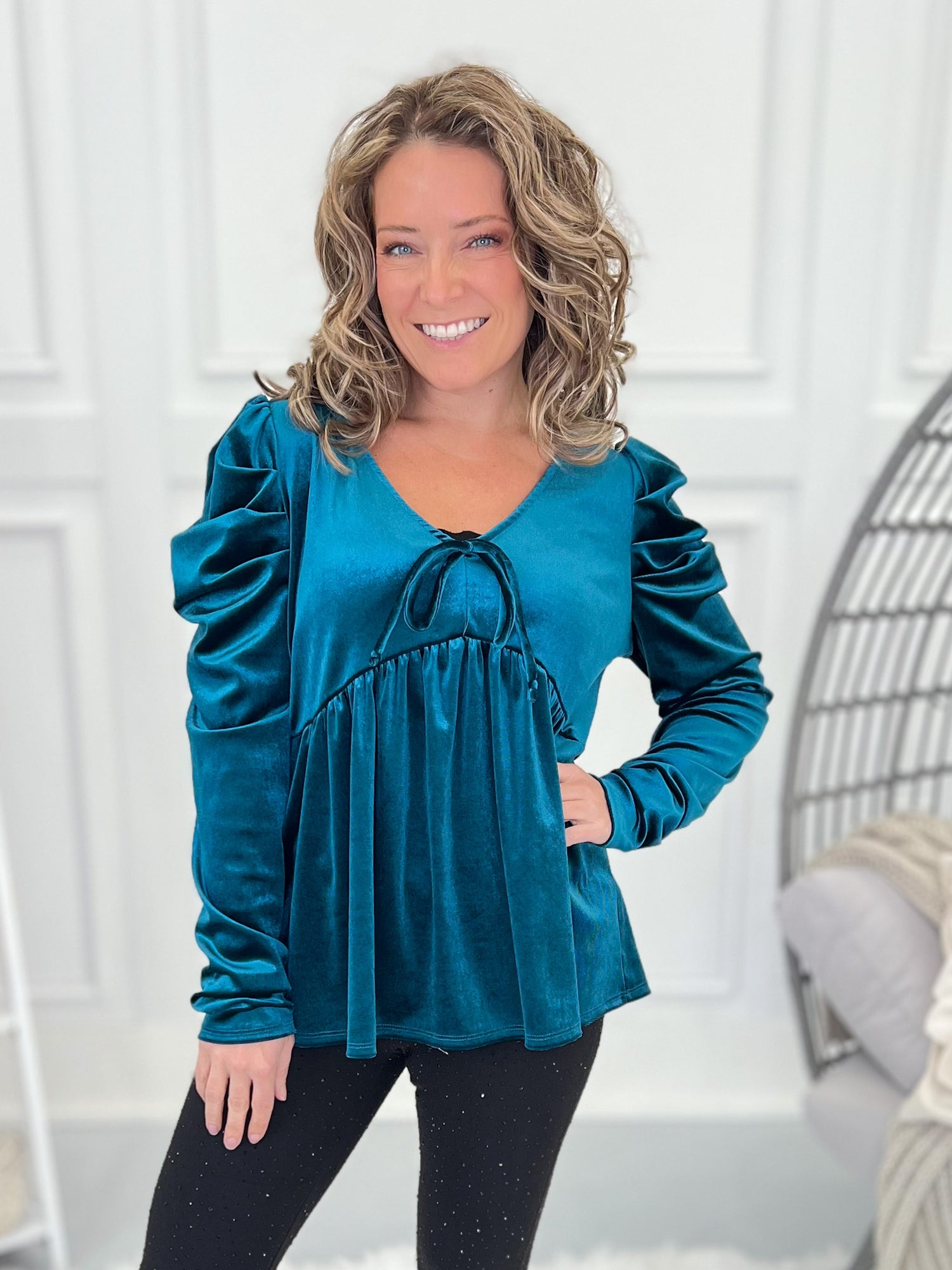 This teal velvet top brings just the right amount of shine and sophistication. Made from ultra-soft, stretchy crushed velvet, it drapes beautifully with a babydoll silhouette and gathered sleeves. The tie neckline and back seam add the prettiest finishing touch—plus, it’s smooth underneath for a zero-itch feel.