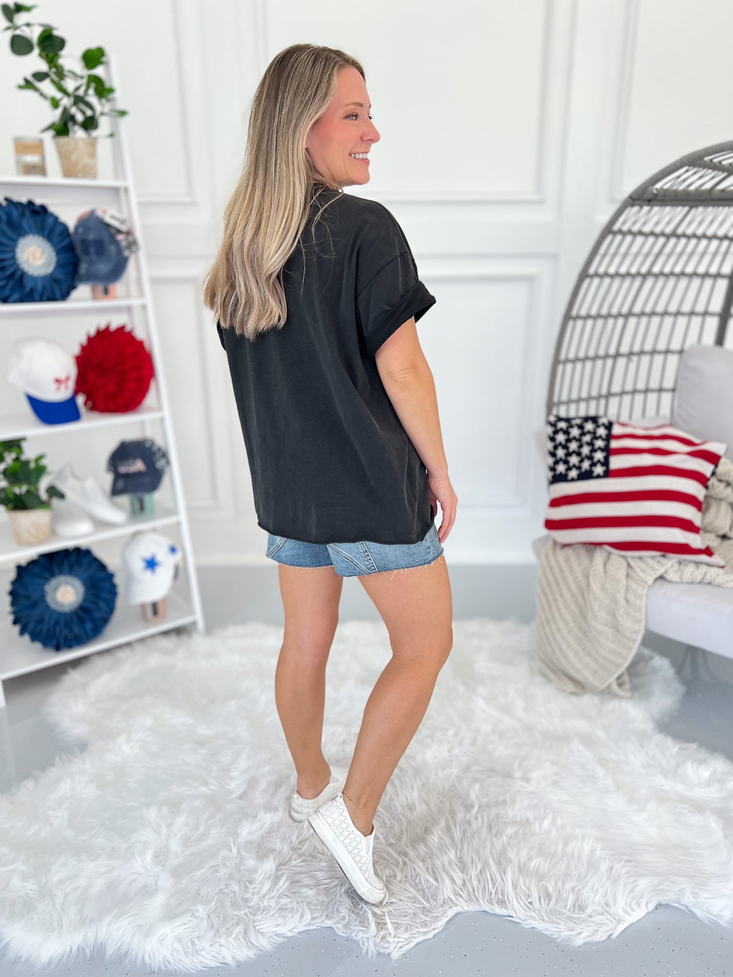 A bold throwback with major vintage vibes. This washed black graphic tee gives off that all-American, worn-in feel with its distressed screen print and bouncy, stretchy fabric. Style it with denim shorts, sneakers, or even layer it under a flannel for a nostalgic look that still hits modern cool.