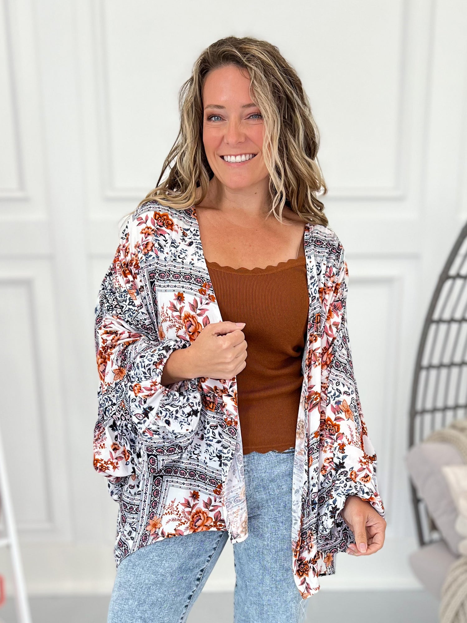 Flowy, lightweight, and full of personality—this cardigan brings boho vibes with a modern twist. The kimono sleeves feature gathered ruching for a feminine drape, while the autumn-toned print makes it a statement layer you'll wear again and again. Toss it over a tank and denim for casual days, or dress it up with a sleek cami and jewelry for a night out.