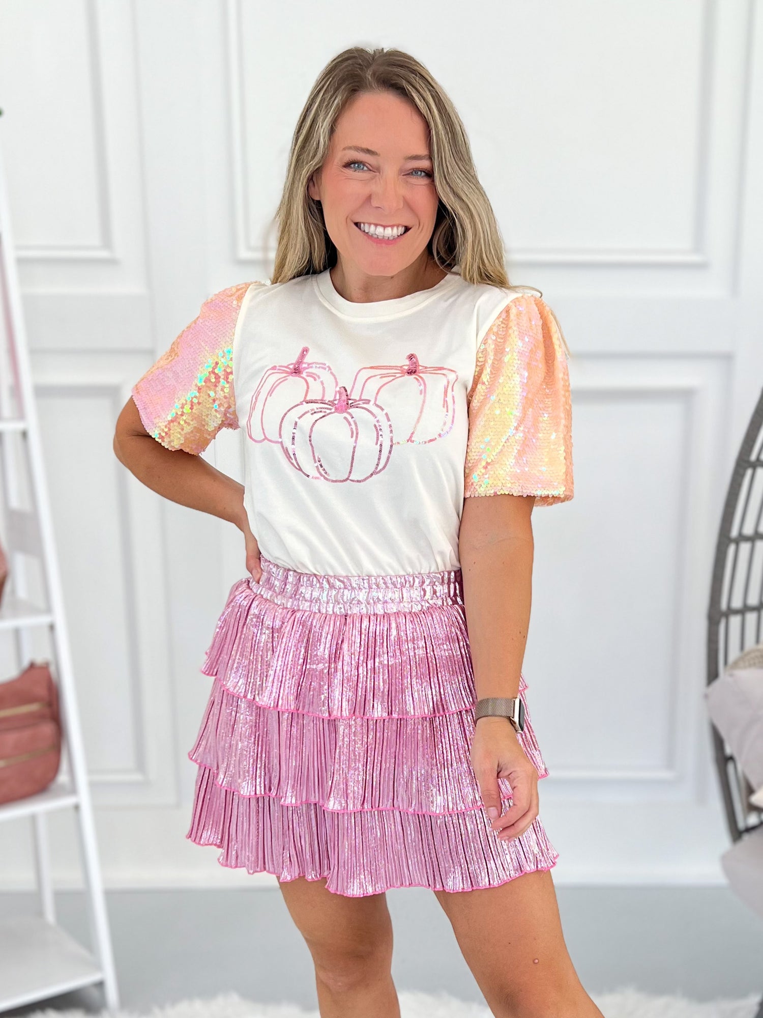 Add a little sparkle to your pumpkin season with this glam graphic tee. Featuring iridescent sequin sleeves and a pink sequin pumpkin design, it’s the perfect blend of casual comfort and festive flair. Dress it up with a flirty skirt or keep it casual with jeans—either way, this tee makes pumpkin season shine a little brighter!