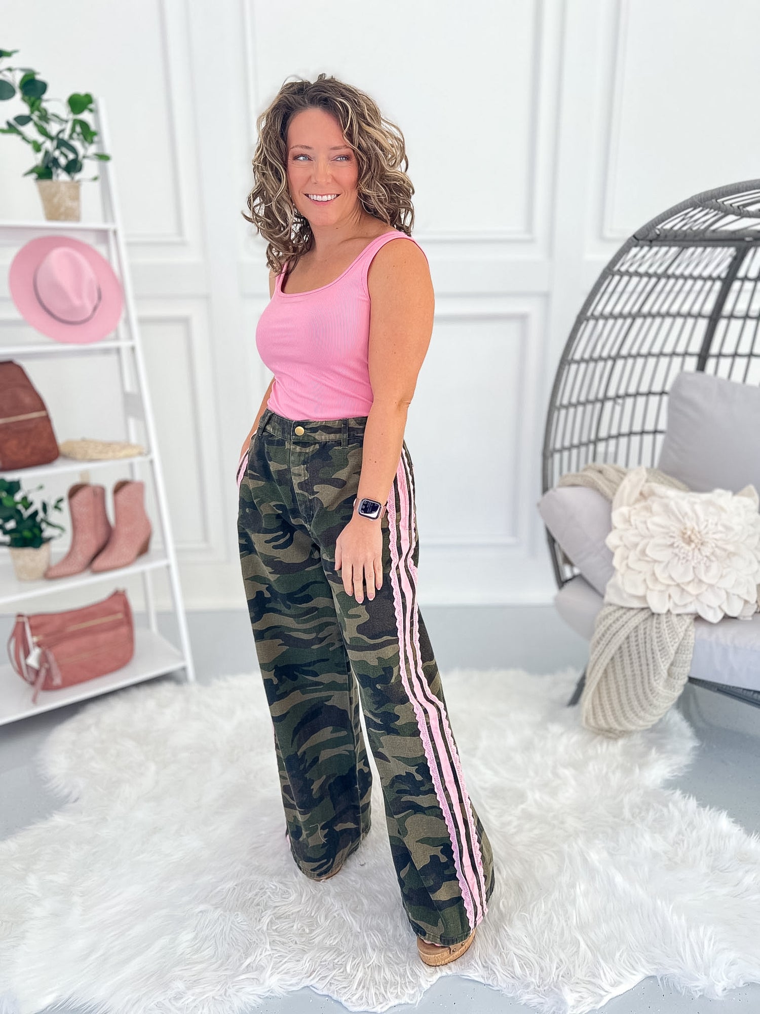 These camo wide leg pants bring a fun, on-trend twist to classic utility style with feminine pink crochet stripe details. Soft denim with a relaxed, flowy fit makes them an easy statement piece for casual everyday outfits.