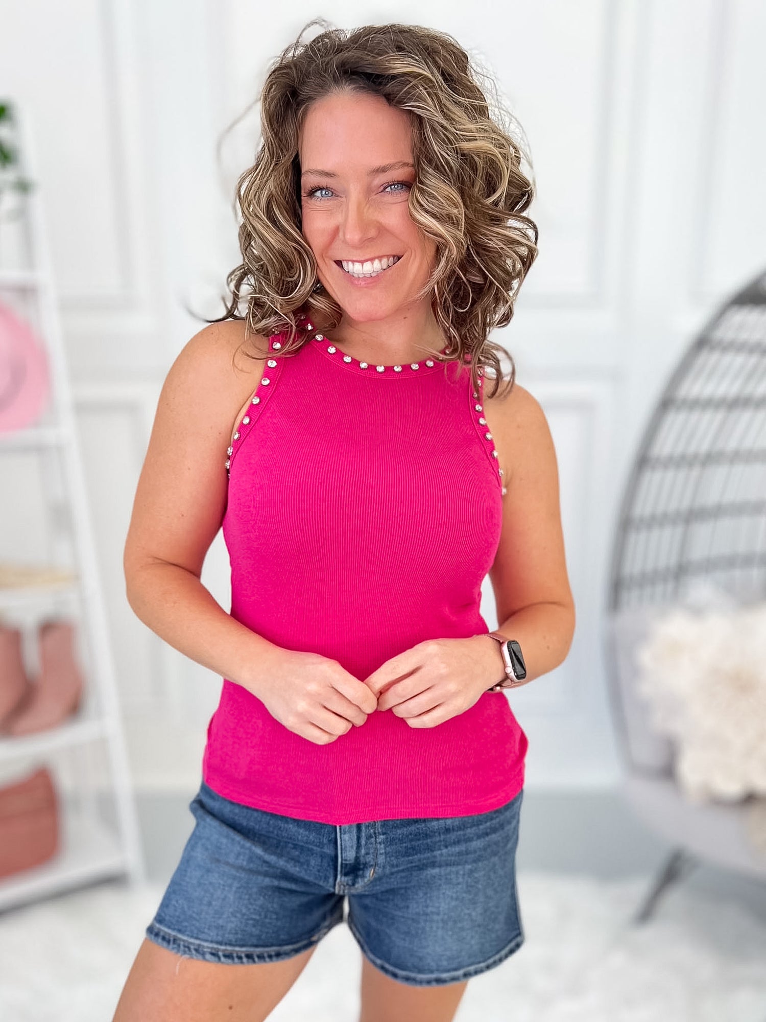 Hot pink ribbed tank with rhinestone studs, soft stretchy fabric, wide straps, lightweight, non sheer summer layering top.