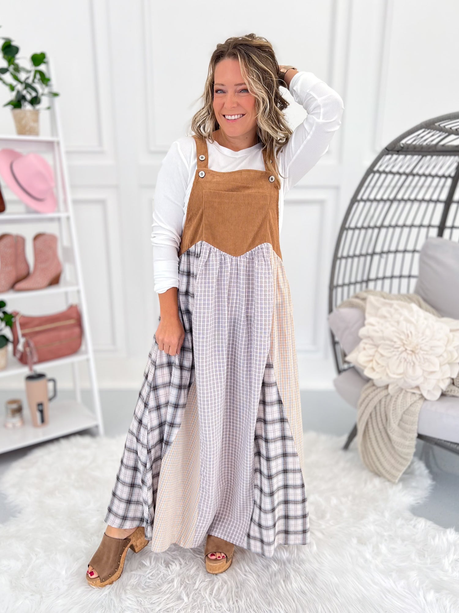 This overall dress is a total fall vibe with its corduroy bodice and mix of plaid panels that make it effortlessly unique. Light, flowy, and comfy, it’s perfect for layering with a fitted tee, mesh top, or a cozy turtleneck—just add boots or sneakers and you’re set.