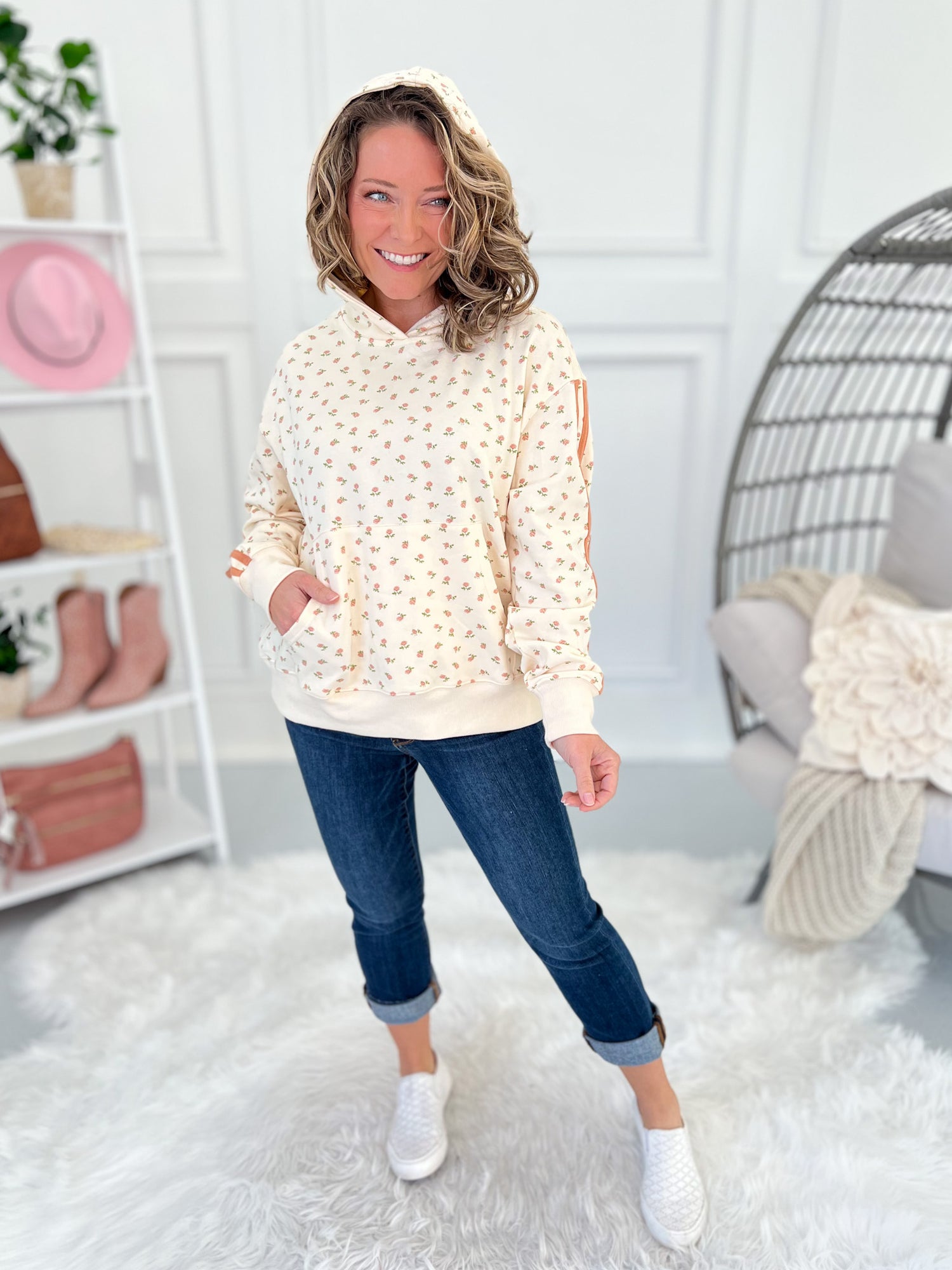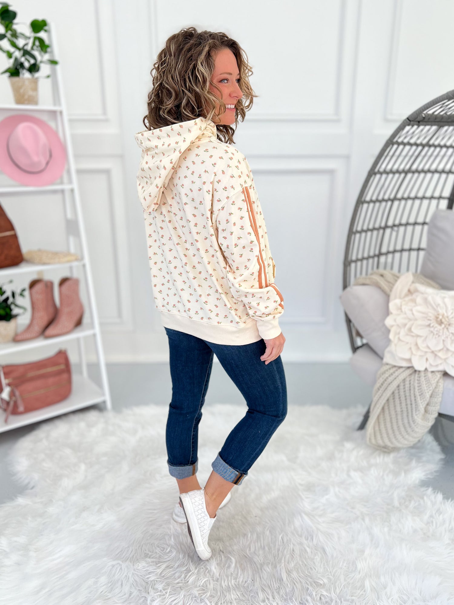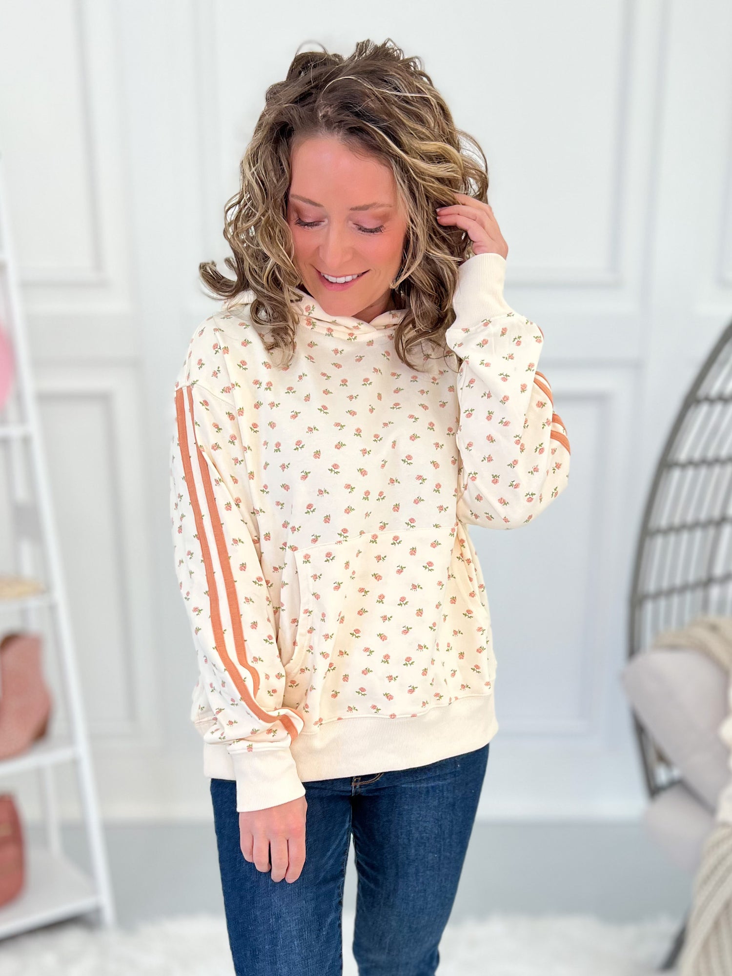 This hoodie is the perfect mix of sweet and sporty. The dainty blush floral print on an ivory background paired with varsity striped sleeves gives it that unexpected boutique twist while still keeping it cozy and wearable.