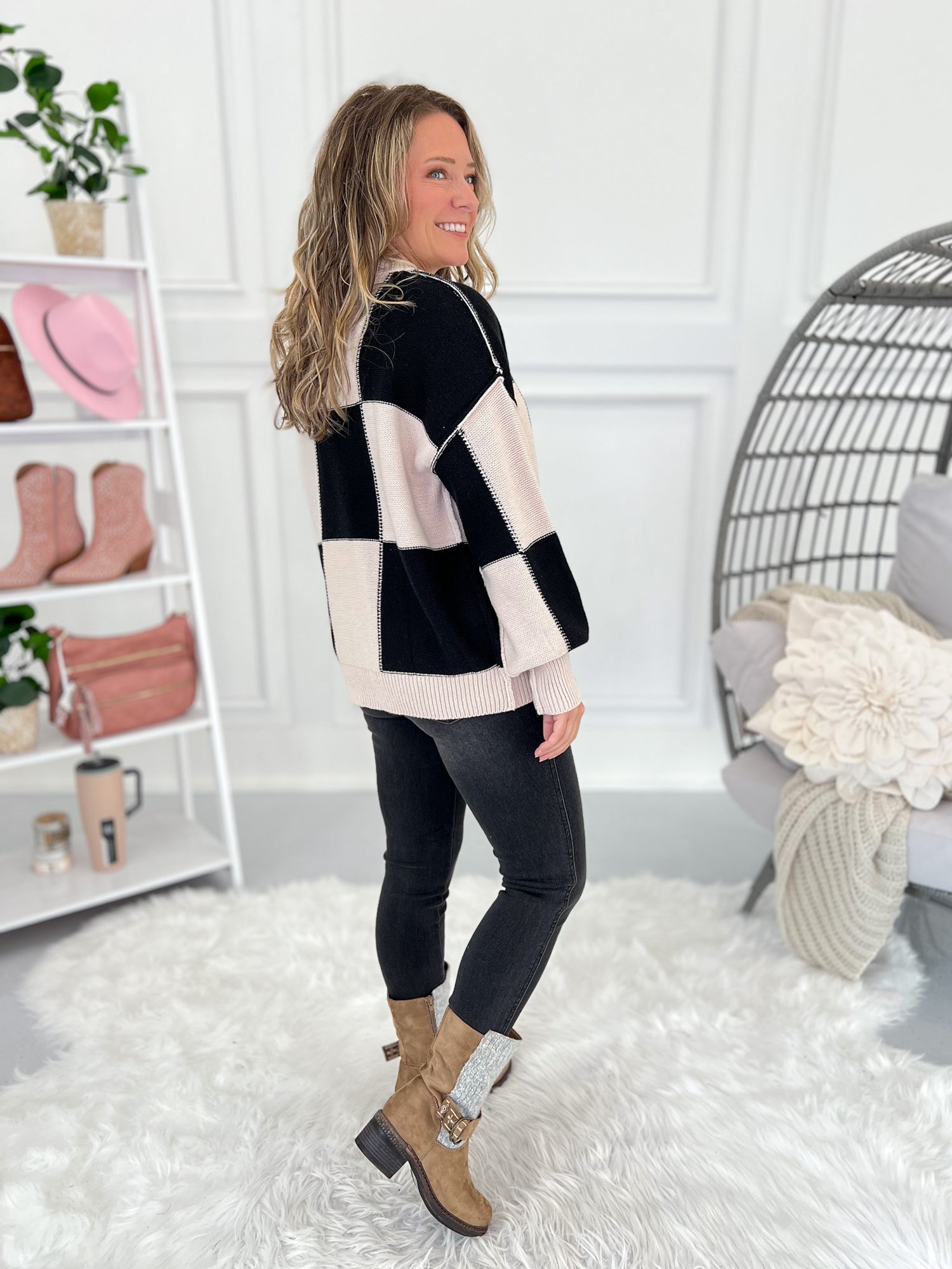 Check off cozy and chic all in one with this bold checkered sweater. Lightweight with the perfect drape, it’s the statement piece your fall wardrobe has been waiting for. Toss it on with denim and boots for a casual vibe or dress it up with trousers for a trendy look that turns heads.