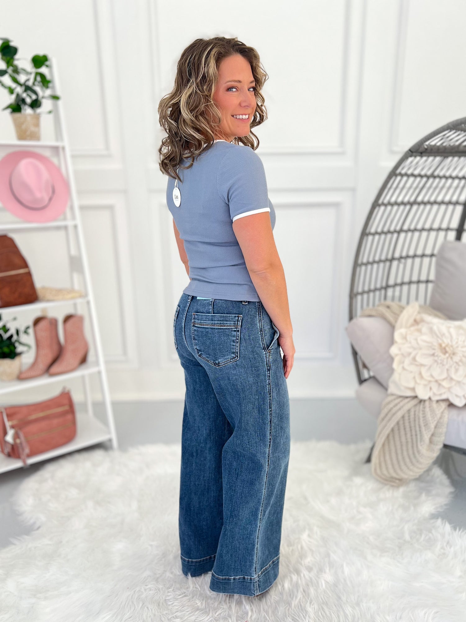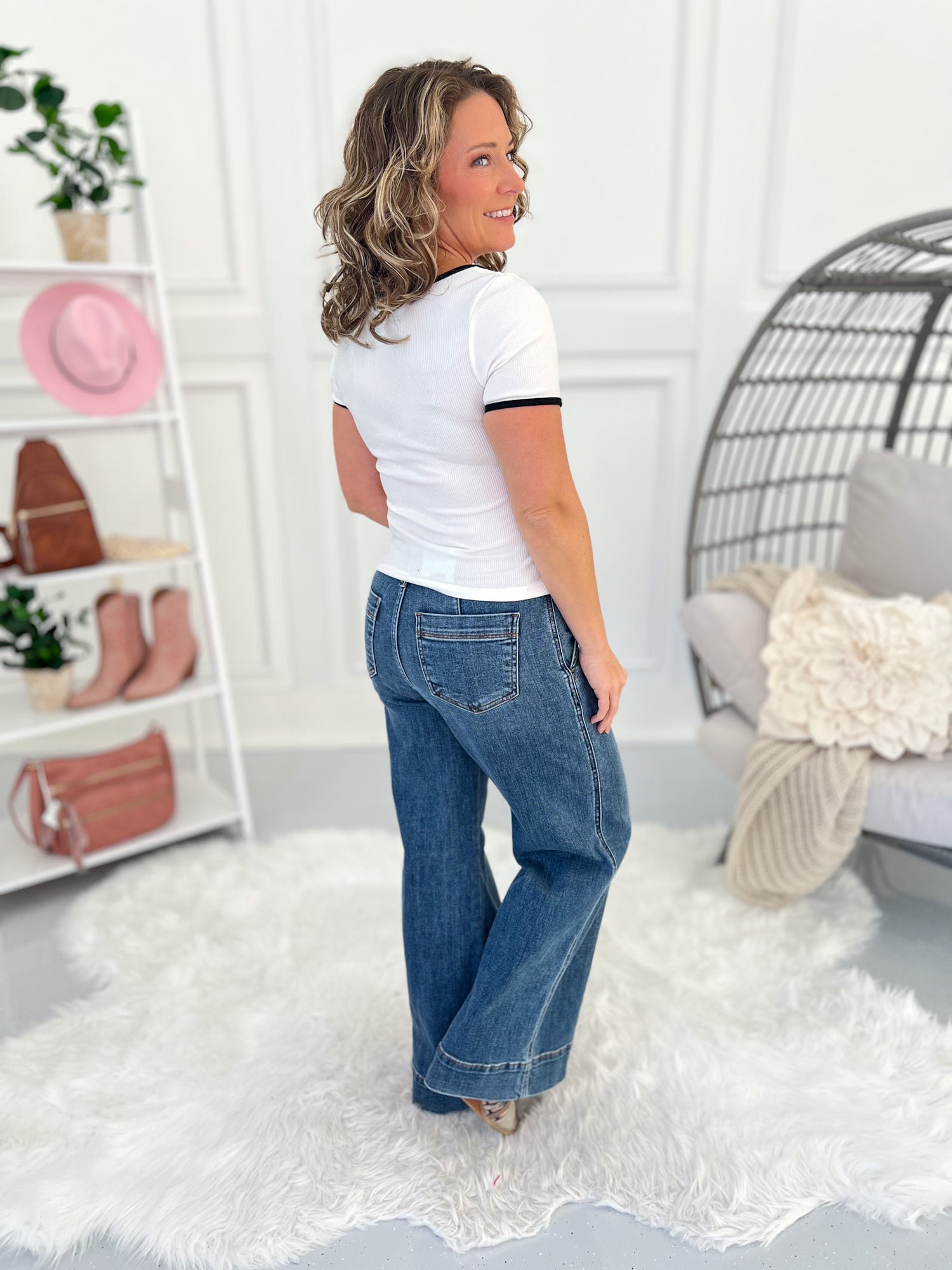 A little 90s throwback with a modern, flattering twist. This ribbed ringer top features a square neckline and contrast trim that frames the shoulders just right. The fit is cropped-but-not-short, making it an easy match for high-waisted denim, shorts, or layered under your favorite hoodies and cardigans.