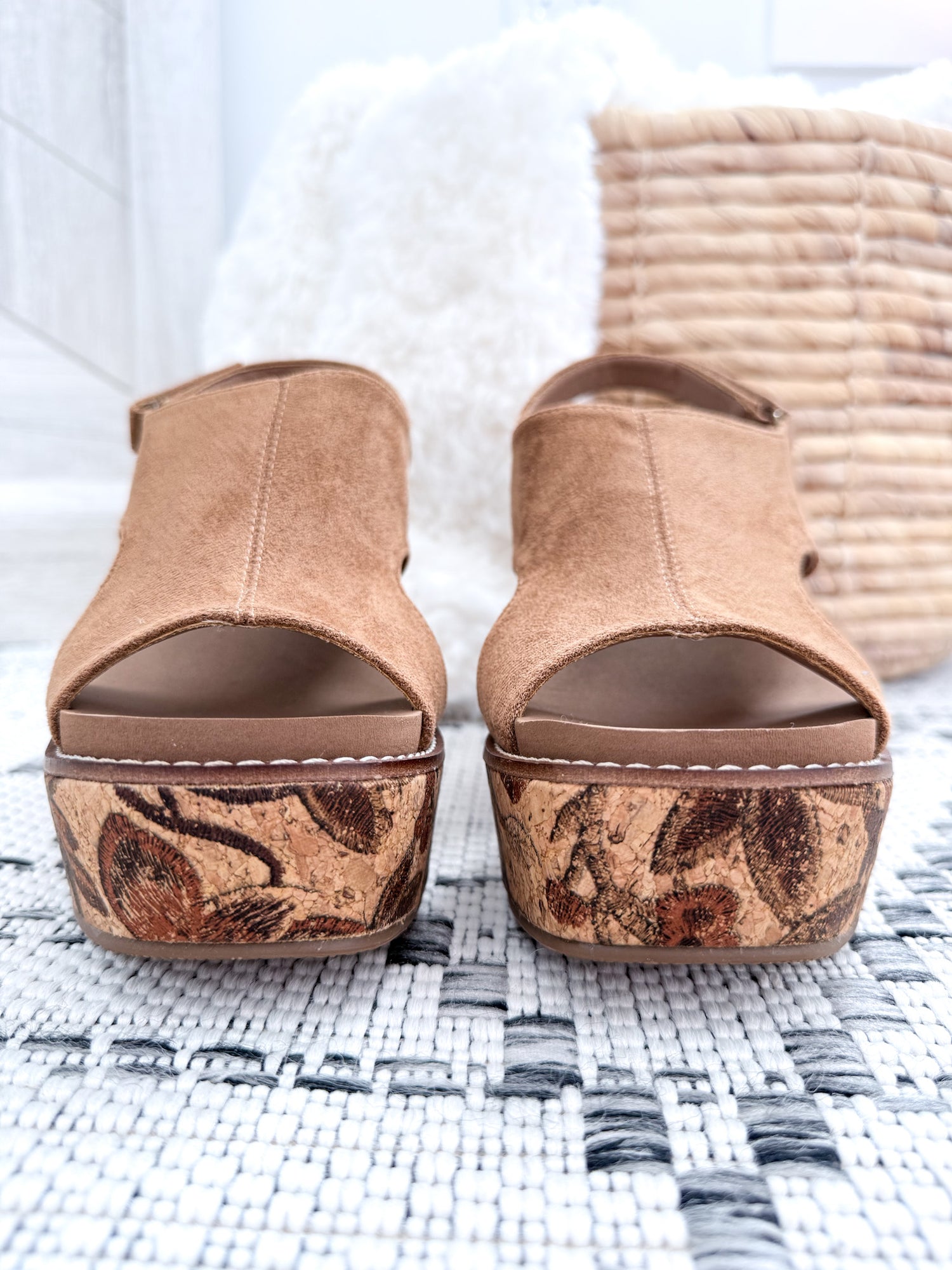 A neutral dream with a little extra flair — this tan Freddie wedge pairs a soft faux suede upper with a beautifully stamped floral cork platform. It’s the perfect mix of earthy, elevated, and ridiculously comfortable.