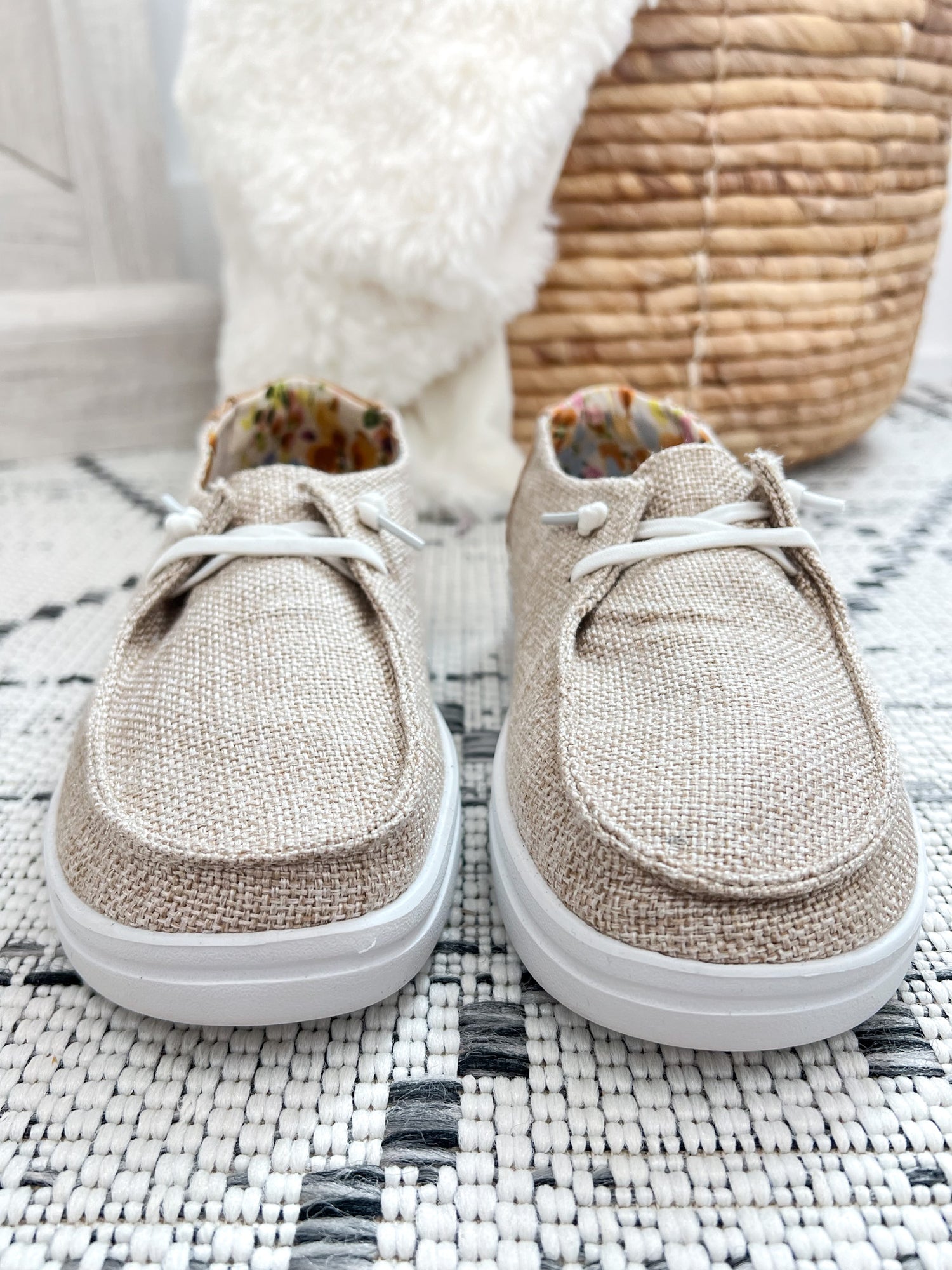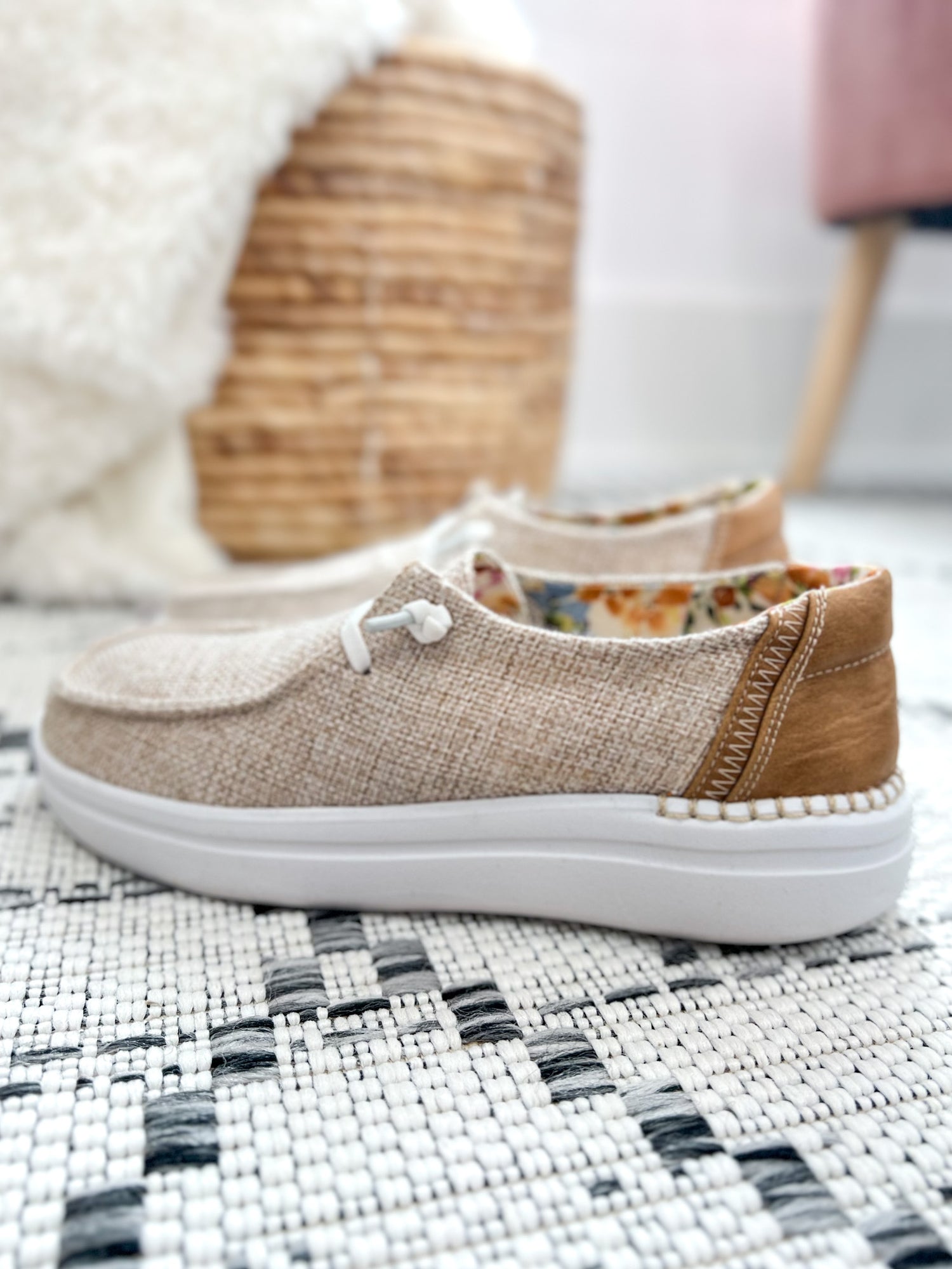 Laid-back comfort meets effortless style with these easy slip-on sneakers. The sand tweed texture keeps things neutral and versatile, while the floral lining adds a fun pop of color inside. Perfect for casual days with denim, joggers, or even a sundress when you’re on the go.