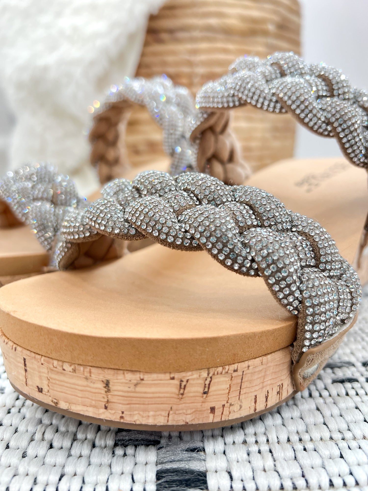 All eyes on you—these dazzling rhinestone wedges are made to steal the spotlight! The braided straps shimmer with every step, featuring iridescent stones and a soft microsuede underside for a comfortable fit. A cork wedge bottom and cushioned memory foam footbed make these beauties as comfy as they are stunning—perfect for dressing up denim or pairing with your favorite summer dresses.