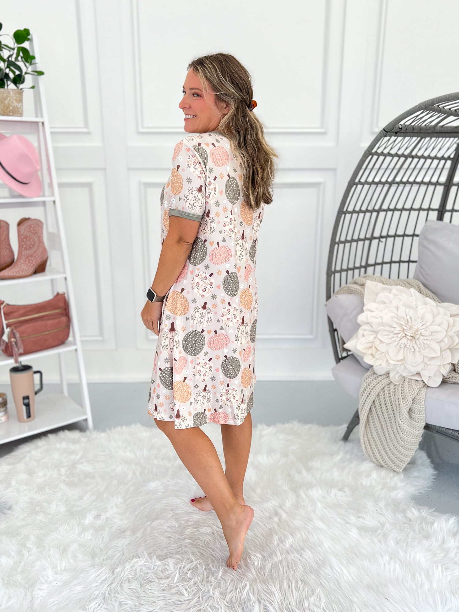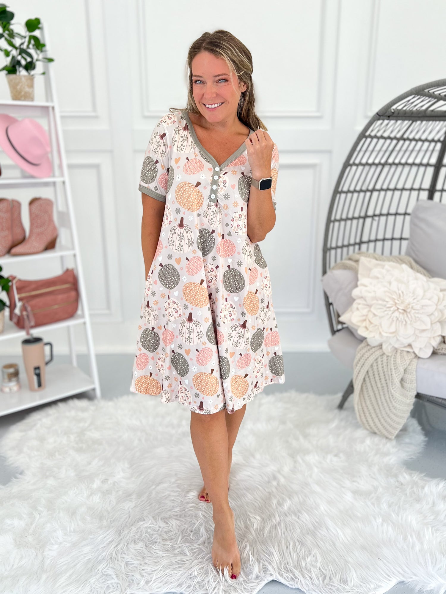 Cozy nights just got cuter with this pumpkin print night dress pajama from Shirley & Stone. Made from buttery soft milk silk, it’s smooth, stretchy, and so easy to throw on. With a v-neck faux button detail and side pockets, you’ll feel comfy and covered whether lounging or sleeping.
