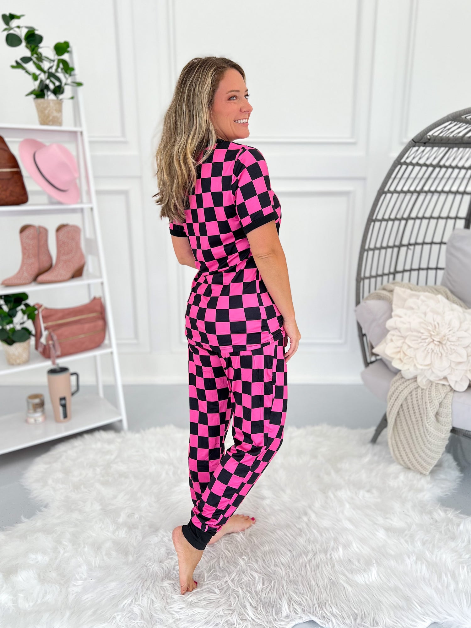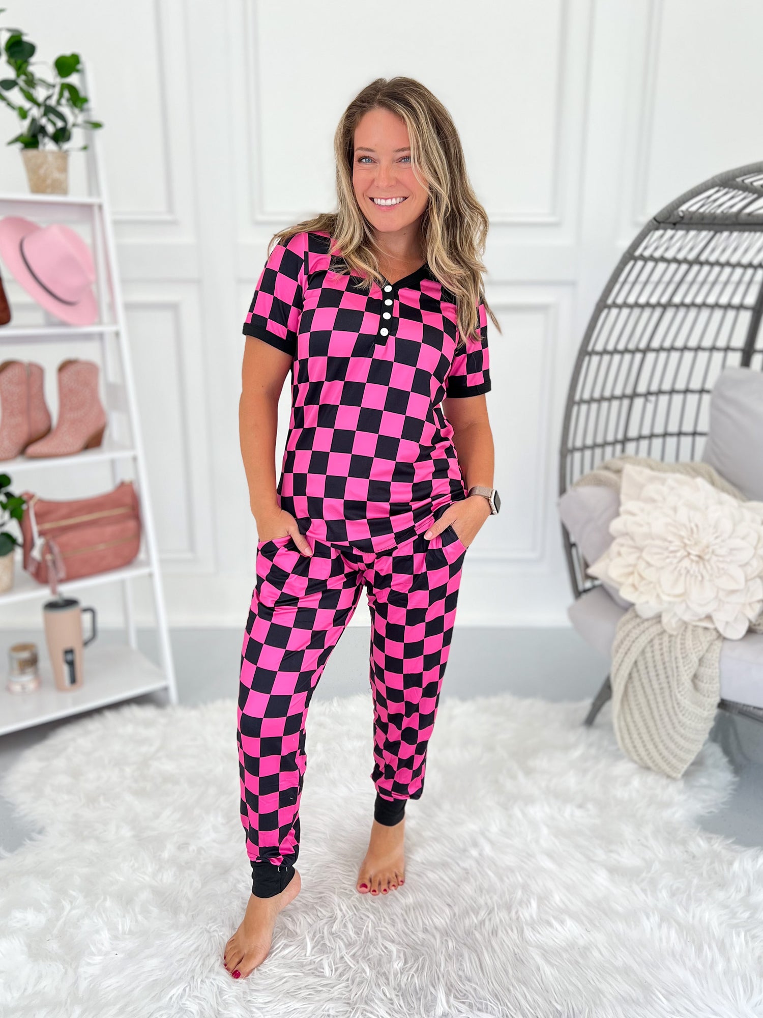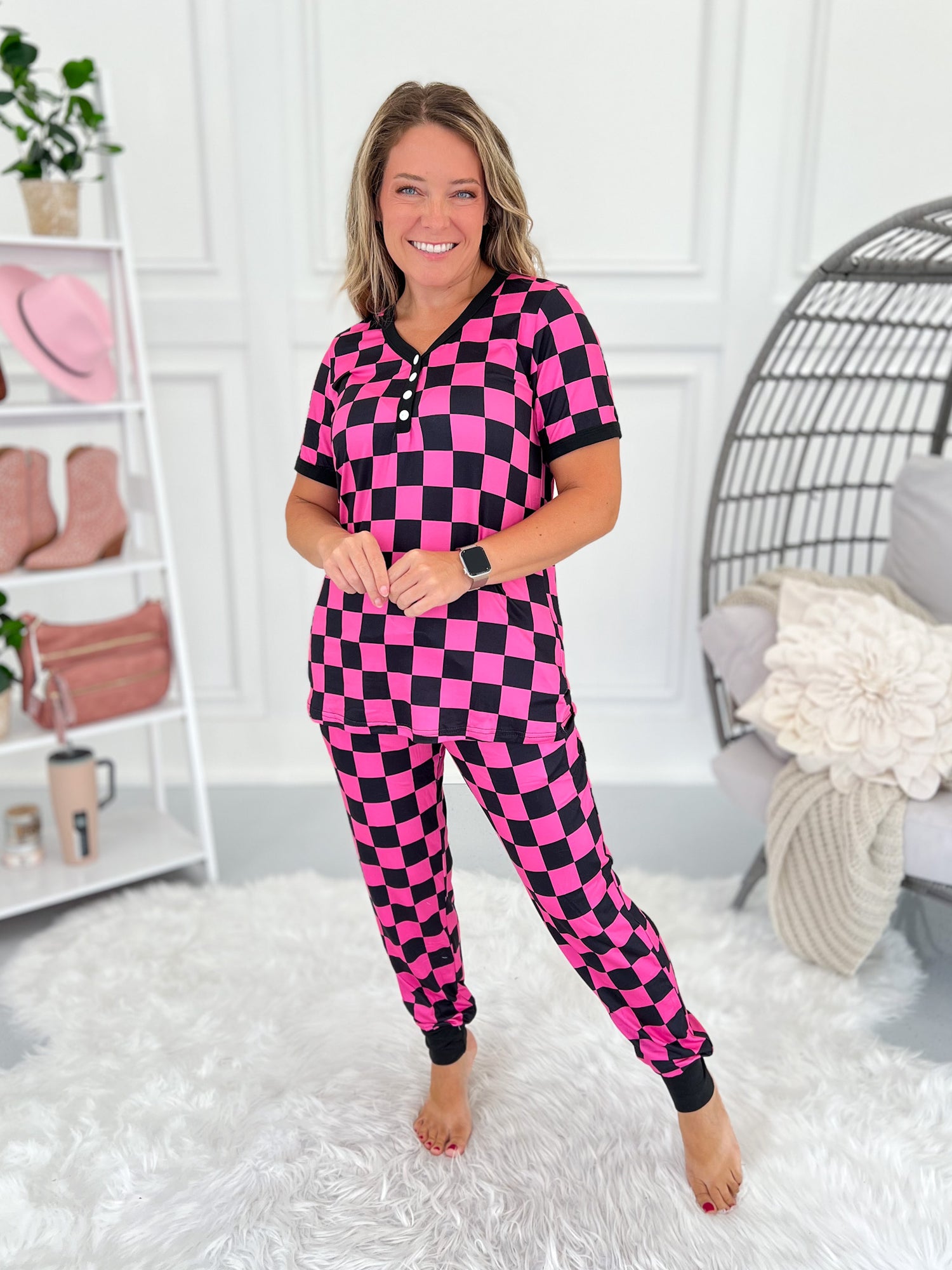 Make bedtime bold with this pink and black checker pajama set. Buttery soft milk silk fabric keeps it smooth, stretchy, and ultra-comfy for lounging or sleeping. Just add slippers for a cozy night in or gift it to your favorite pajama lover.