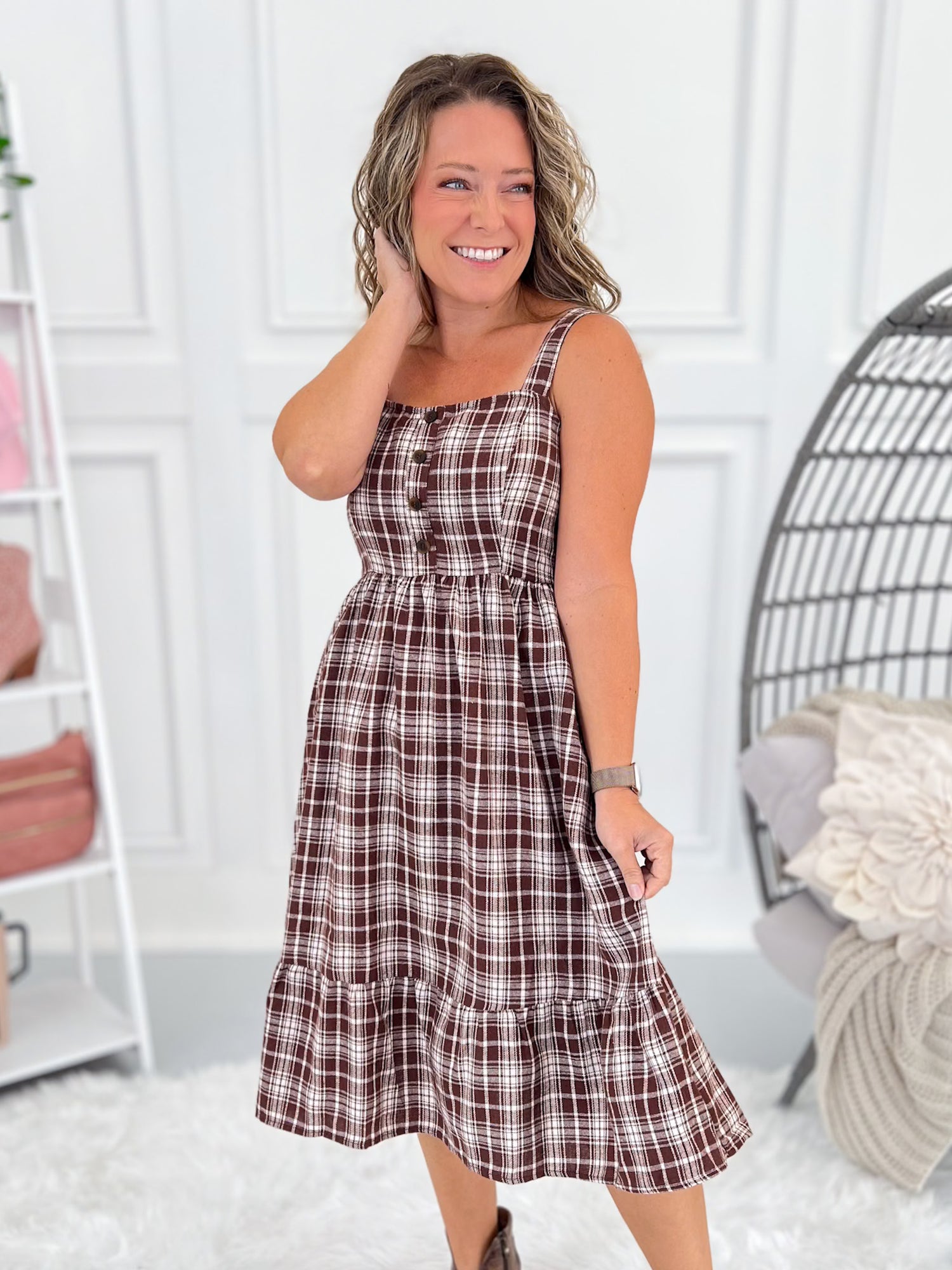 This plaid beauty is fall-ready and full of charm. The brown and ivory tones give it that cozy, seasonal vibe while the flowy shape keeps it comfy and cute. Wear it solo with booties or layer up with a cardigan when the temps drop—it’s the perfect piece for coffee runs, pumpkin patch strolls, or casual nights out.