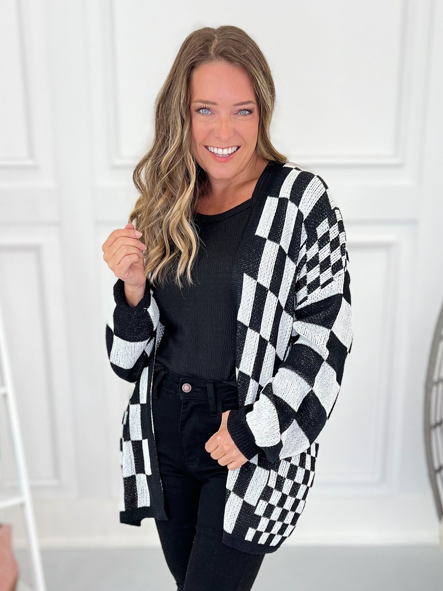 Take your style across the finish line with this bold checkered cardigan. Lightweight, stretchy, and oh-so-comfy, this black and white cardi brings instant edge to any outfit. Throw it on with jeans, leggings, or faux leather for an easy win.