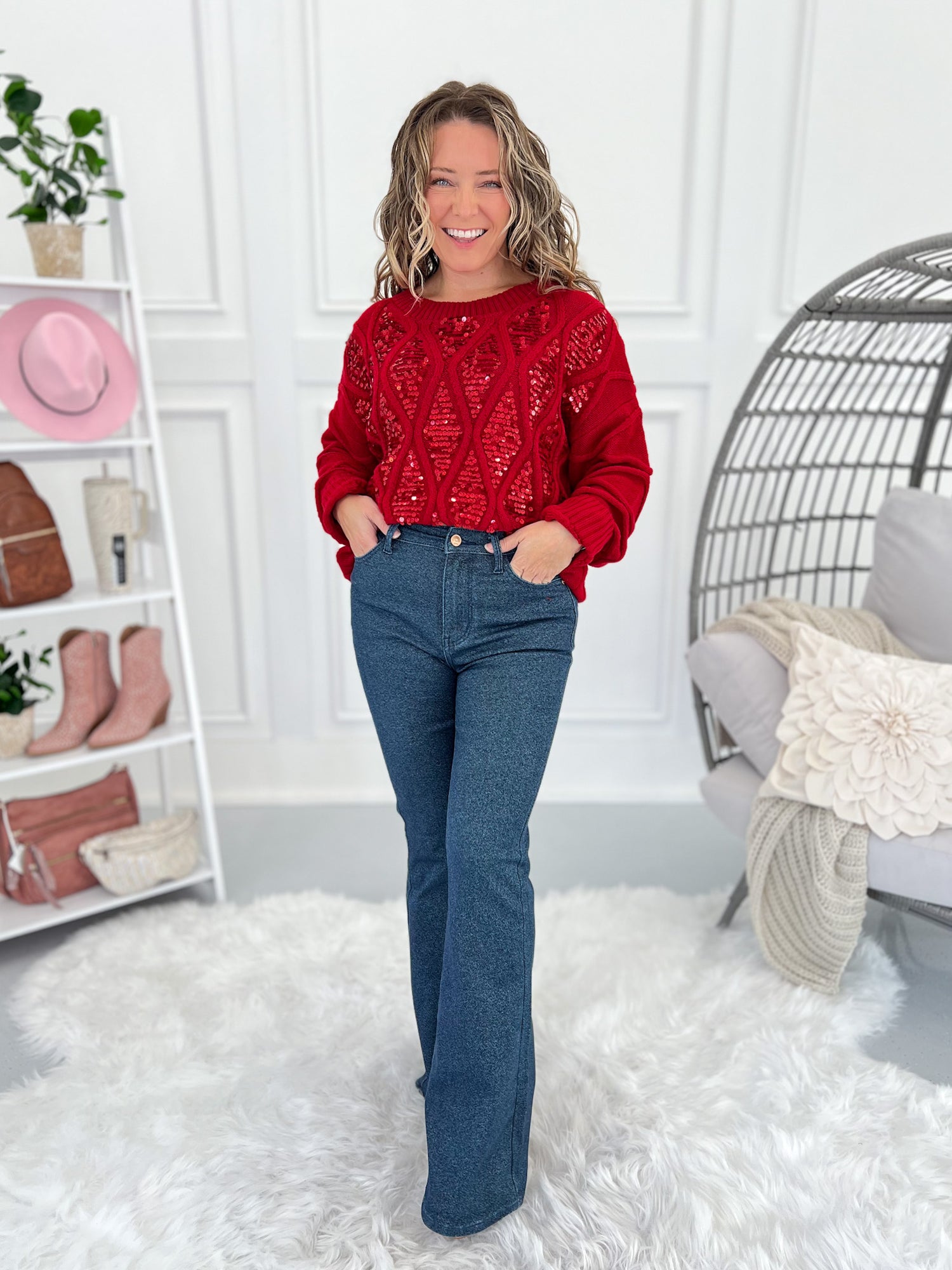 Shine bright and own the night in the Dancing Queen Judy Blue Sparkle Flare. With a subtle metallic thread woven through the rich blue denim, these jeans shimmer just enough to turn heads without going over the top. The soft, stretchy fit and flattering flare silhouette make them a dream to wear from dinner to the dance floor. Perfect for holiday parties, concerts, or any night you want to sparkle with style.