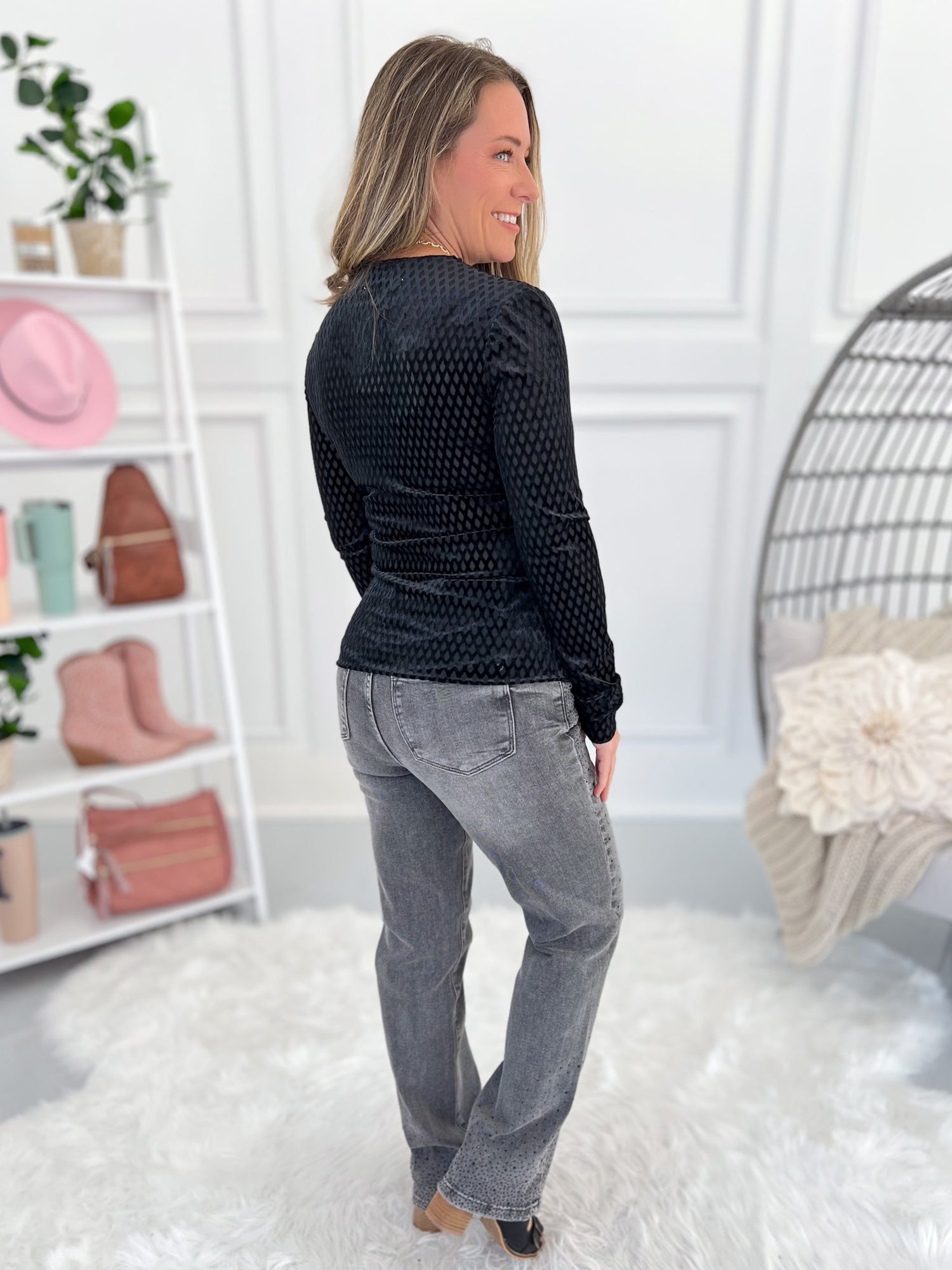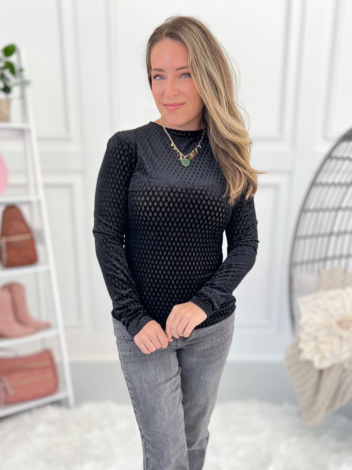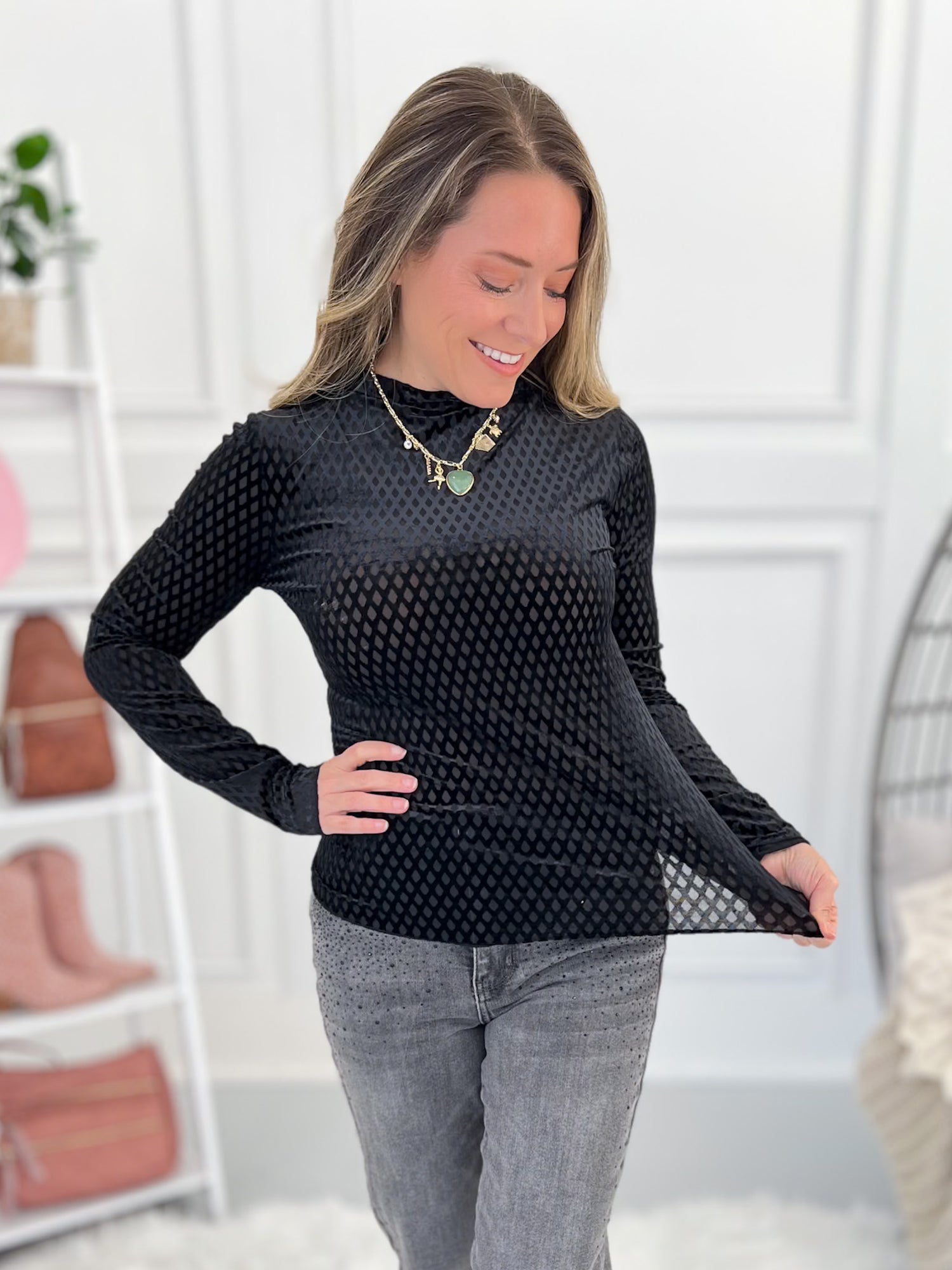 Mesh tops are so on trend right now and this one with a crushed velvet finish is a must! Perfect under blazers and cardigans, amazing layered with a cami and tucked into your favorite denim, or wear a graphic tee over the top for an edgy vibe. Styling options are endless.
