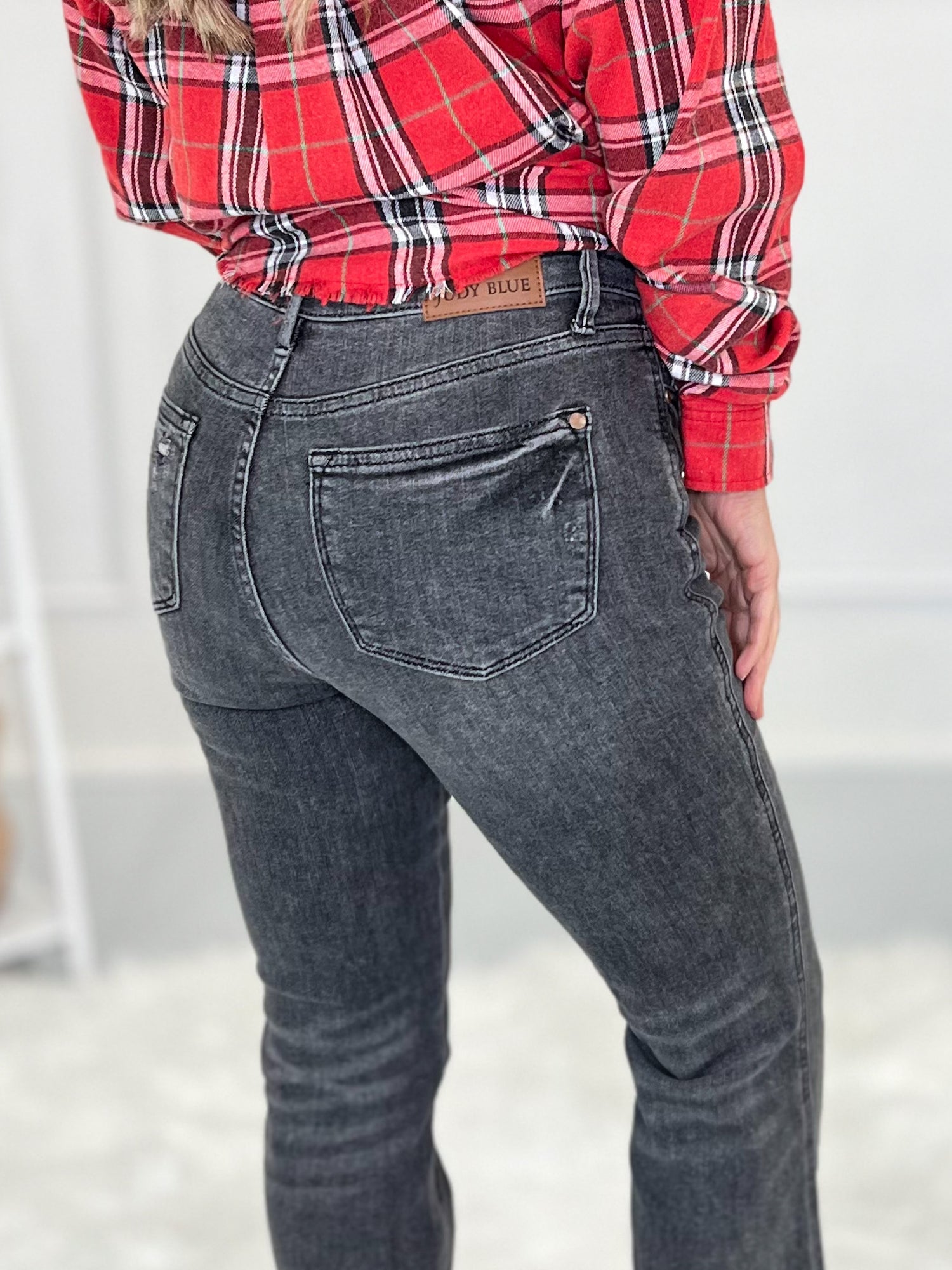 Dang these jeans are HOT! The vintage black is so edgy and gives a ton of style without any major distressing! Perfectly placed back pockets have a pin-tacked finish for an amazing butt lifting effect that everyone loves. Finished with a shadow ankle hem, which makes your legs look long and lean. These Judy Blue flares have it all - including the amazing stretch that we know and love!