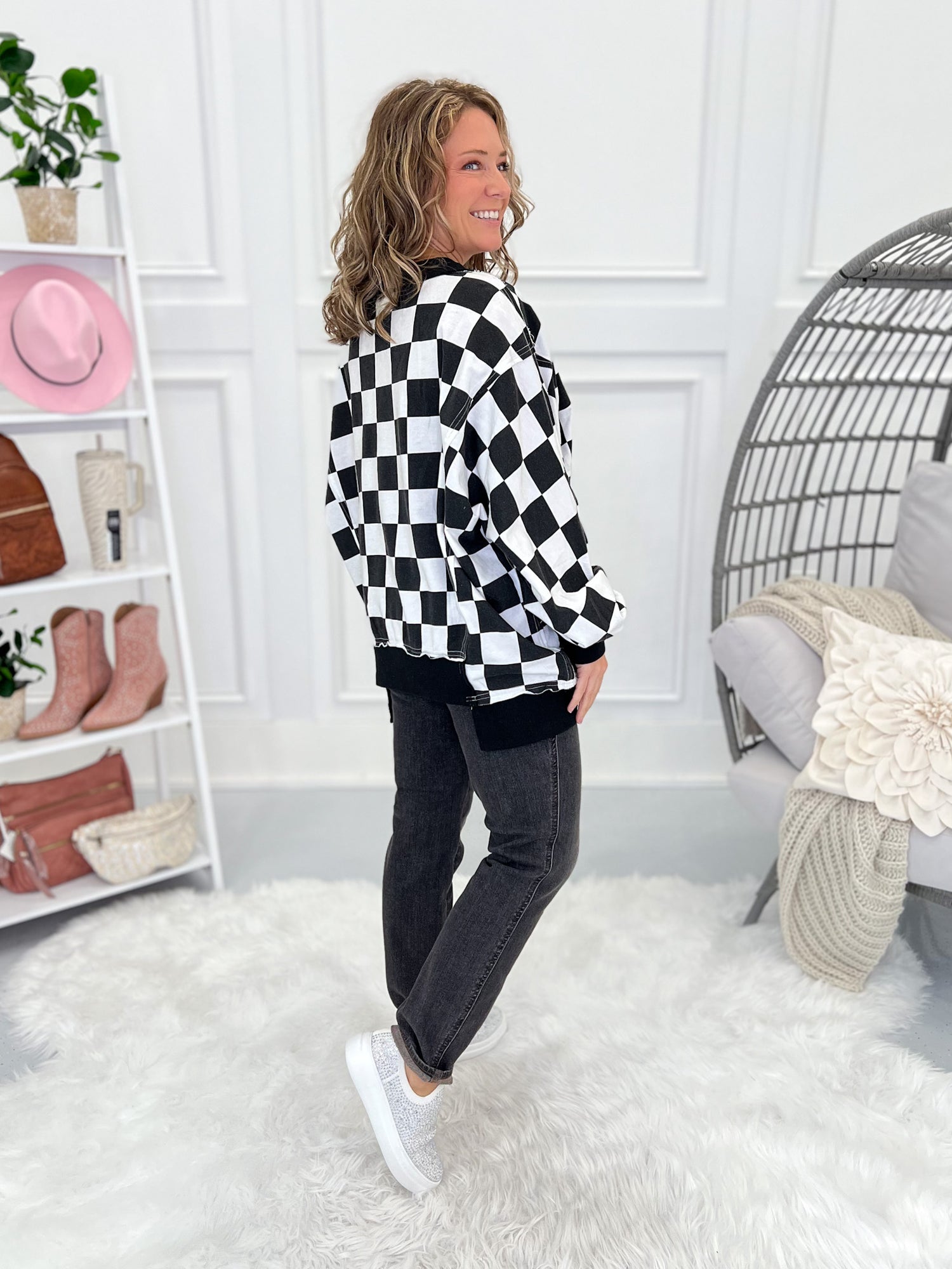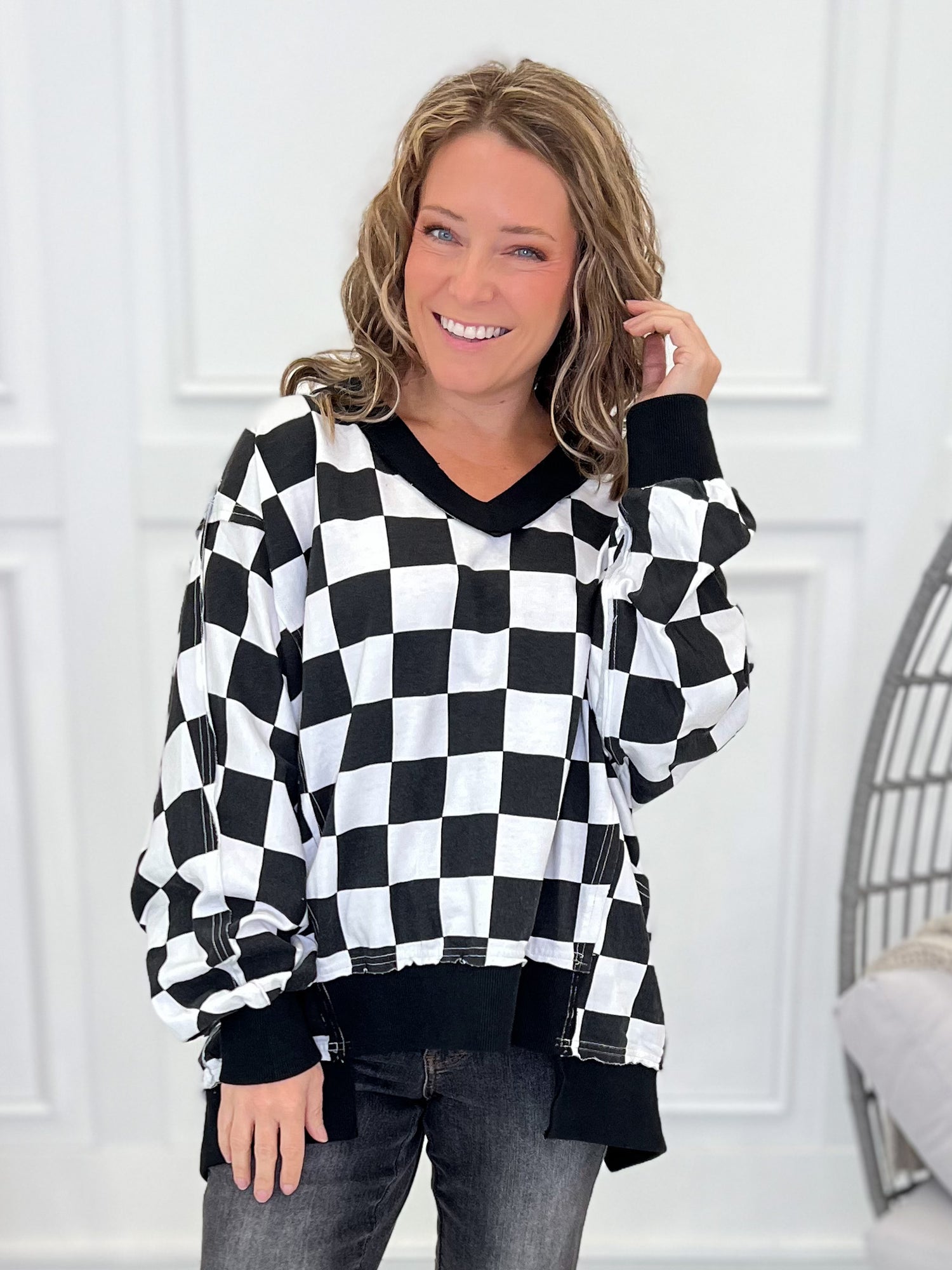 All the 90’s vibes in one effortlessly cool top. This slouchy weekender style brings that laid-back comfort with a bold checkered print that totally steals the show. The soft looped sweatshirt fabric keeps it cozy, while the v-neck, side pockets, and split hemline give it that easy, throw-on-and-go feel.
