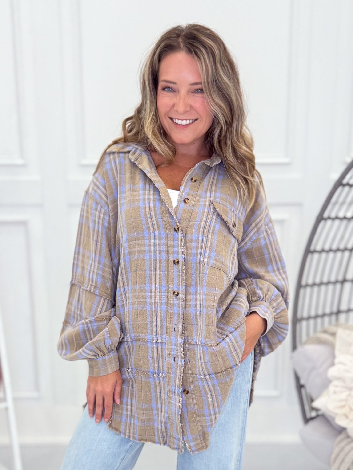 The perfect blend of cozy and cool, this muted plaid button up is ready for all your fall layering. With a soft flannel feel and an oversized slouchy fit, it’s easy to throw on over tanks, tees, or even a hoodie for that effortless vibe. The frayed seam details add just the right amount of edge while keeping things casual and comfy.