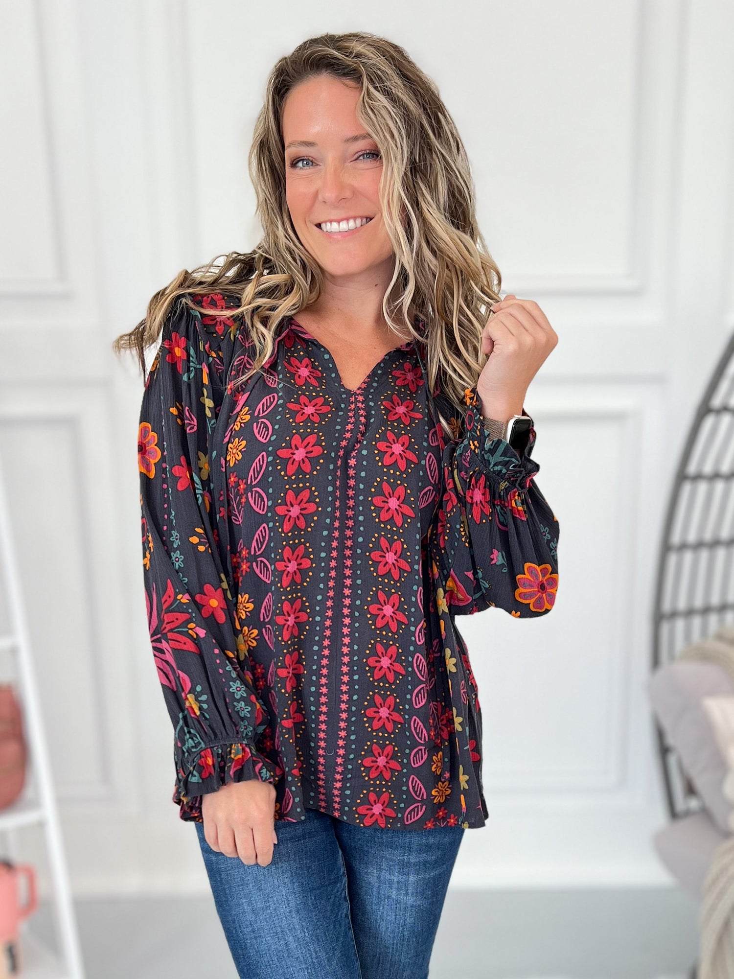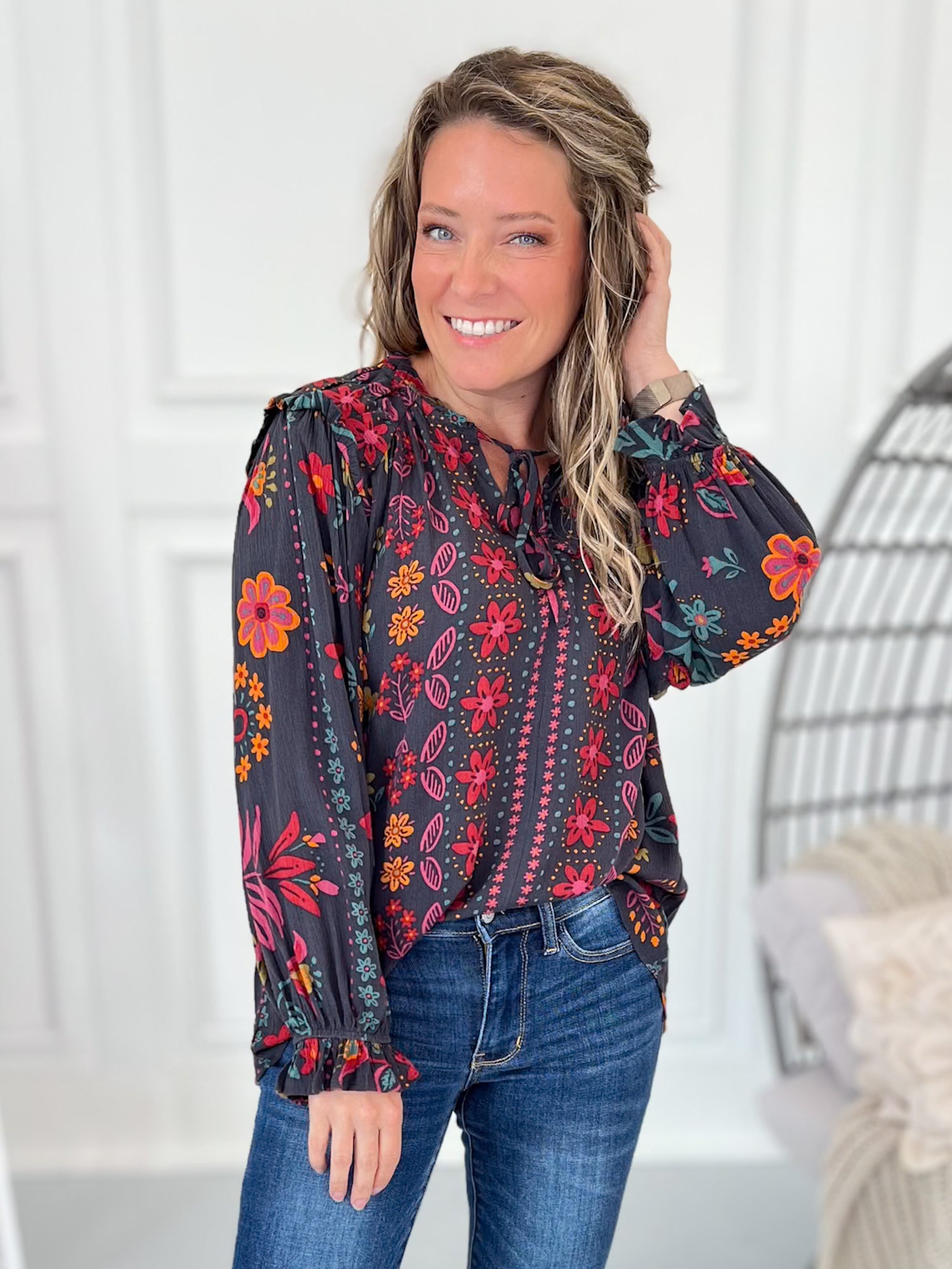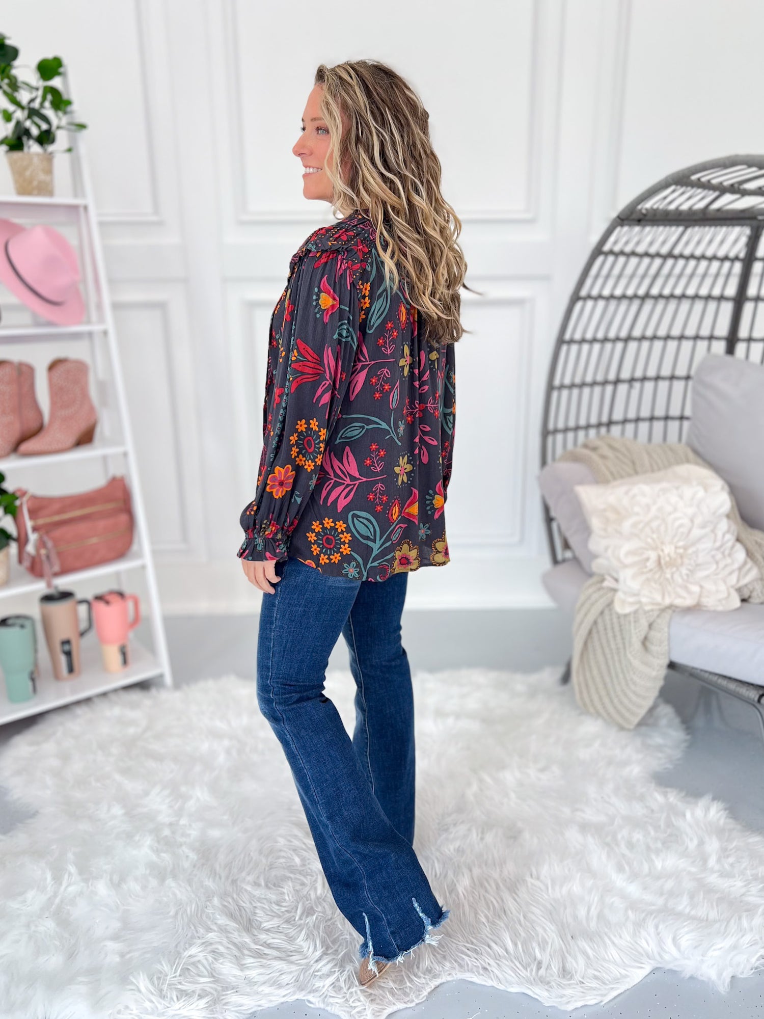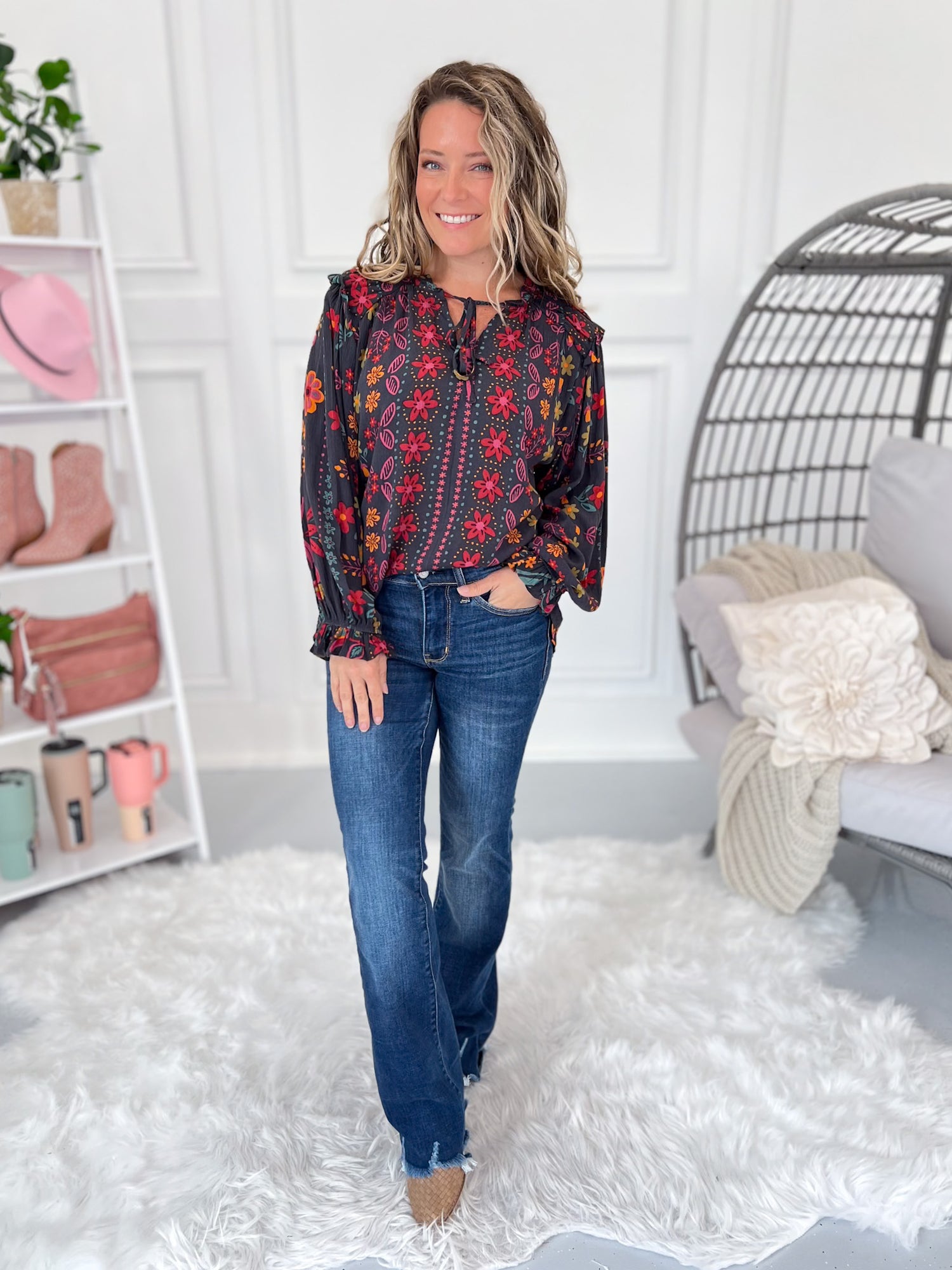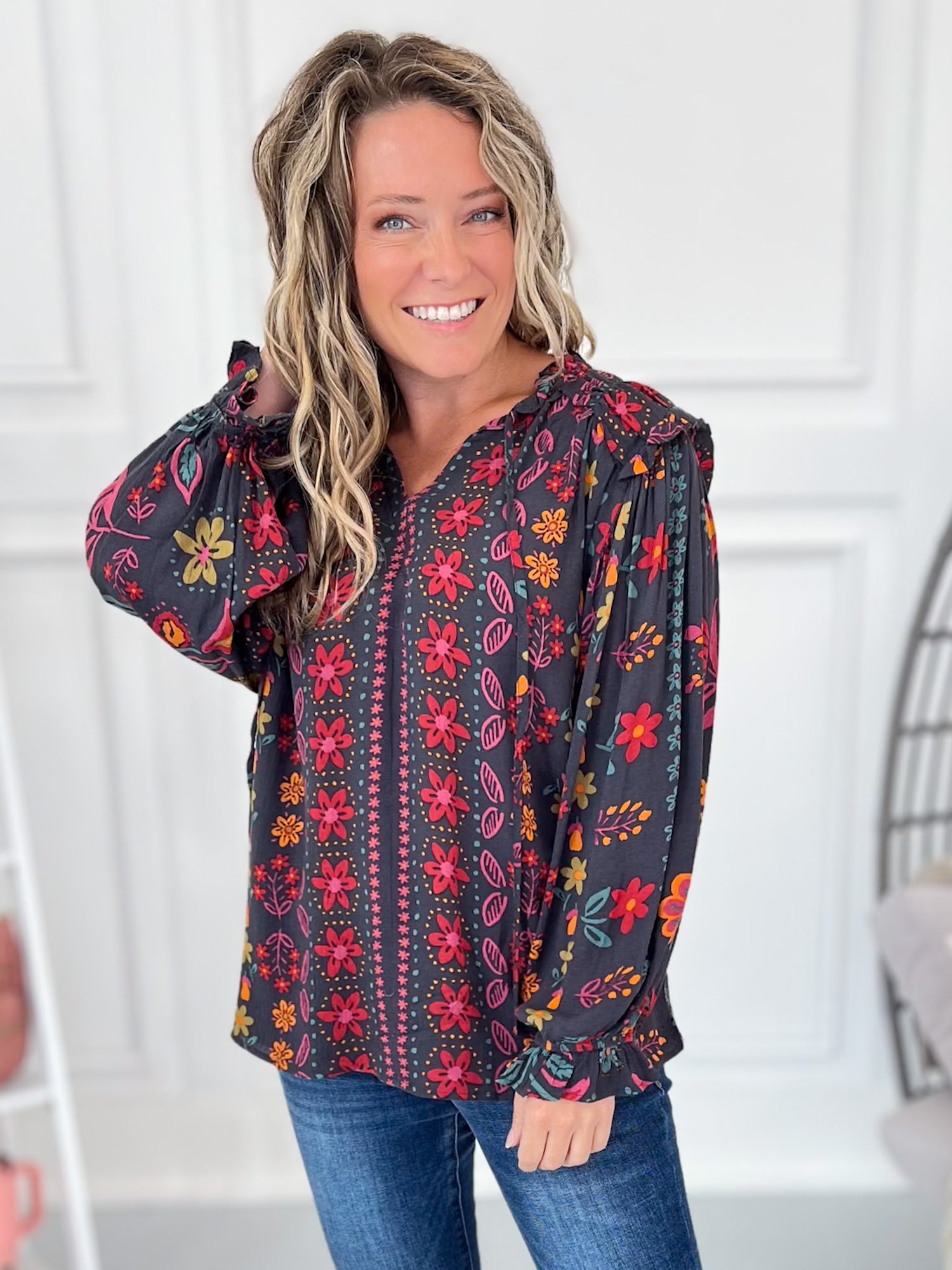All the boho vibes with a chic twist – this blouse is bringing the fall jewel tones to life! With its flowy fit, playful ruffle shoulder detail, and bloused sleeves, it’s one of those tops you can dress up or keep casual. Pair with denim flares for that easy weekend style, or tuck it into trousers for a polished work look without the bulk. Lightweight, airy, and effortlessly stylish – this one’s a must-have for your fall lineup.