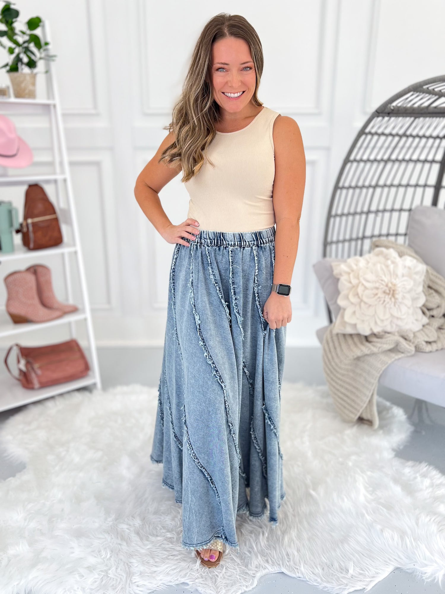 Say hello to your new favorite statement skirt! The Easy Goes It Denim Skirt is where comfort meets cool-girl charm. Made from soft chambray with a vintage wash and frayed swirl detailing, it gives off easy, breezy, retro energy with every step. Toss it on with a graphic tee, a fitted tank, or even a slouchy sweater—this one twirls through every season with serious style.
