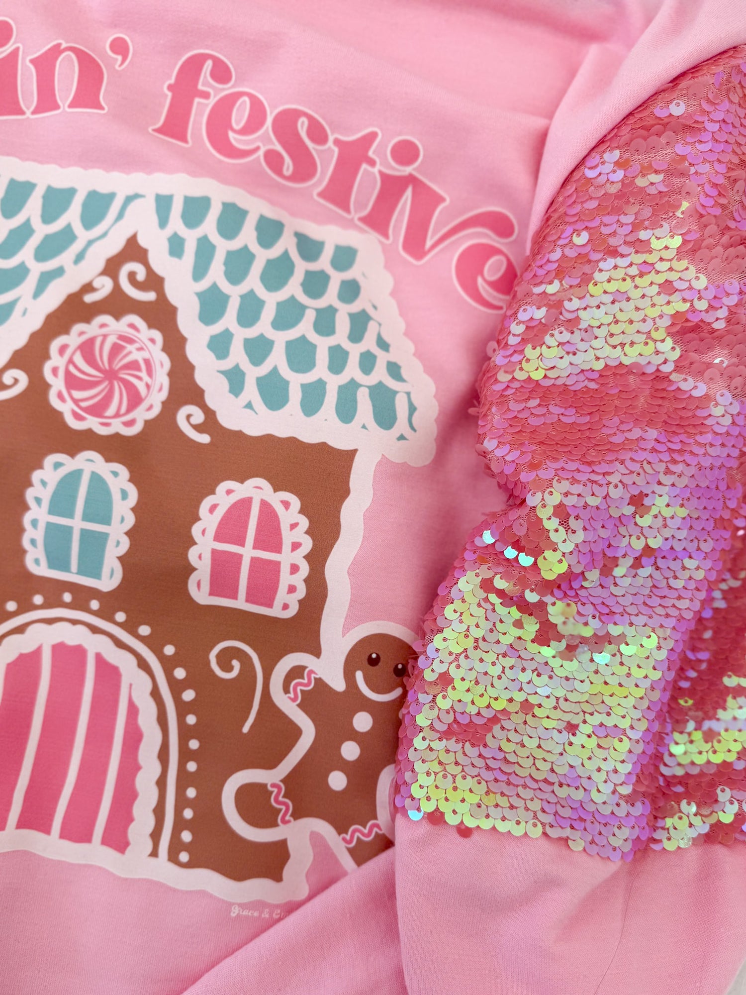 It’s impossible not to catch the holiday spirit in this adorable Festive Feeling sweatshirt! Featuring a sweet gingerbread house screenprint and fully lined sequin sleeves, it’s the perfect mix of cozy and cheerful. Pair with jeans, leggings, or your favorite plaid lounge pants for a look that’s merry and bright.