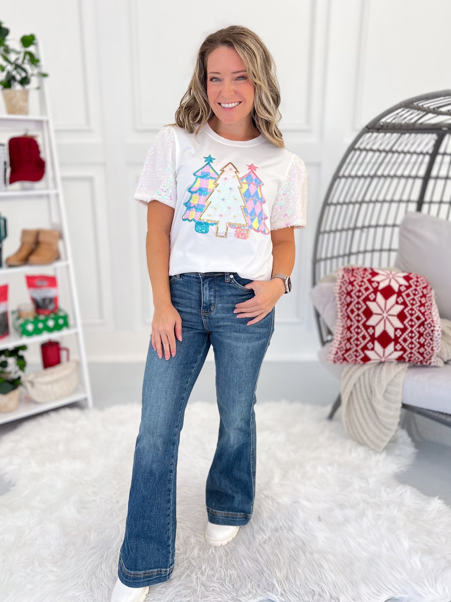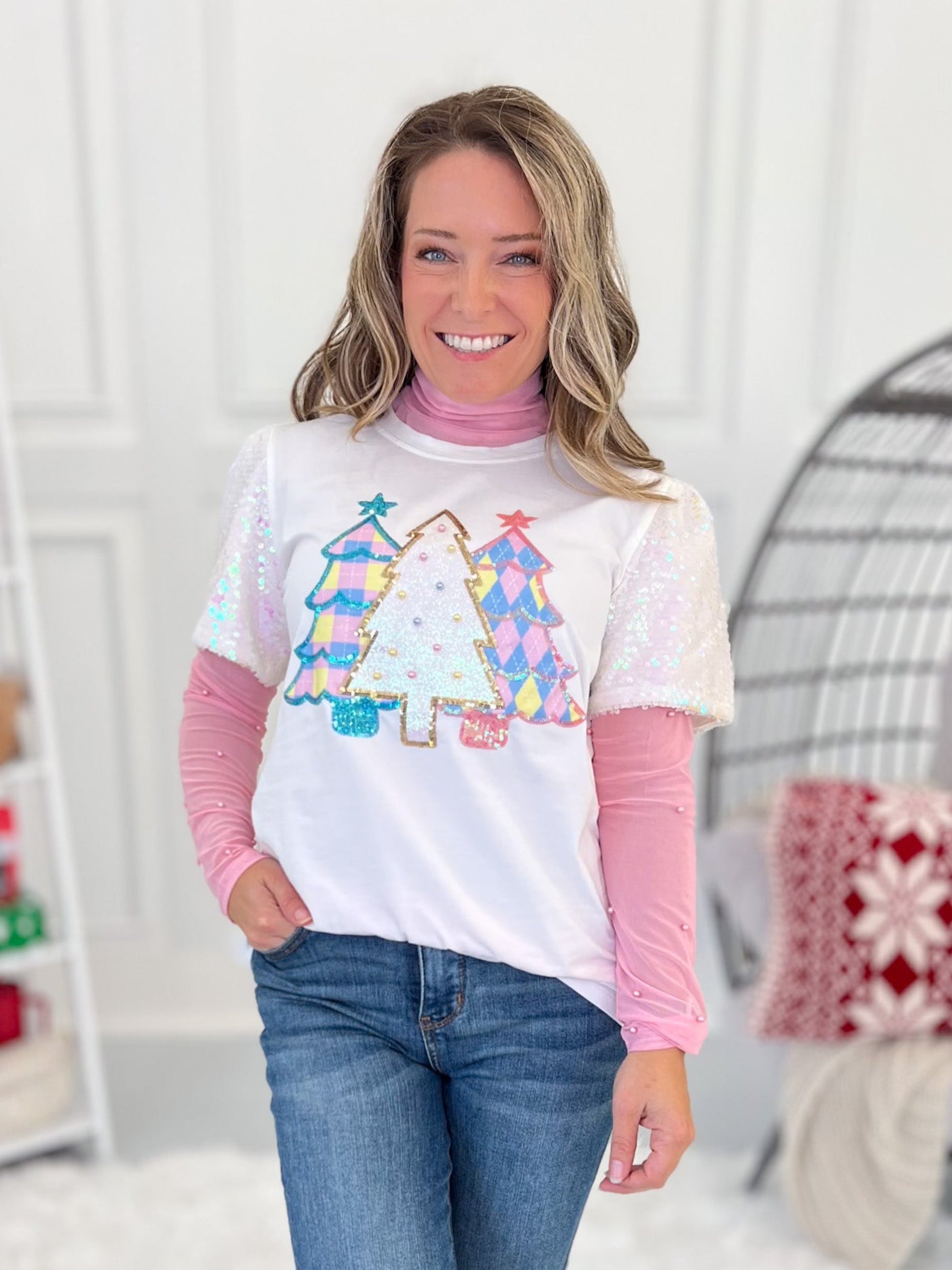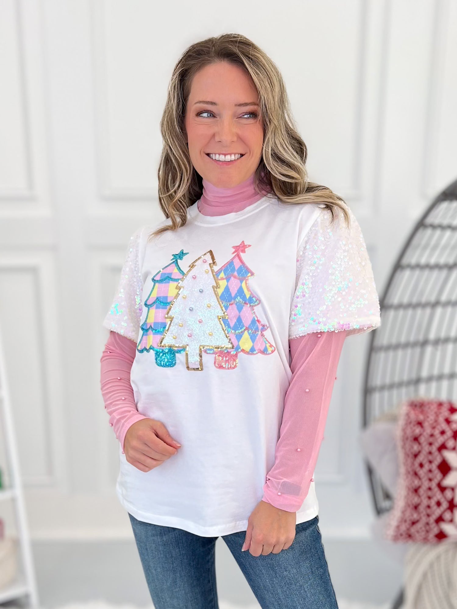 Fun, colorful, and totally festive—our Festive Forests Tee brings a whimsical twist to holiday style. The playful mix of gingham and plaid trees with sequin accents makes it merry and bright in all the right ways. Soft, thick cotton blend with lined sequin sleeves ensures sparkle and comfort go hand in hand.