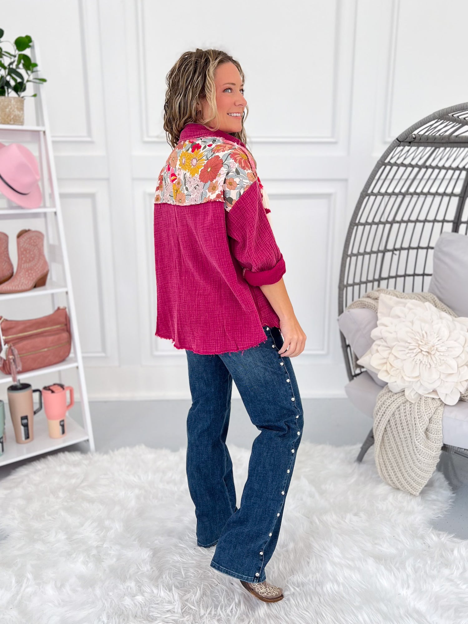 A boho-meets-western patchwork button up in our ultra-soft “baby blanket” gauze. Floral panels, star appliqués, and fall colors make this the statement shacket to wear open over tees, tied at the waist, or fully buttoned with denim for a boutique-chic look.