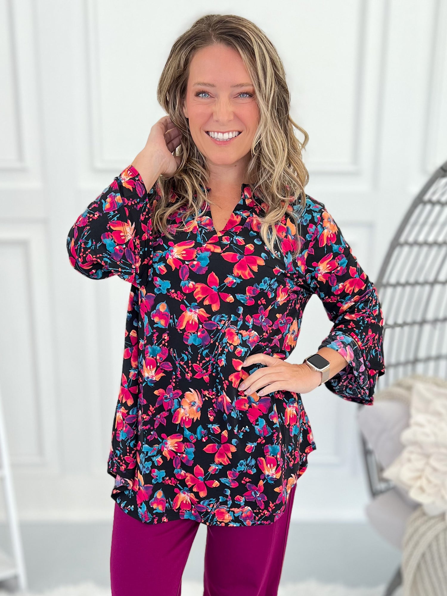 Color and comfort in one easy piece. This Dear Scarlett Lizzy Bell Sleeve Top (from our Busy Babe on a Budget collection) pops with watercolor florals on a sleek black base, while the wrinkle-free, ultra-stretchy fabric keeps you polished and comfy from desk to dinner.
