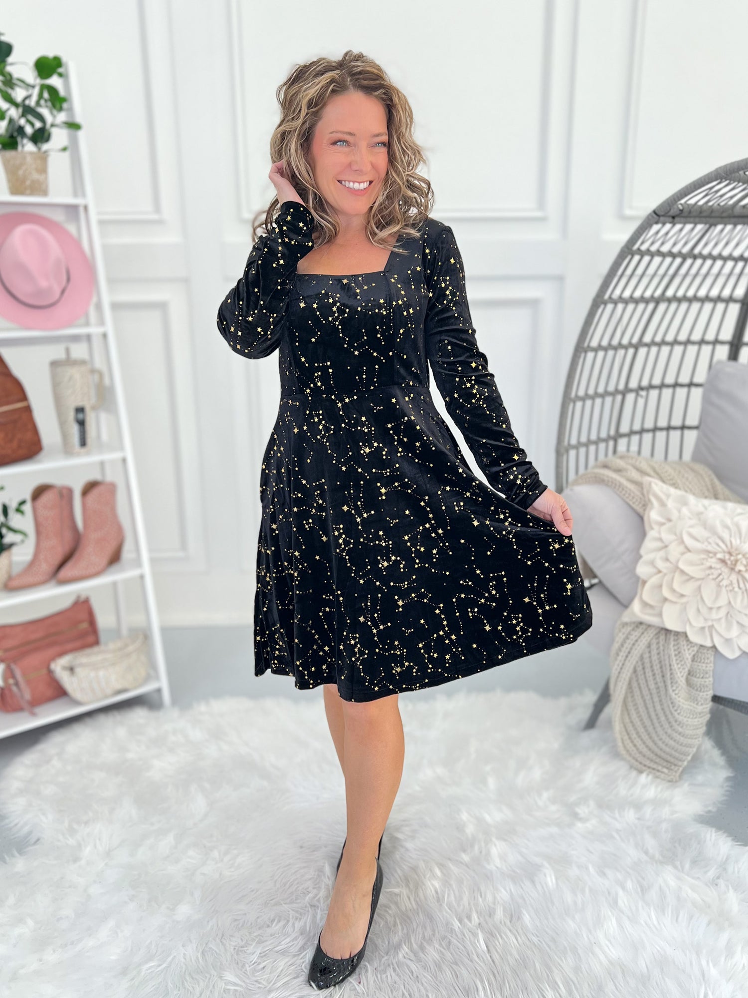 This stunning black velvet dress shines with gold-foiled stars and a classic A-line silhouette that feels magical for every event. Dress it up with sparkly heels or keep it cozy with boots and a longline coat.