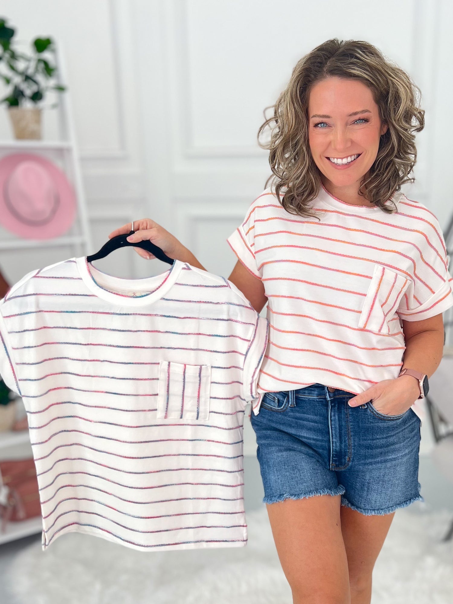 Found My Stride Top proves that simple doesn’t have to be boring. With raised rainbow stitching in two fun colorways, contrast stripe pocket detail, and an easy relaxed fit, this tee brings just the right pop of personality to your everyday look.