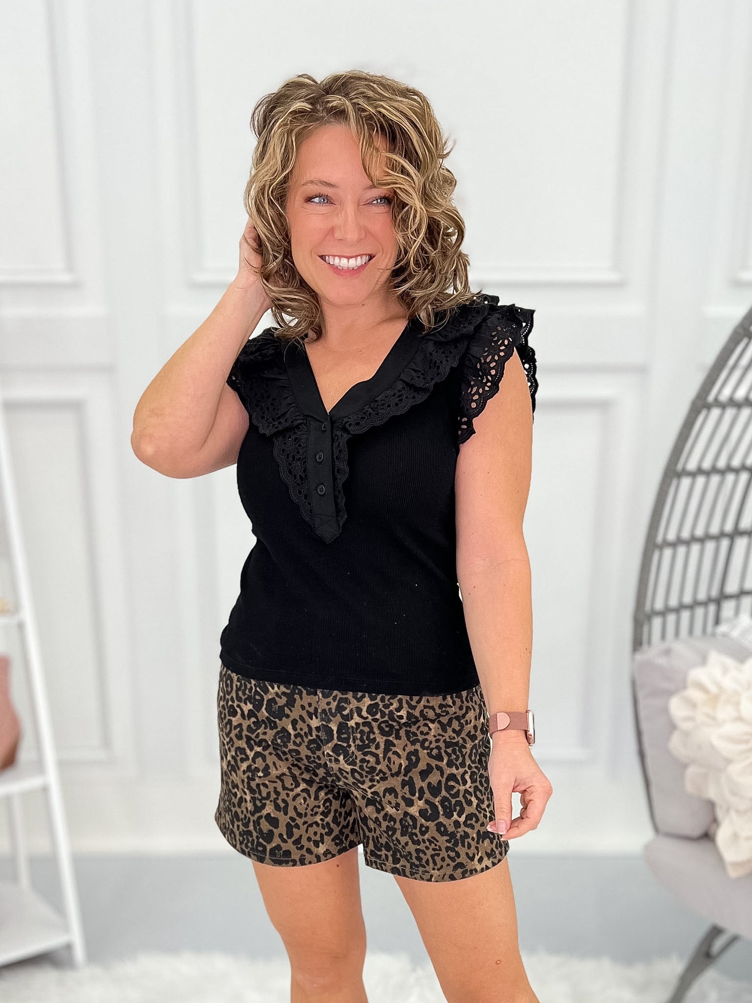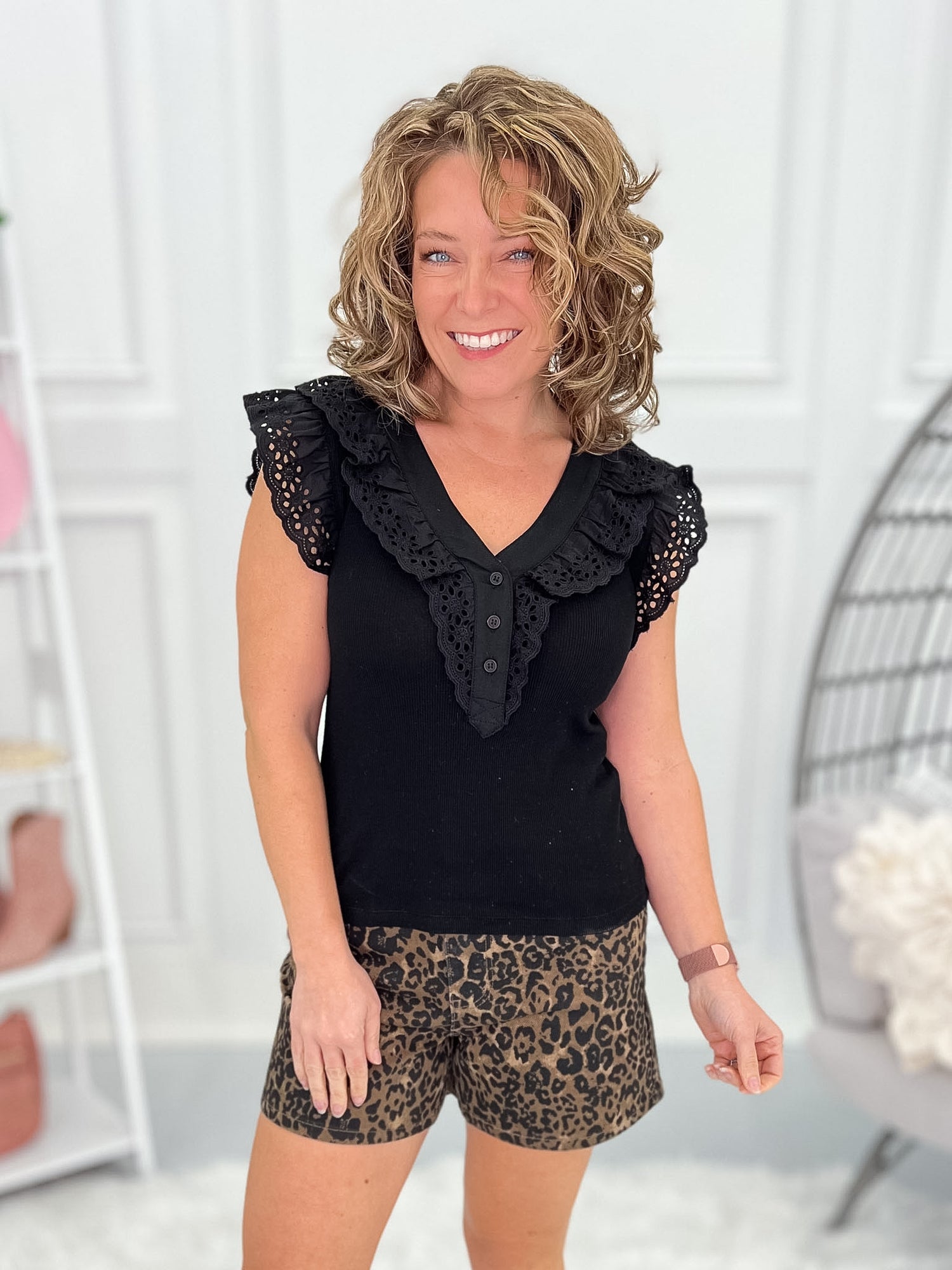 • Eyelet Lace Trim: layered neckline and shoulder detail adds a feminine, boutique touch.
