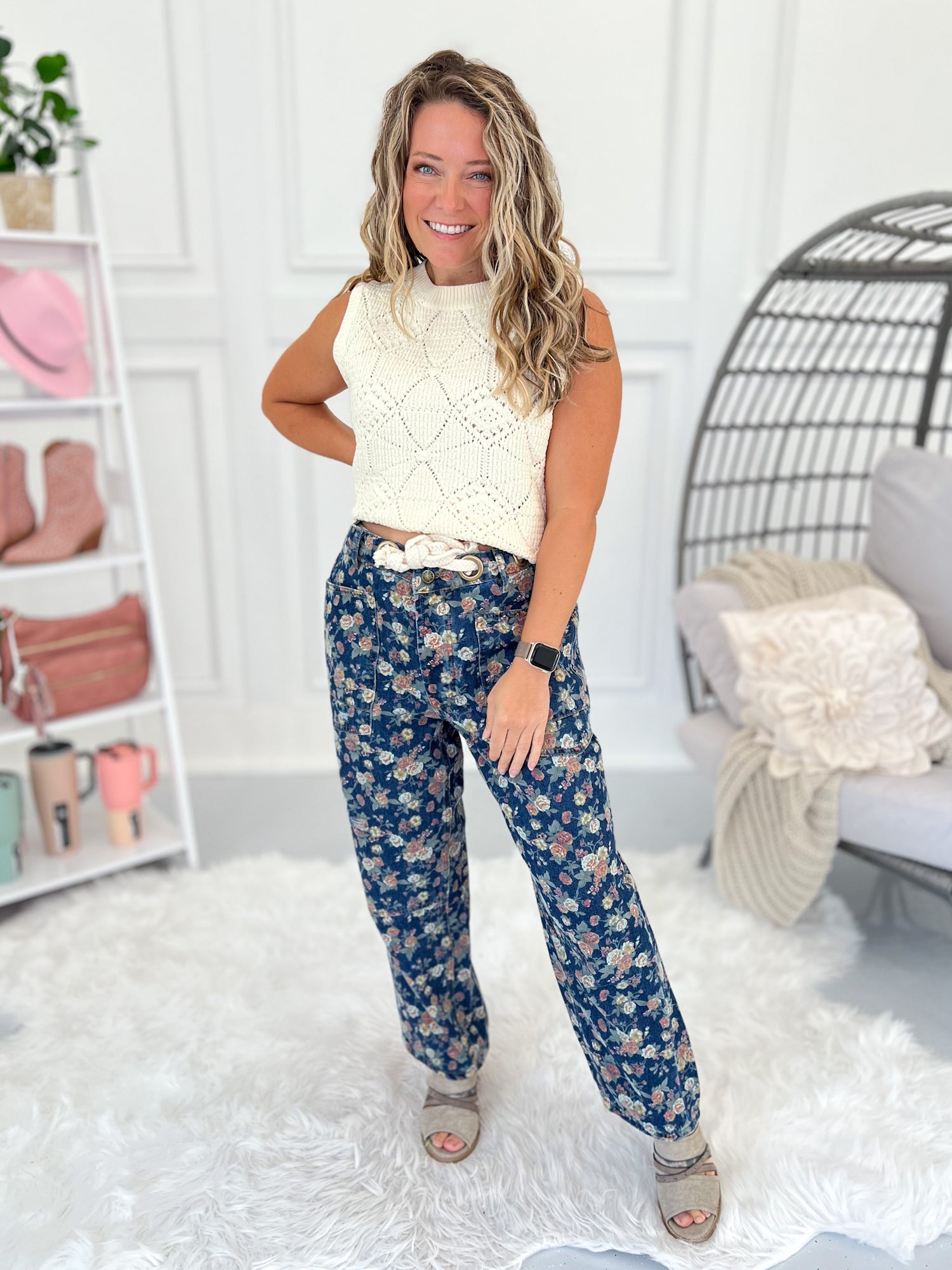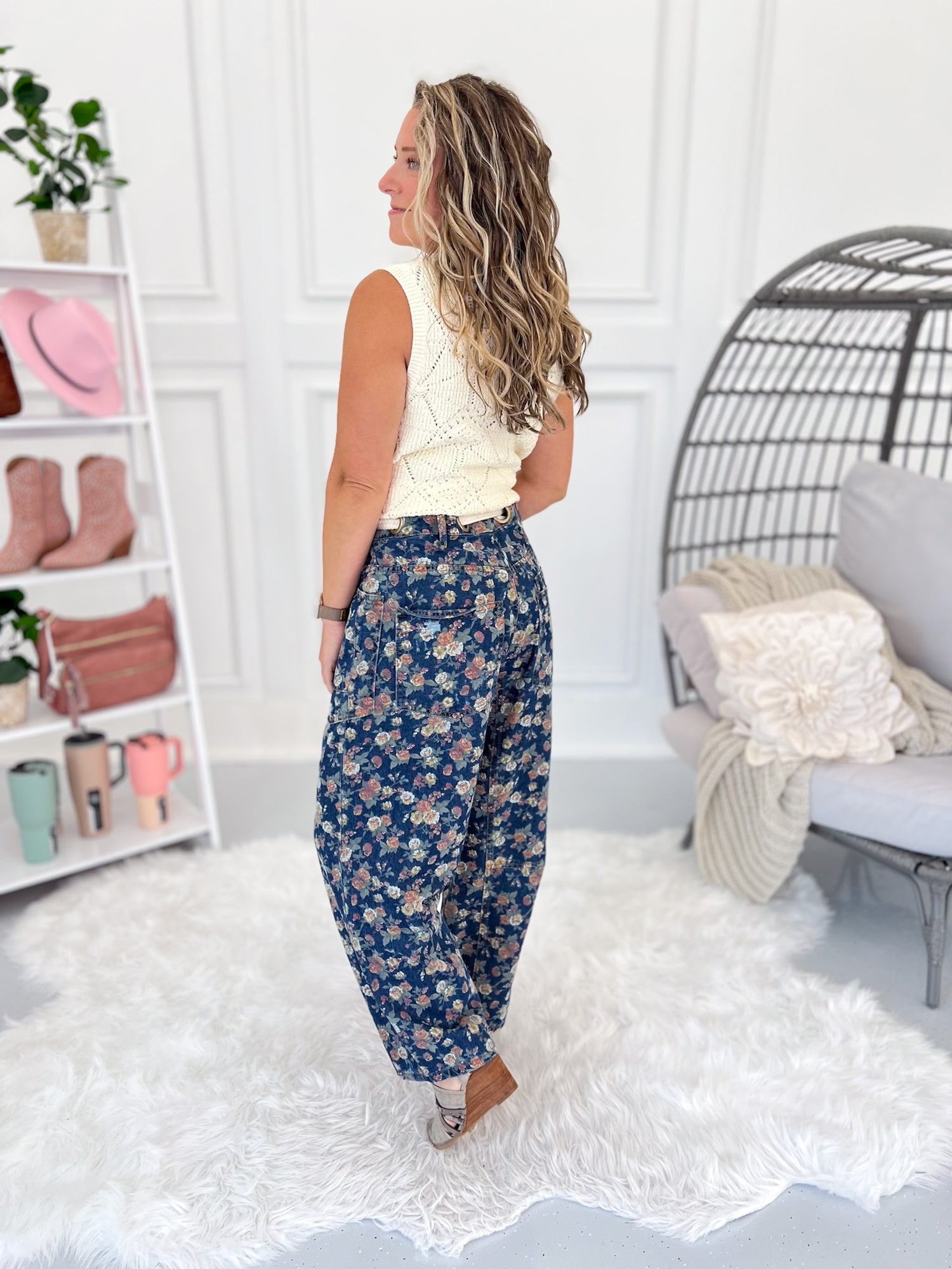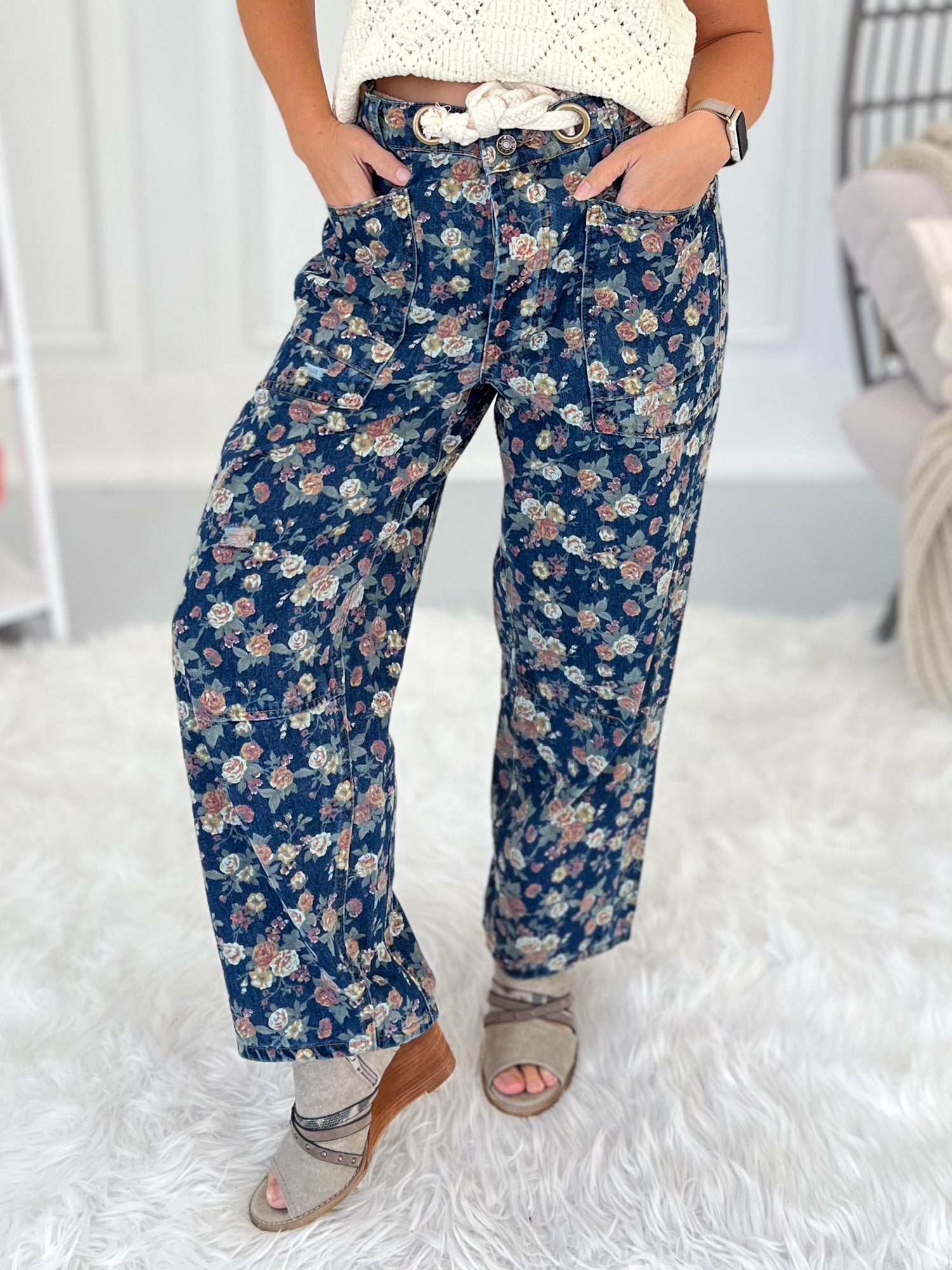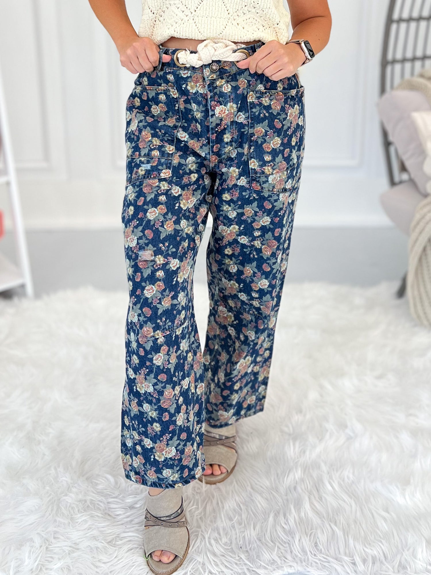 These jeans bring a playful twist with their dainty floral print and subtle barrel shape that’s comfy yet chic. The rope drawstring with grommets adds a laid-back vibe, while deep pockets and flattering seams keep the fit casual and carefree. Perfect for pairing with tanks, sweaters, or a crisp button-up for all-year styling.