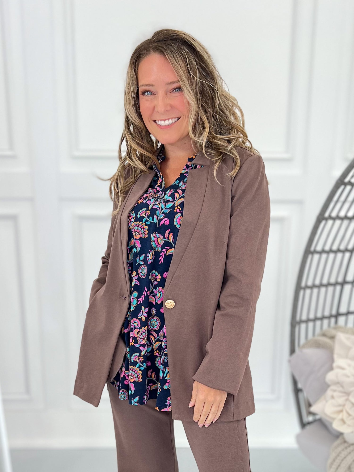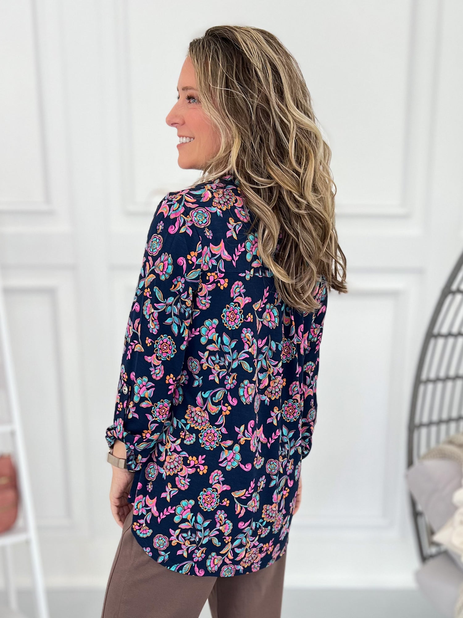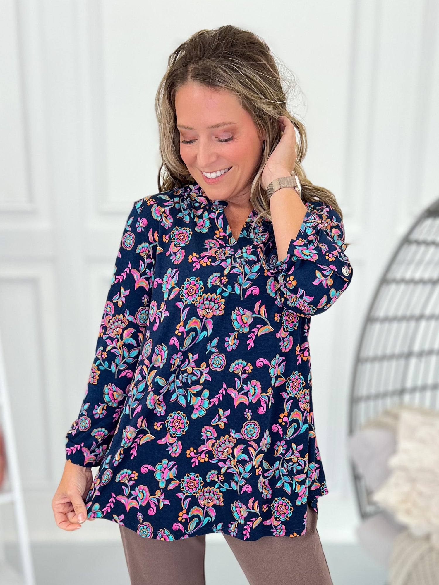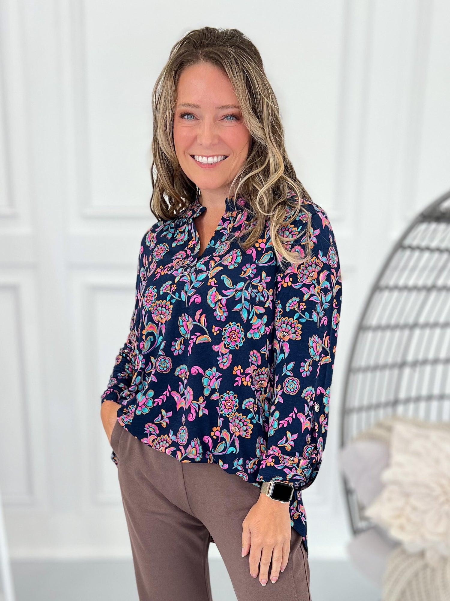 Deep navy meets pops of teal and pink in a floral that works from desk to dinner. This Lizzy layers cleanly under blazers and looks effortless with denim on the weekend. With wrinkle resistant, comfy fabric - you look elevated with no extra fuss!
