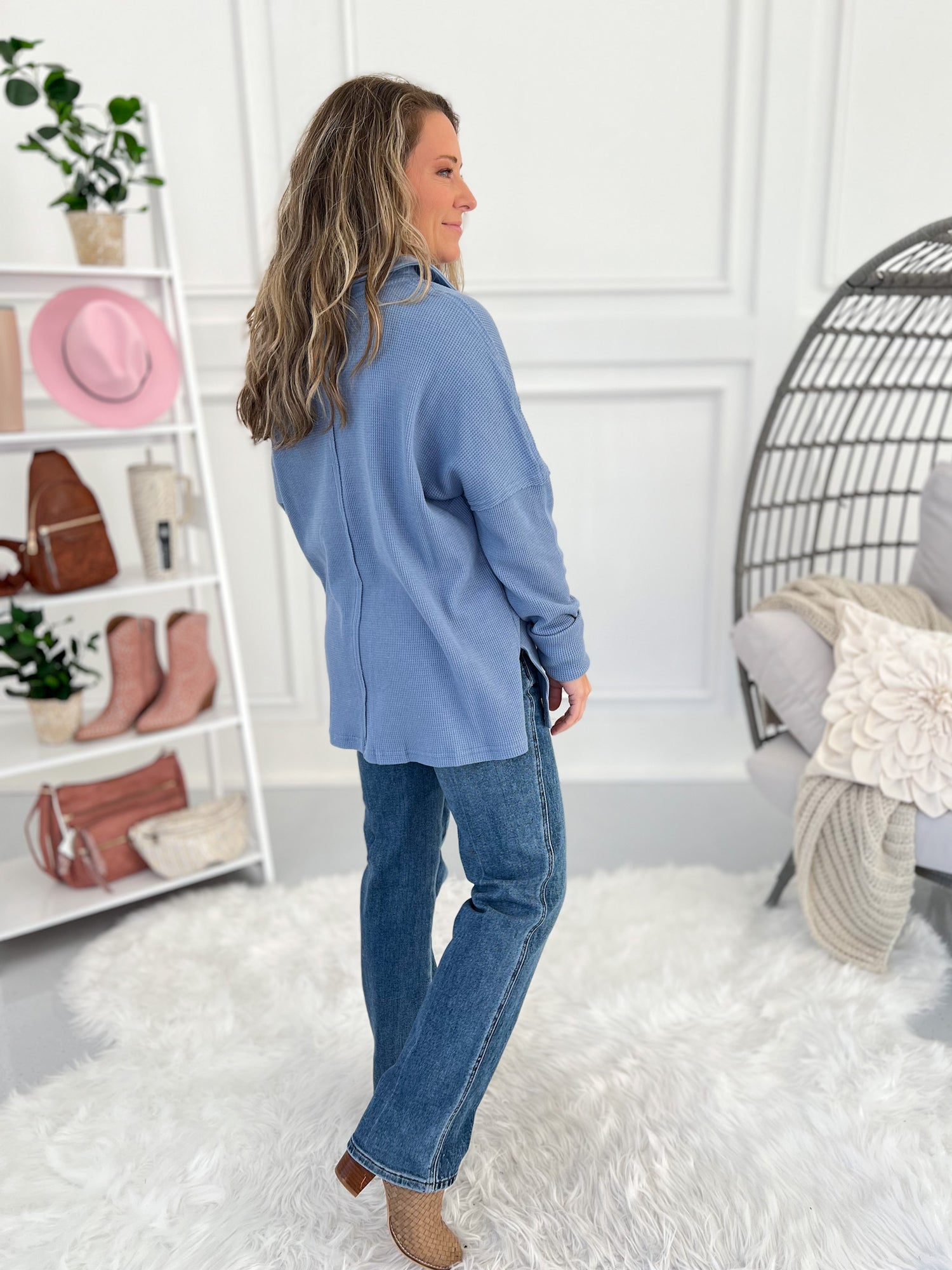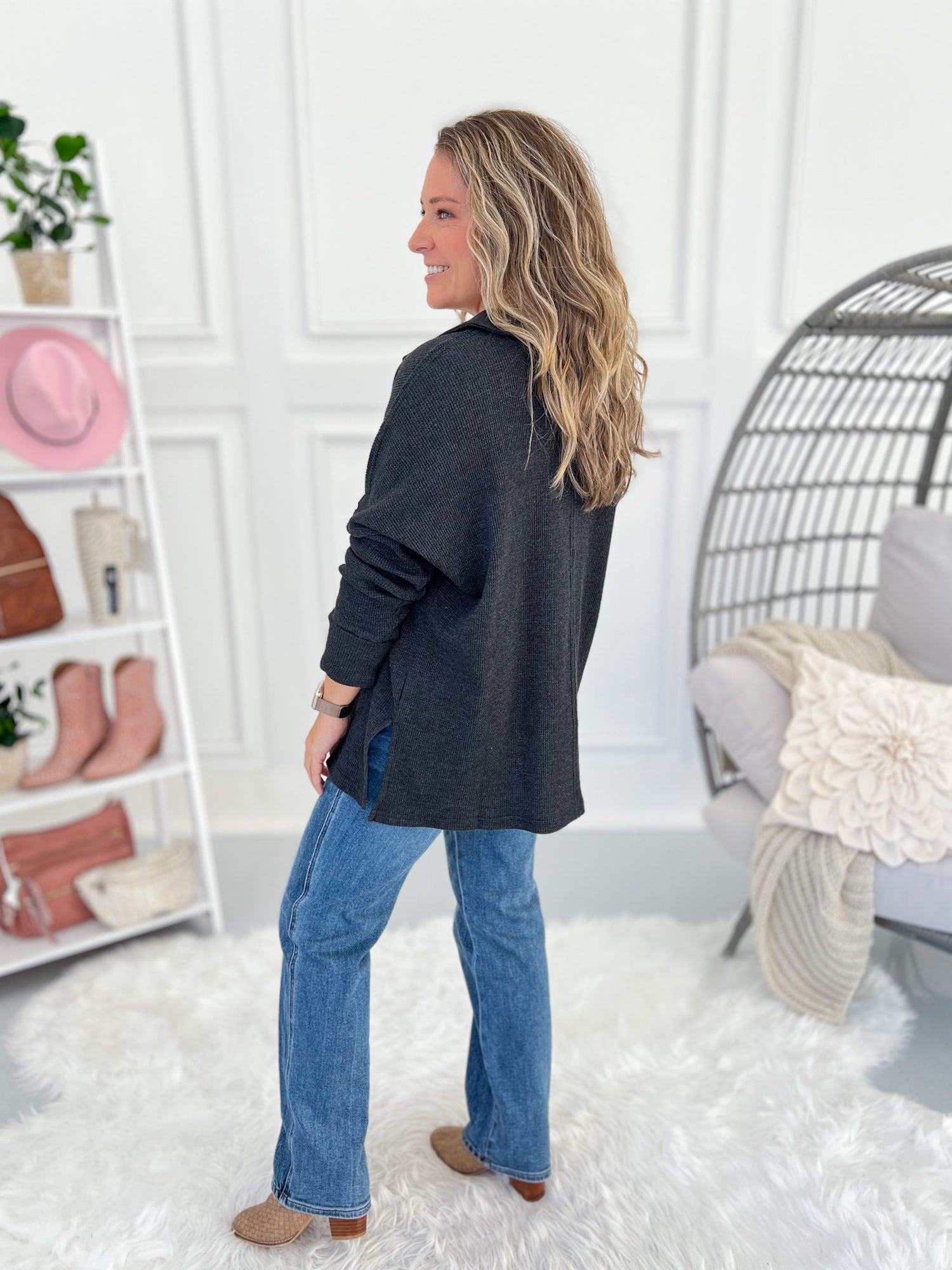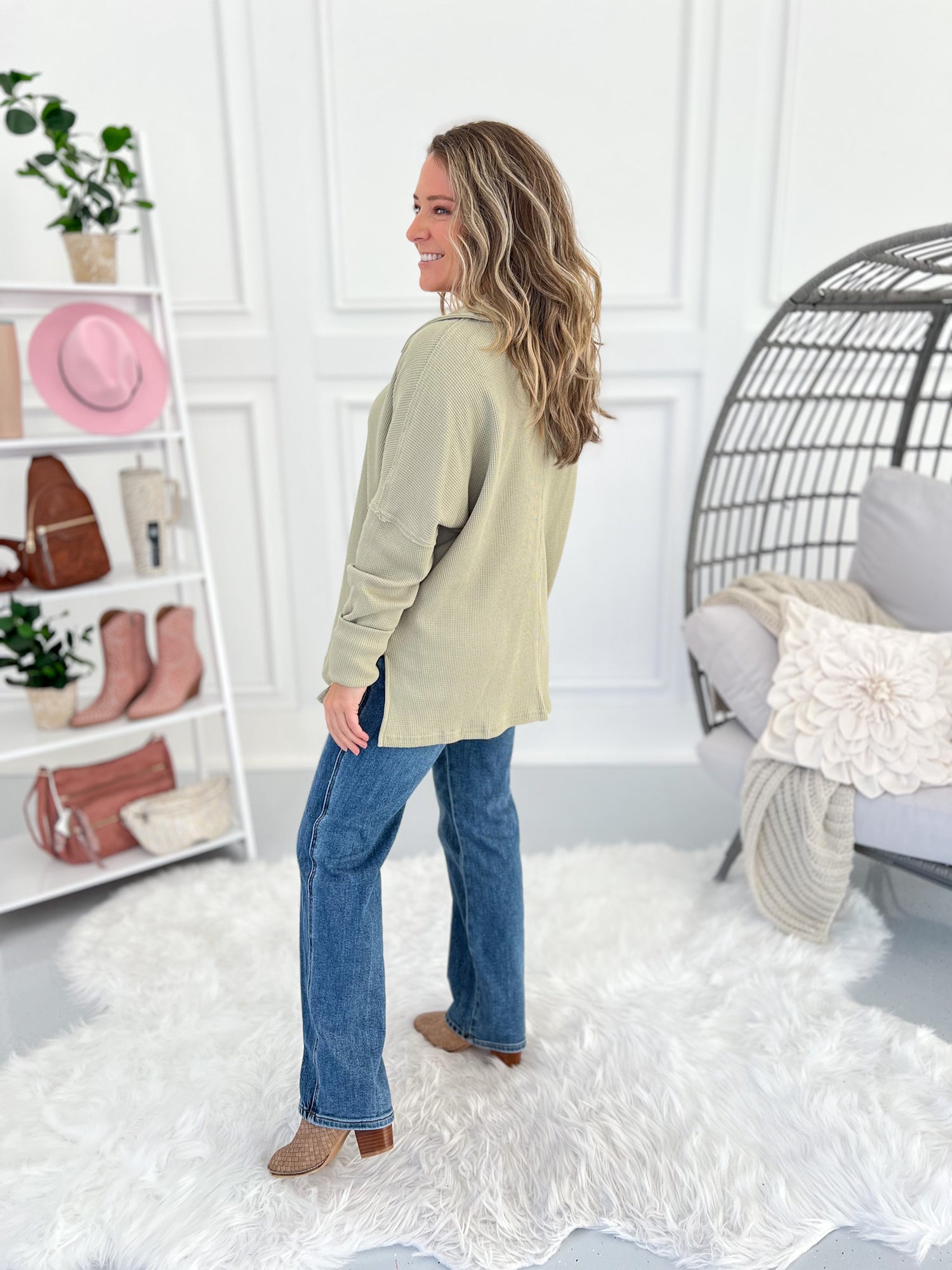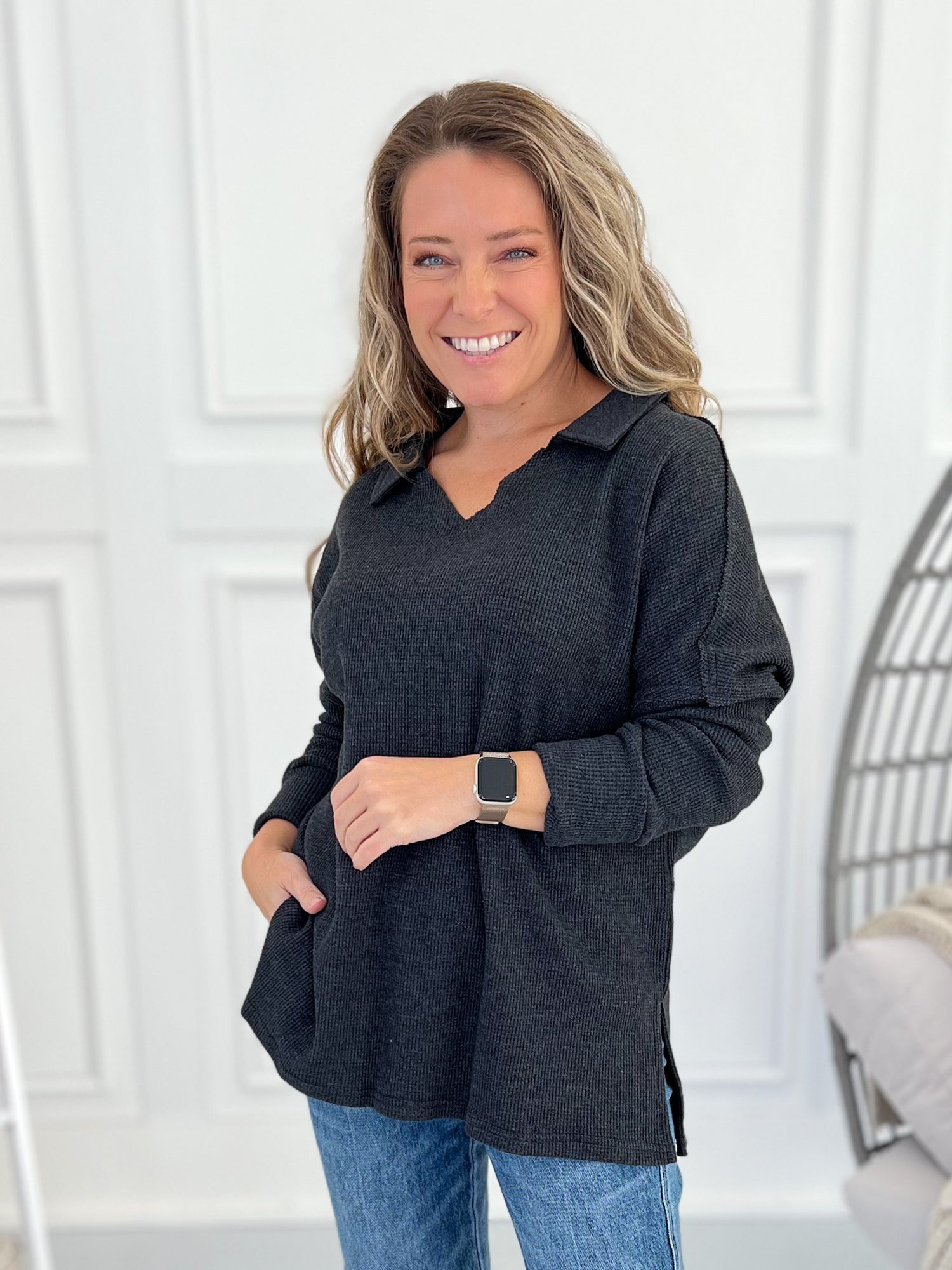 This cozy thermal top is the perfect mix of comfort and casual polish. The soft waffle knit drapes effortlessly, while the split neckline and collared design keep things elevated without the bulk. Finished with long ribbed cuffs, raw edge seams, and a subtle high-low hem — it’s an easy grab-and-go piece that still looks put together with jeans or leggings.