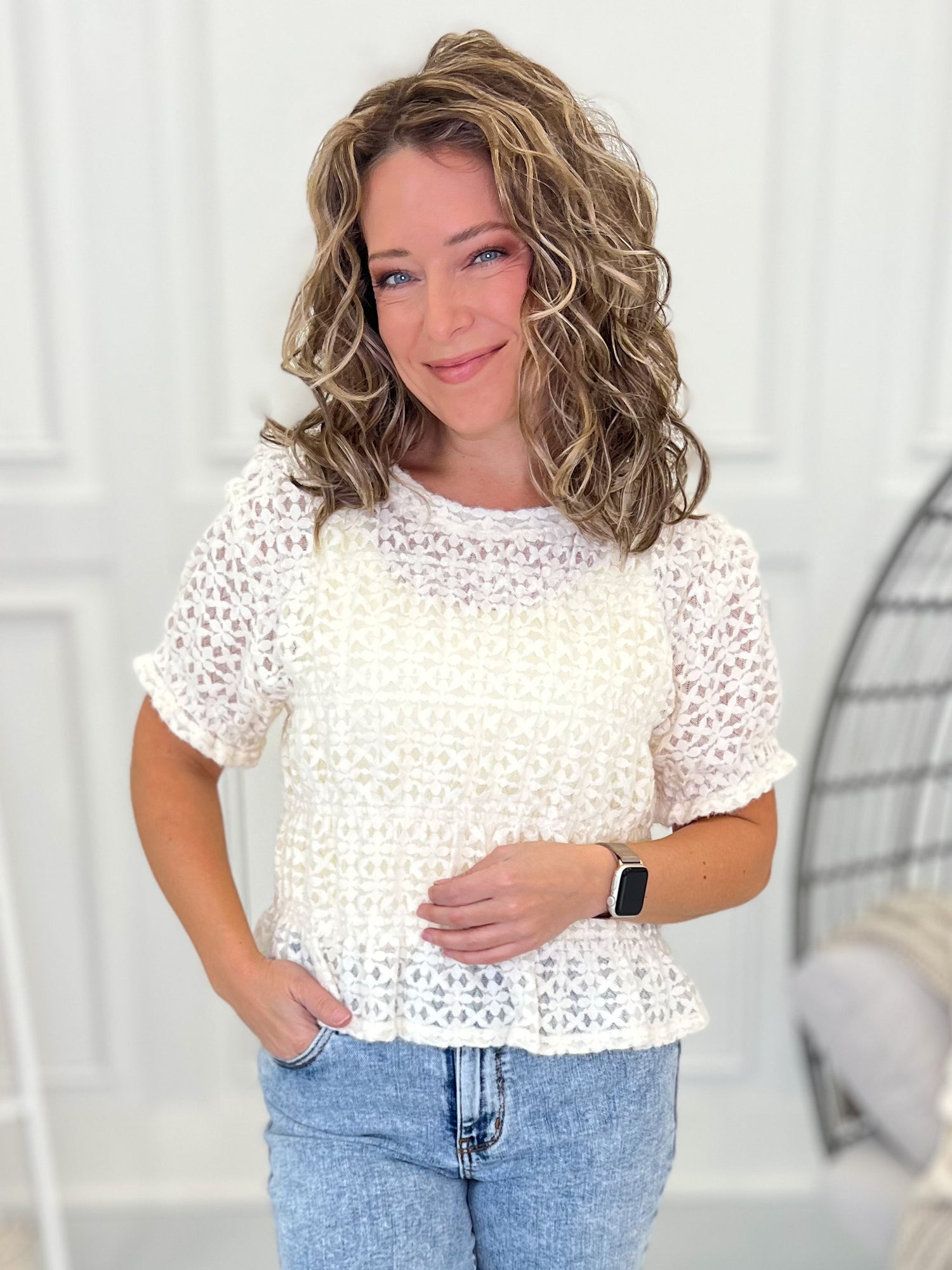 This pretty little peplum is giving all the feminine, flirty energy in the softest fuzzy brushed lace knit. The stretch smocked detailing keeps it comfy and flattering, and it looks gorgeous layered over ivory for a seamless look—or over a bold color for a fun pop. Pair it with denim, dress pants, or under a jacket for the cutest styling.