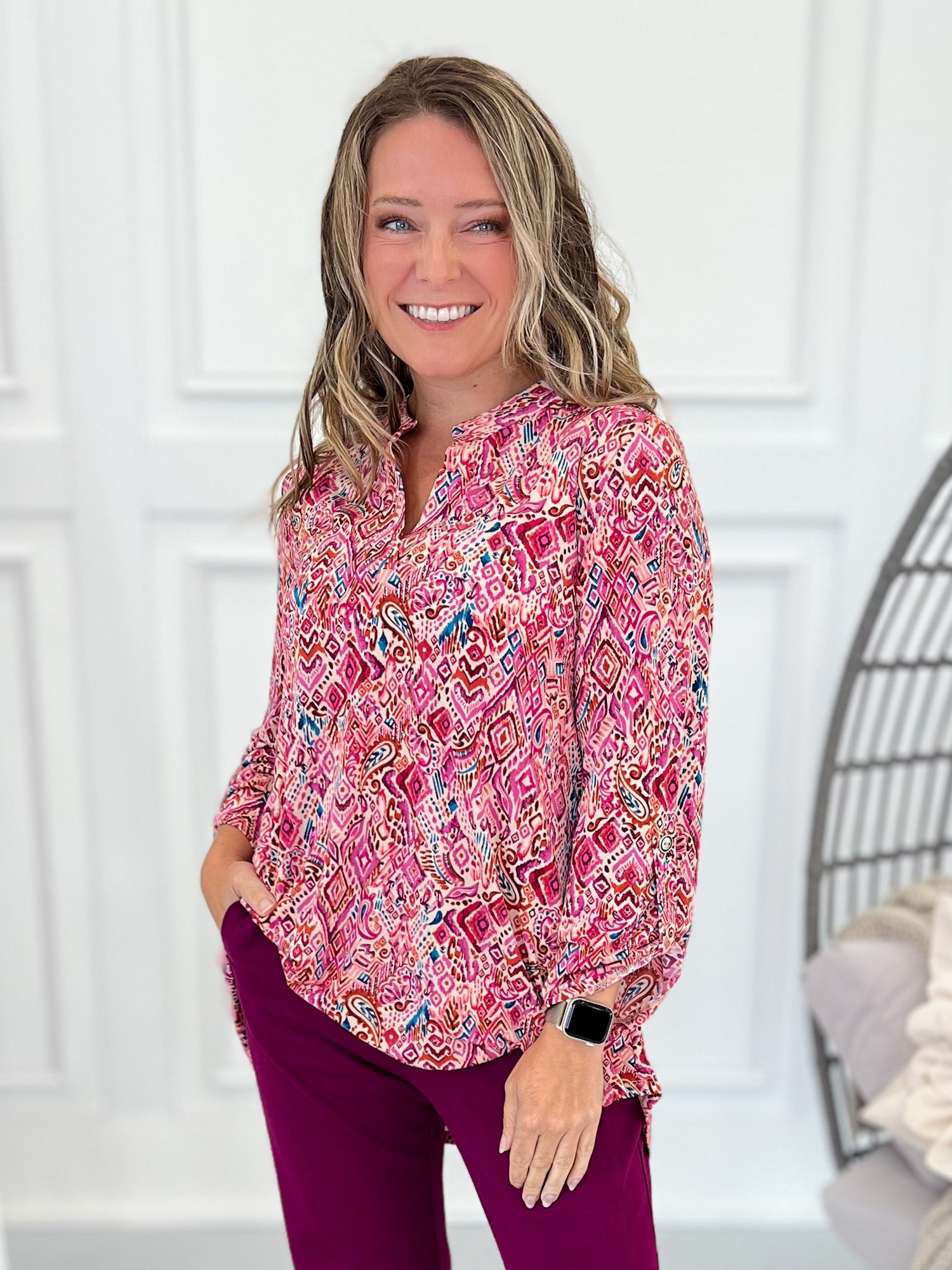 Pretty in pink with a playful geometric twist, this Lizzy top is equal parts chic and comfortable. It’s a customer-loved silhouette with fabric that stays polished all day long. Dress it up with slacks and heels or keep it casual with denim—either way, it’s a win.