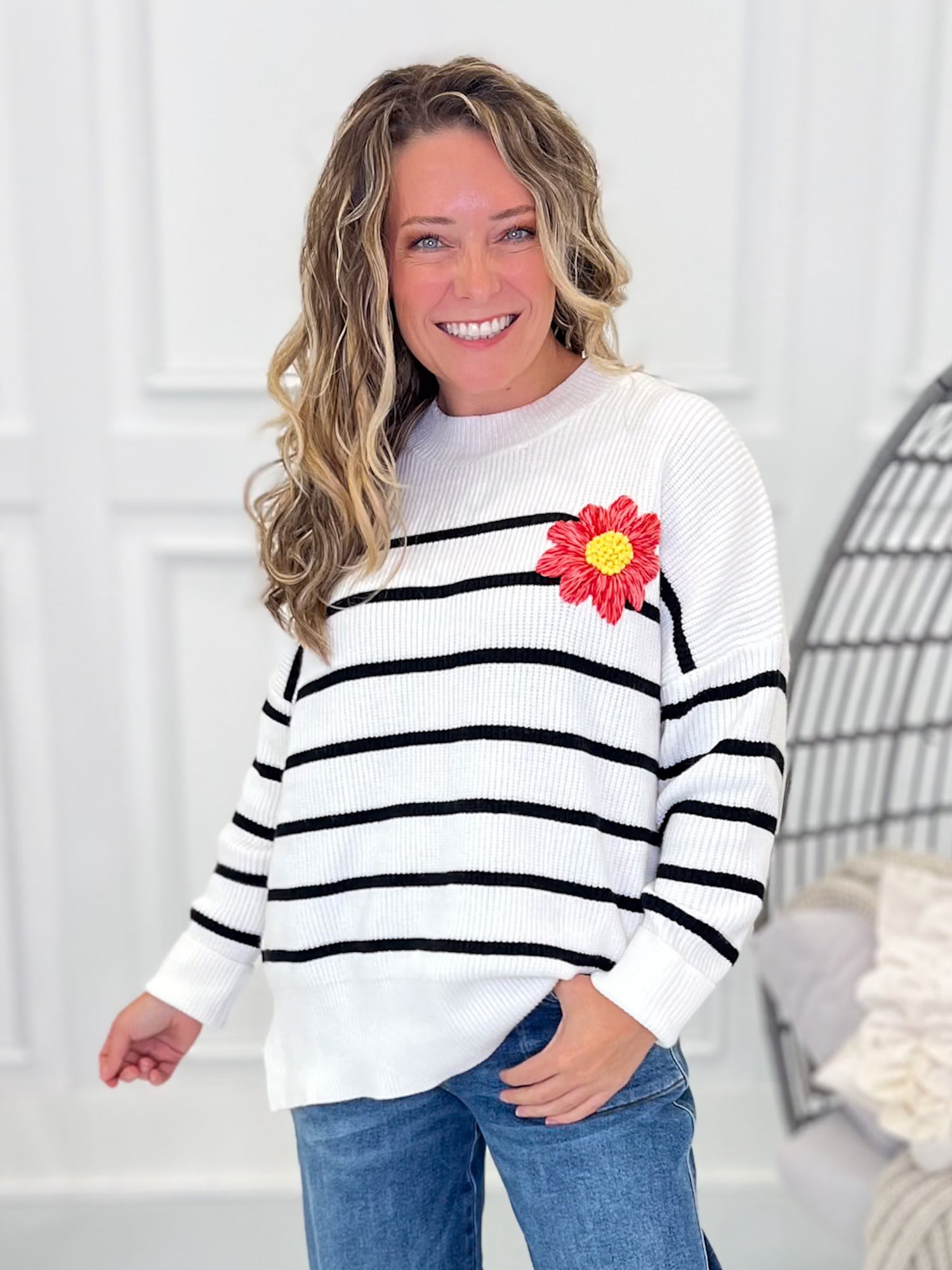 Classic stripes meet a playful twist in this cozy sweater. The stitched floral detail adds the sweetest pop of color, making it a fun upgrade from your everyday knit. Perfect with denim, skirts, or layered over a collared shirt for a chic touch.