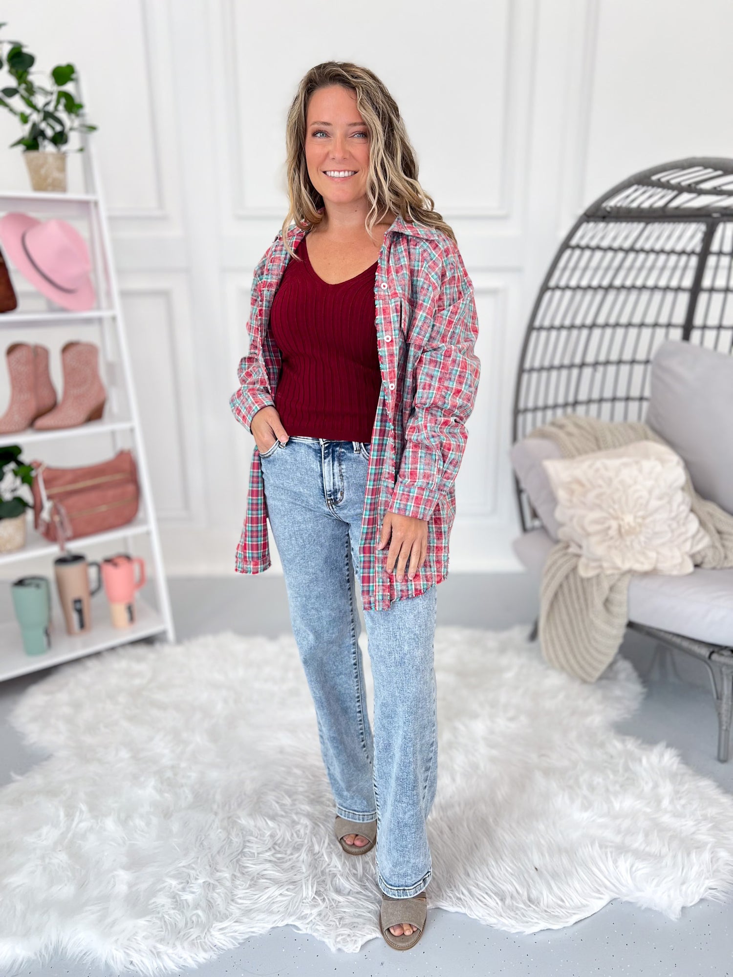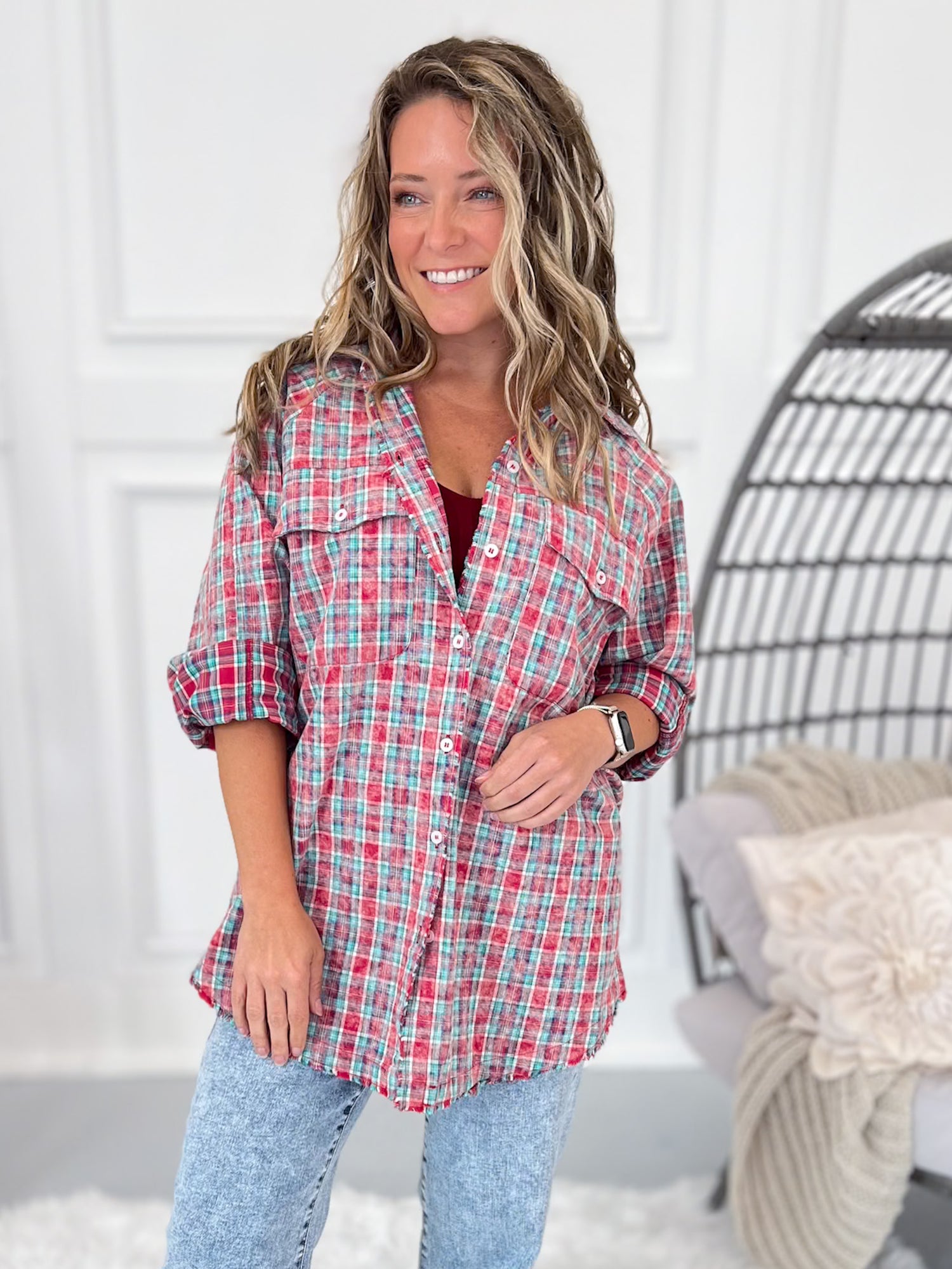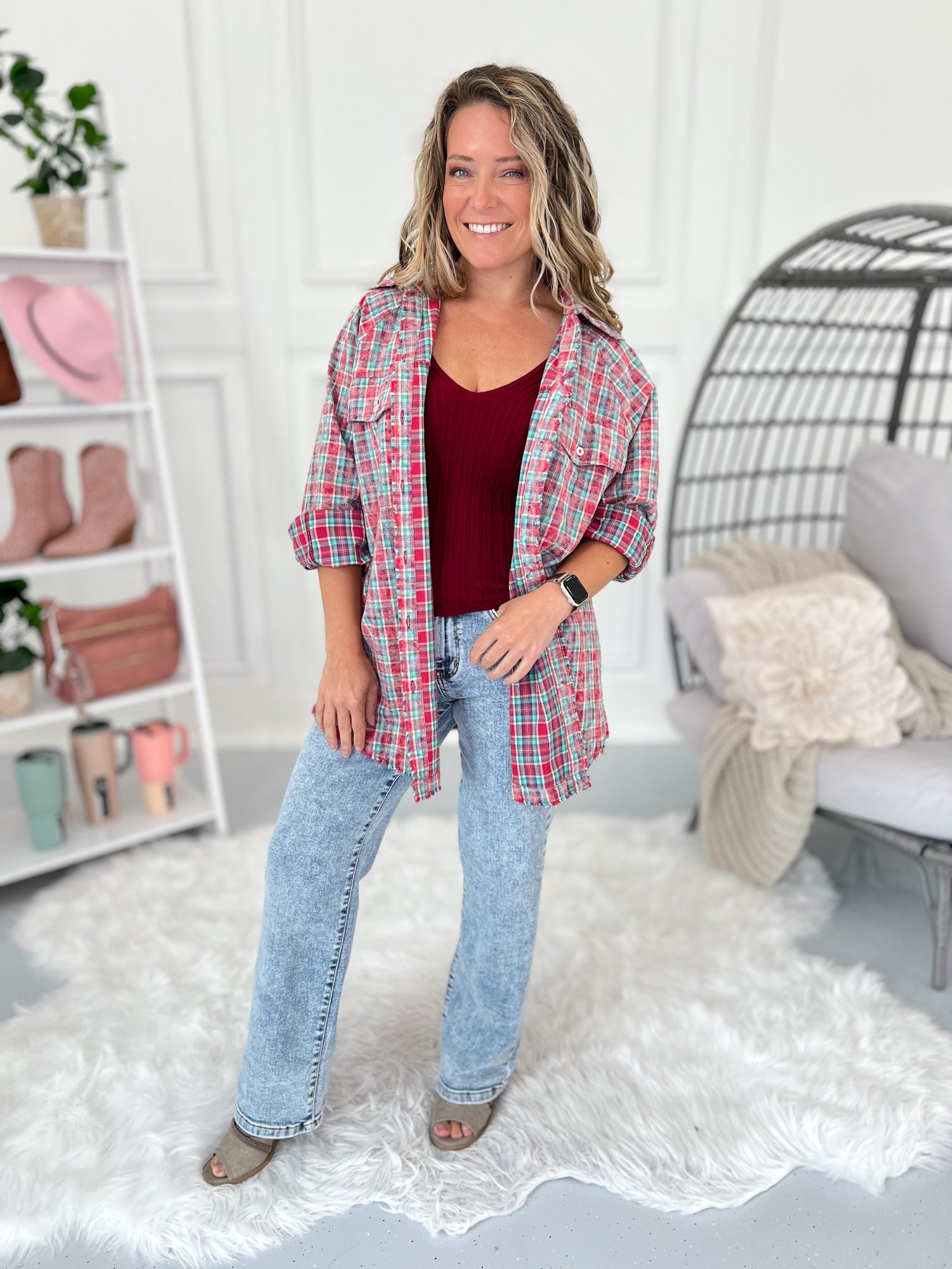 This mineral washed plaid flannel is all about that lived-in, perfectly worn vibe. With its relaxed fit and easy button-up style, it’s the kind of top you’ll throw on for everything from running errands to cozy nights by the fire. Layer it over your favorite tee or tank, or wear it solo for an effortlessly cool look.