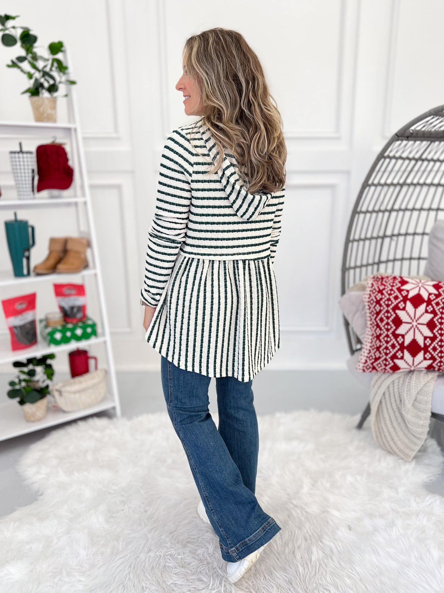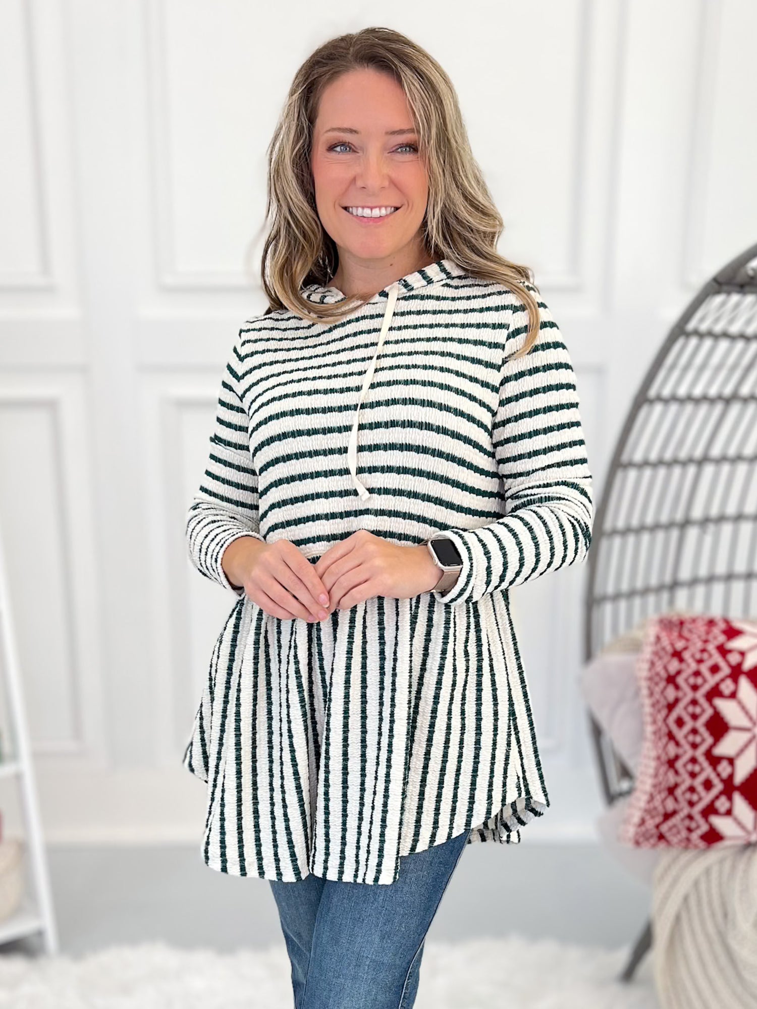 This hoodie is all about cozy comfort with a feminine twist! The babydoll silhouette gives it a flattering, flowy shape while the textured corded knit keeps it soft, stretchy, and stylish. The mix of horizontal and vertical stripes adds the perfect touch of interest. Toss on with jeans or leggings and sneakers for an easy, effortlessly cute look.