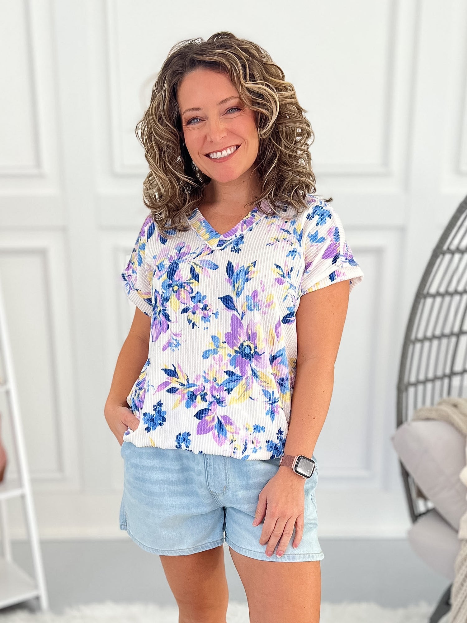 The Visions Top in Floral features a soft corded ribbed knit fabric with a flattering v-neckline and beautiful watercolor floral print. Designed with stretch, breathable comfort, and an easy longer length, this boutique top blends feminine style with everyday wearability.