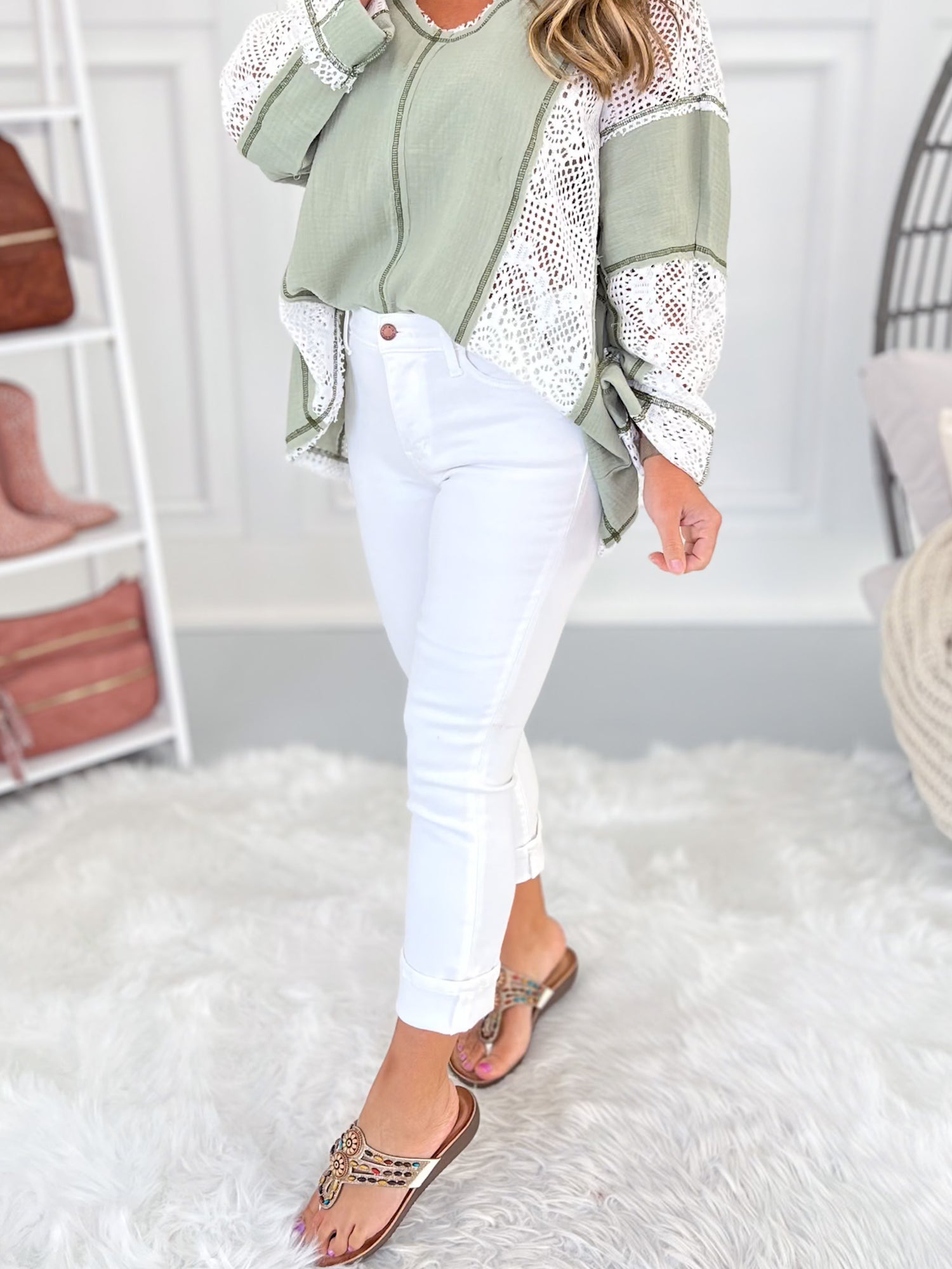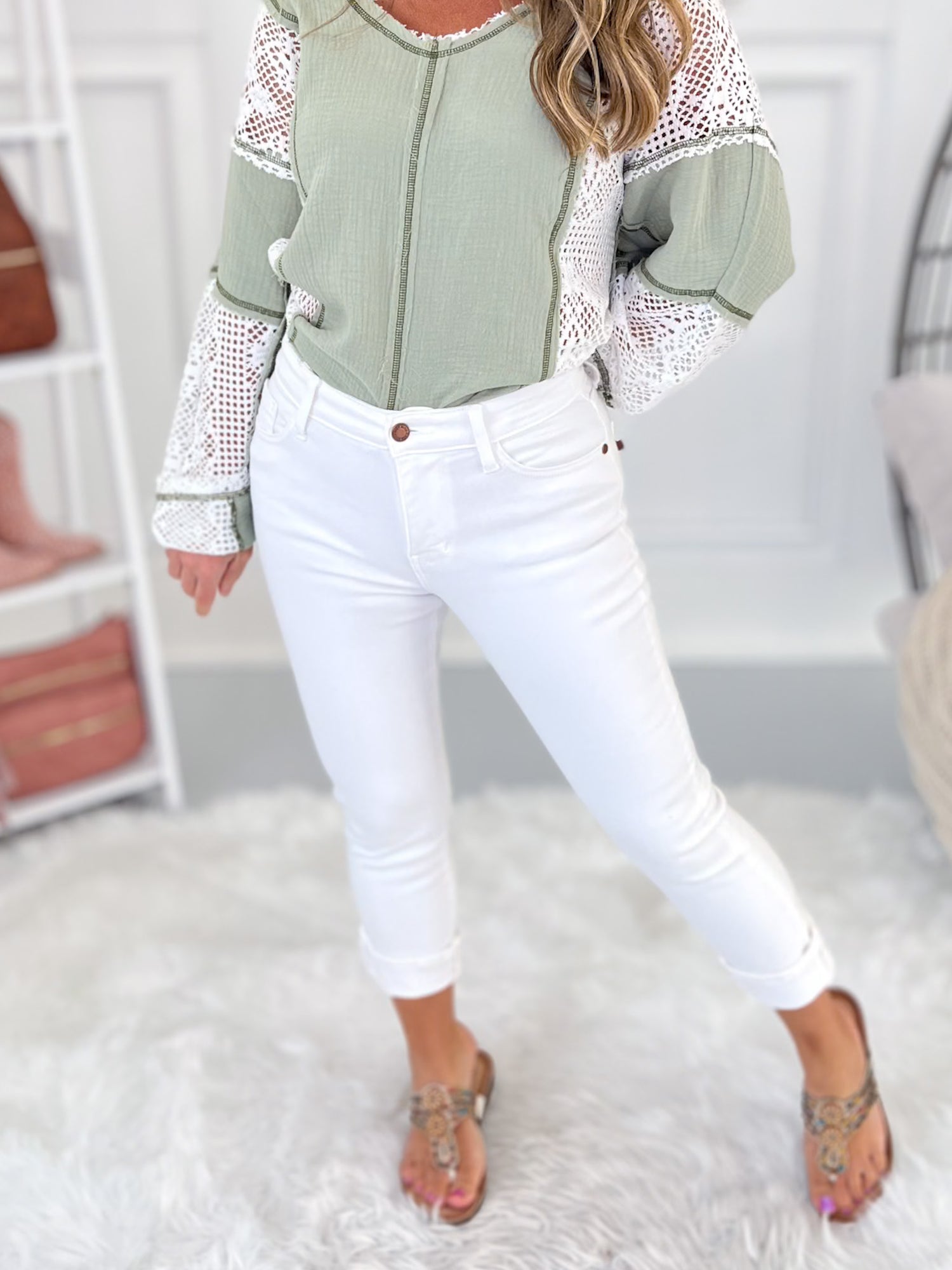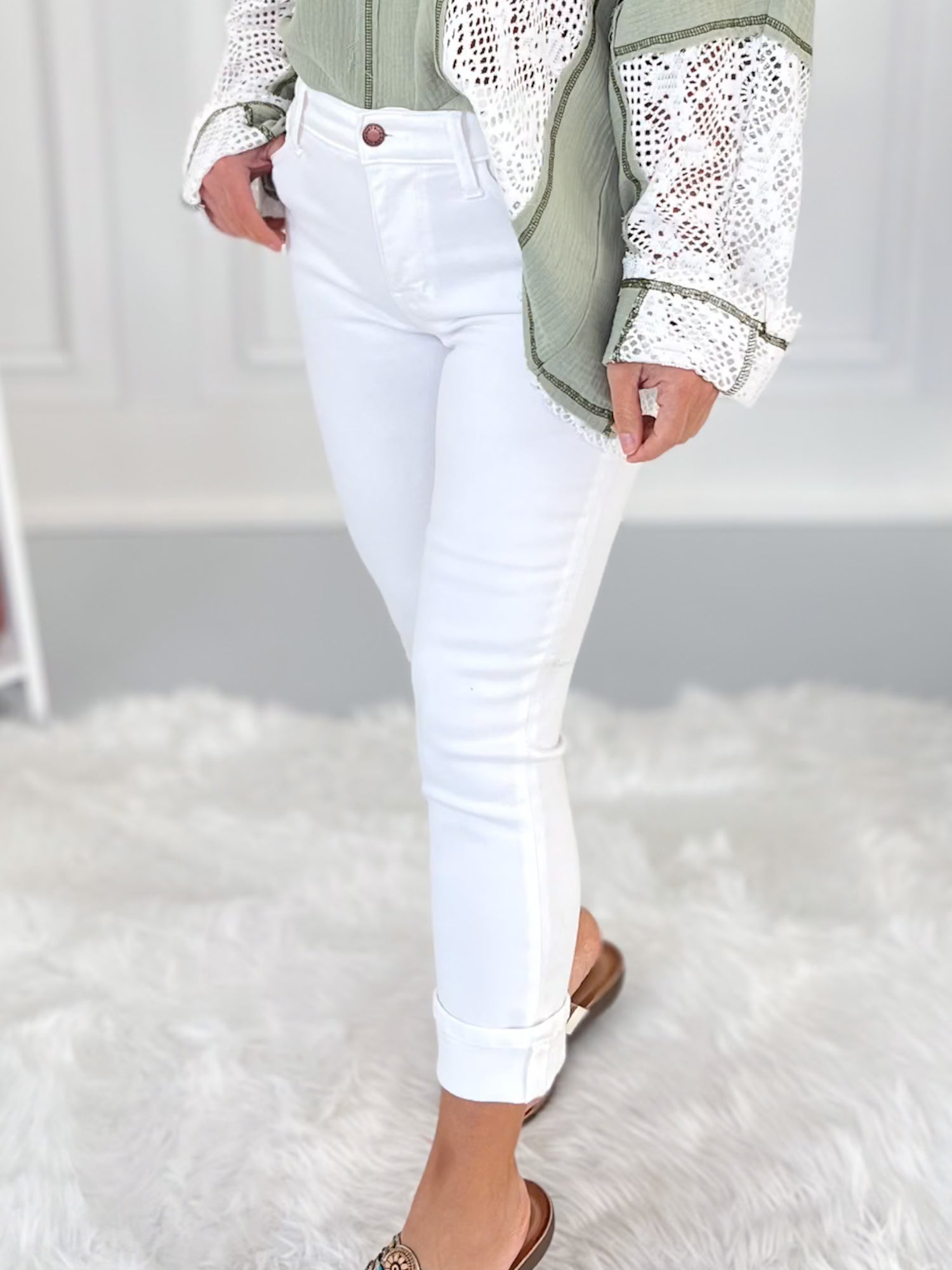 Nobody does white denim like Judy Blue! It's non-sheer, smoothing, stretchy and doesn't show every lump or bump. This pair is extra cute and versatile with a cuff that can be worn down for a dressier vibe. They are sleek and stylish - great for pairing with brights, pastels and everything in between!