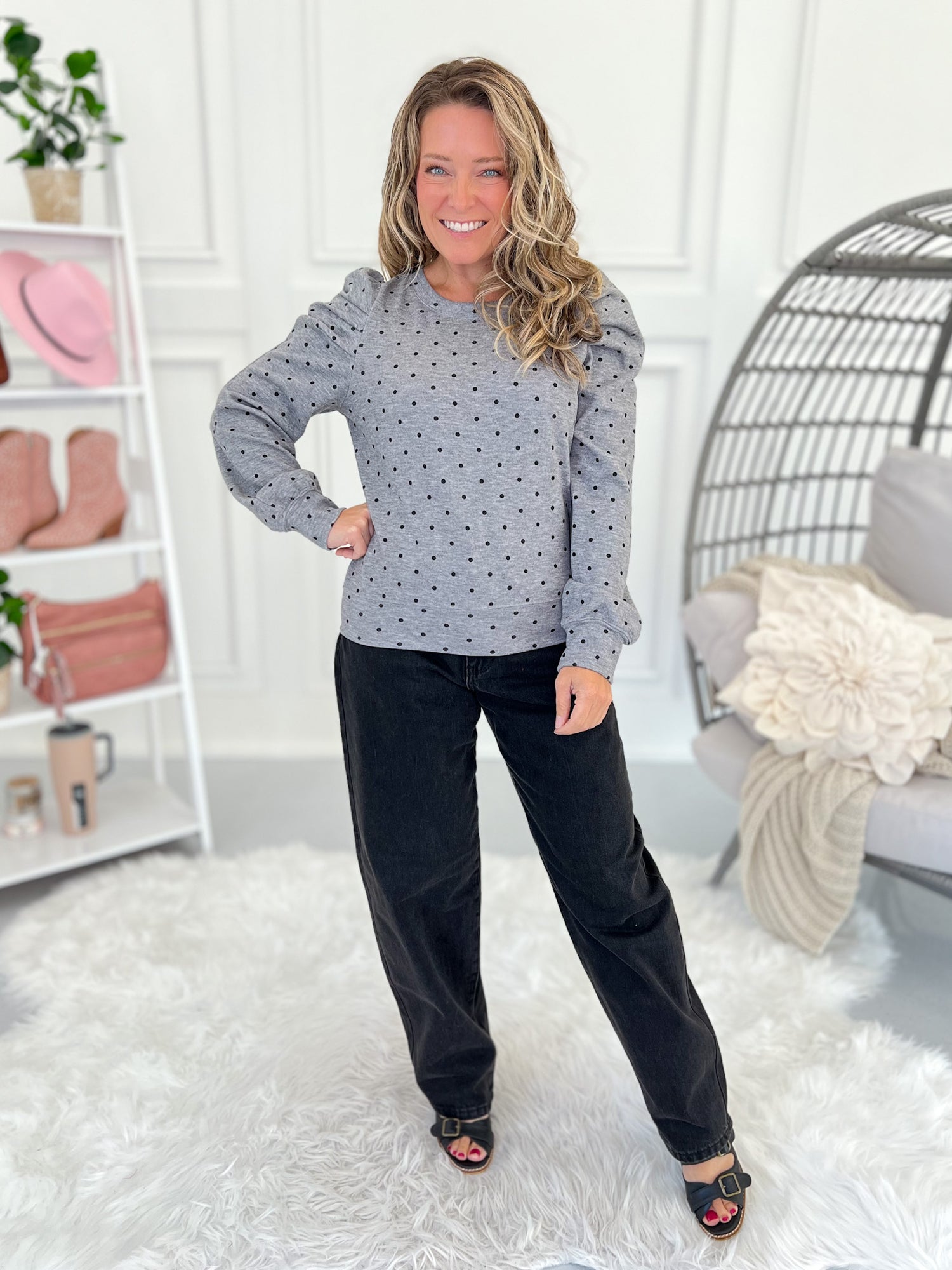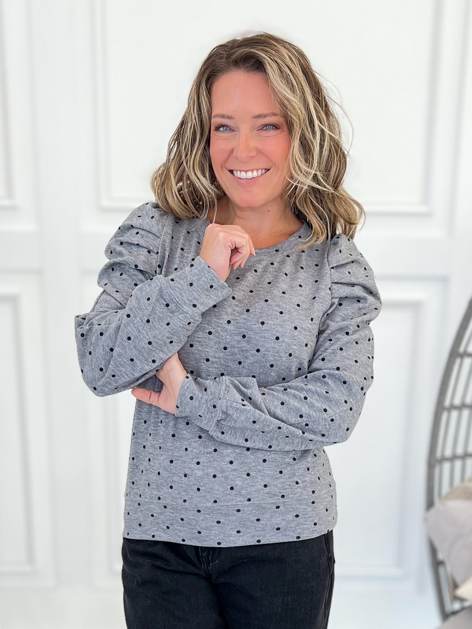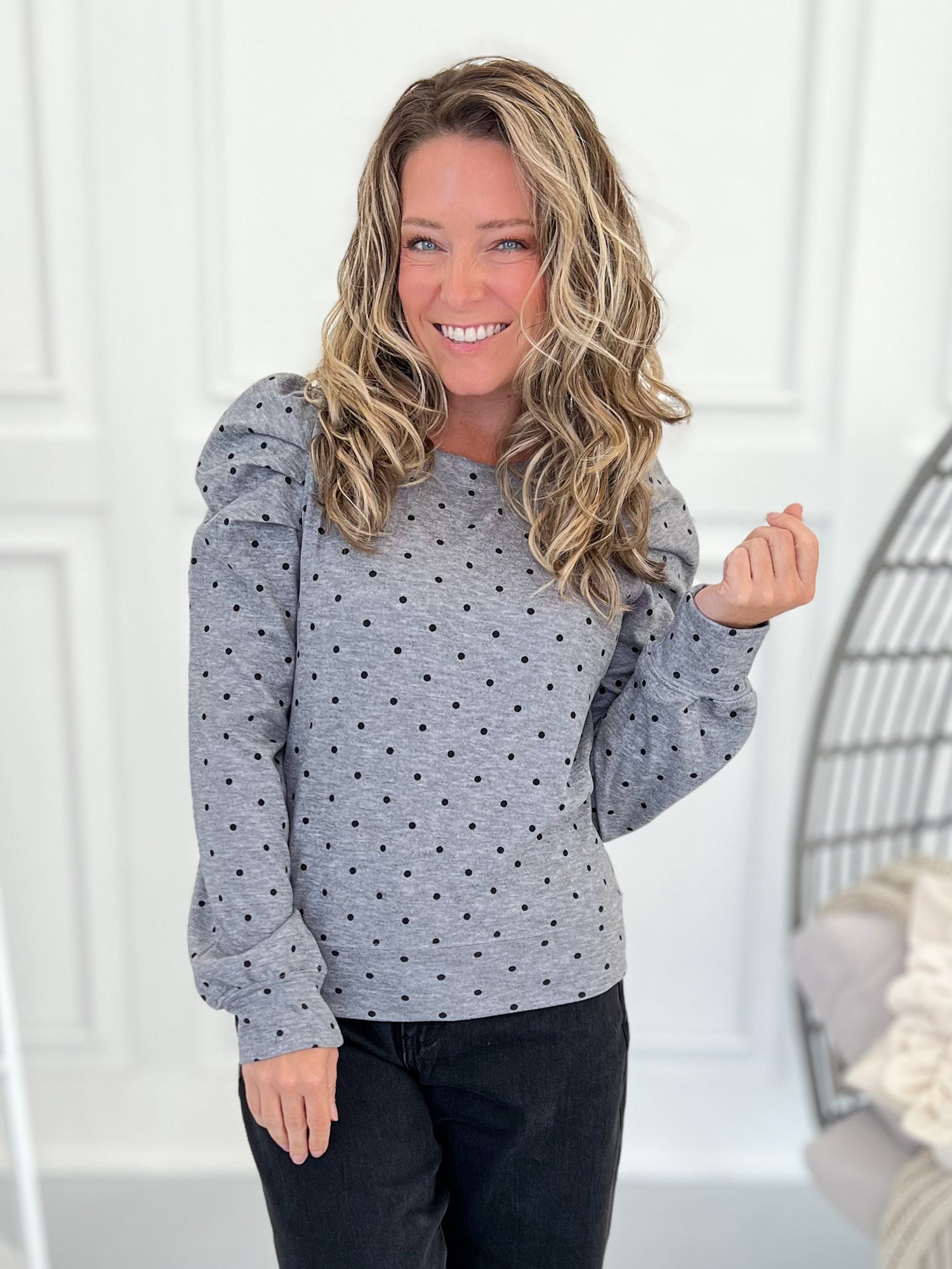Polka dots never go out of style, and this top proves it. Made in a comfy terry fabric that feels casual but looks dressy, it’s the perfect throw-on when you want easy polish. The puffed leg-of-mutton style sleeve adds just the right amount of drama, keeping your outfit chic but effortless. Pair it with denim for everyday or tuck it into trousers for an elevated vibe.