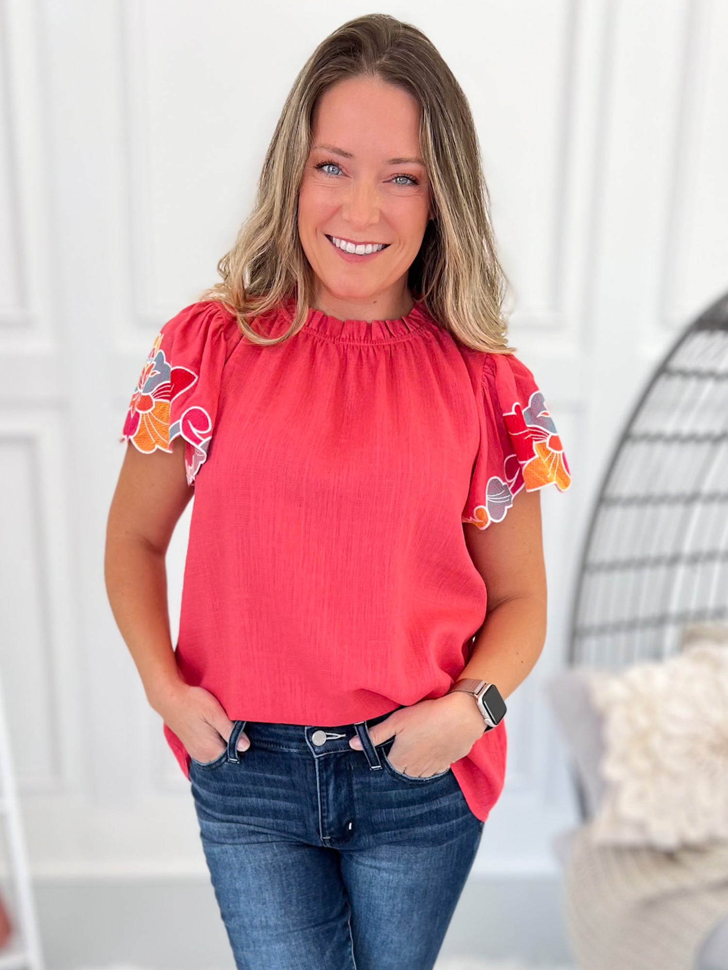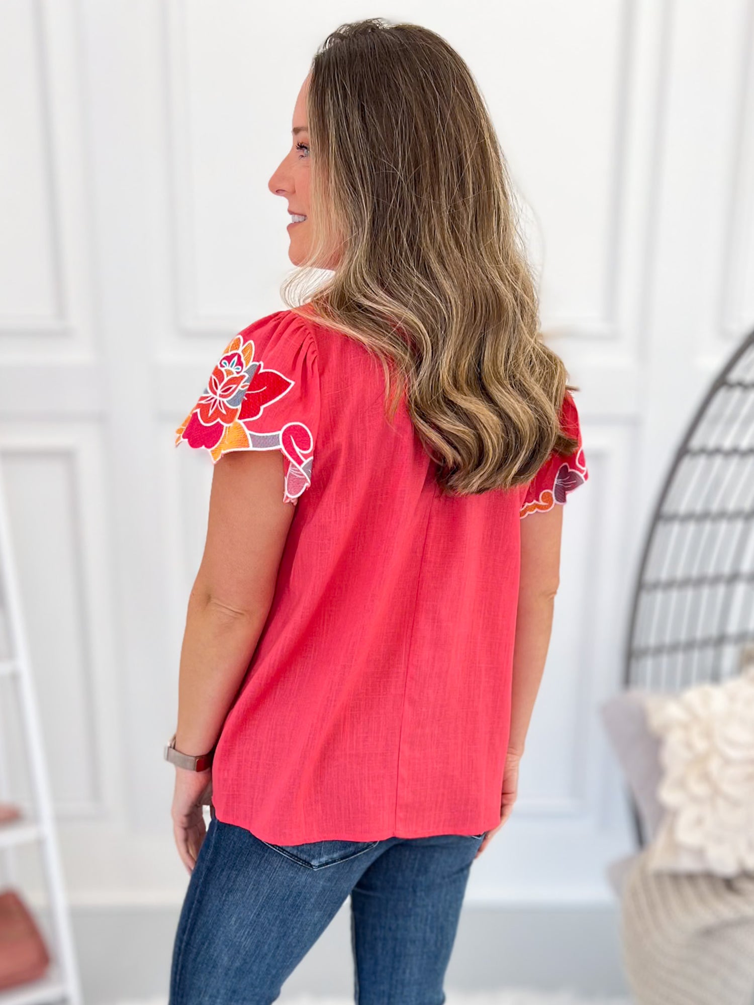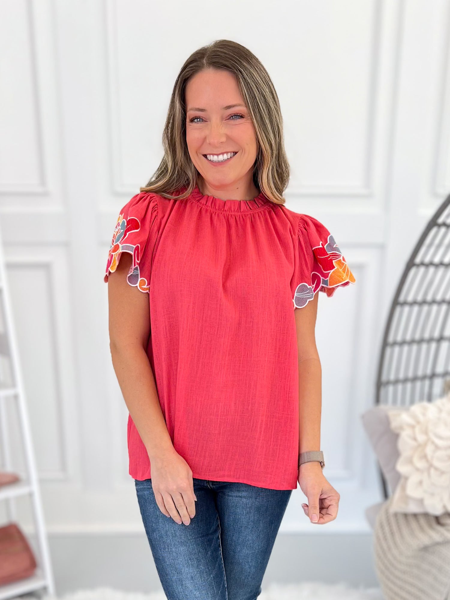- Embroidered Sleeve - With scalloped edging and a fun pop of color