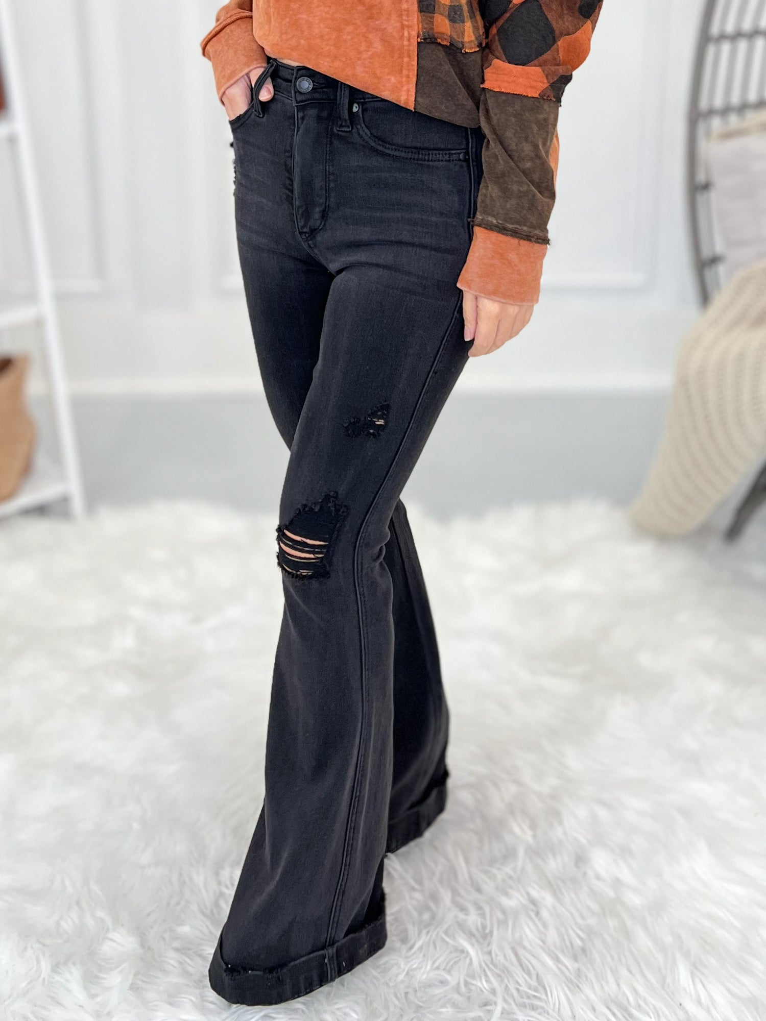 Get ready to rock some serious style with these Judy Blue flares! These flares not only have a gorgeous black wash, but they also rock some edgy distressing and a preppy trouser hem for an updated, on-trend look. You will love the built-in tummy control panel for it's amazing slimming effect that adds a huge boost of confidence to your day. These are super soft and stretchy with max recovery to retain their shape all day long!
