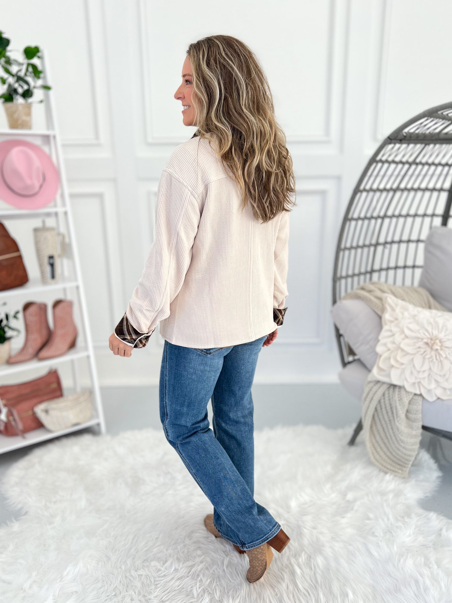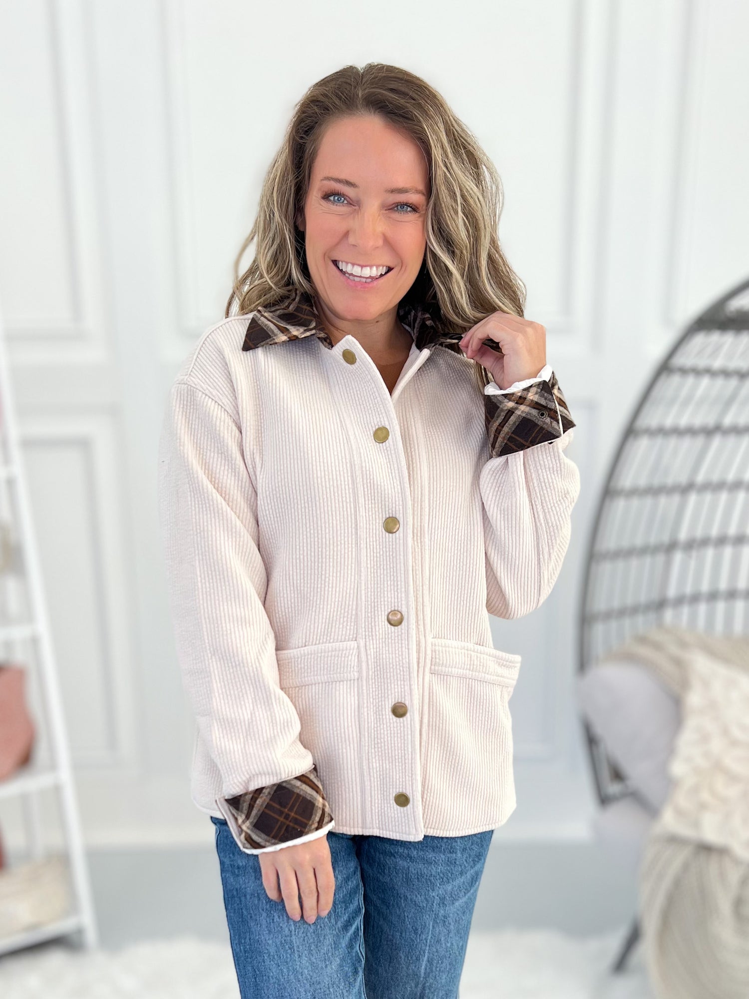 Stay cozy in style with this high-end shacket that looks as good as it feels. Fully lined and insulated for warmth without the bulk, it’s the perfect in-between layer for chilly days. The ribbed knit outer adds texture, while the plaid contrast collar and cuffs give it that polished, boutique finish. Throw it on over your favorite tee and denim for an effortlessly put-together look.